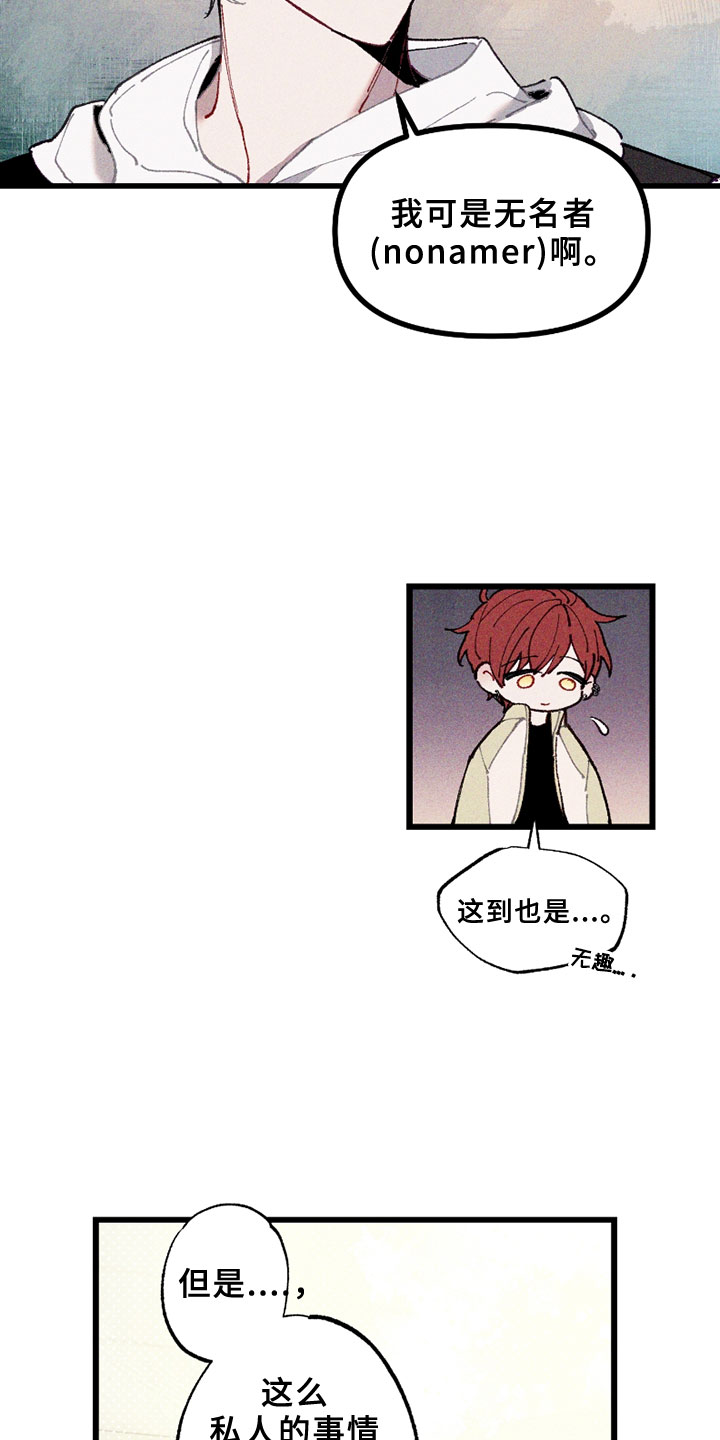 “我怎么会在一个和我不怎么亲近的同学家里表演脱衣秀呢?” 作为一个普通的韩国男孩no namer白翰英,在大学里遇到了名叫柳清玄的Namer。 柳清玄对和自己身上的名字同名的白翰英产生了极大的兴趣,开始跟踪他。 在柳清玄的纠缠下,白翰英为了证明自己是no namer,在柳清玄面脱衣自证,但… “如果能回到过去,我绝对不会再犯傻,做出这种提议。”