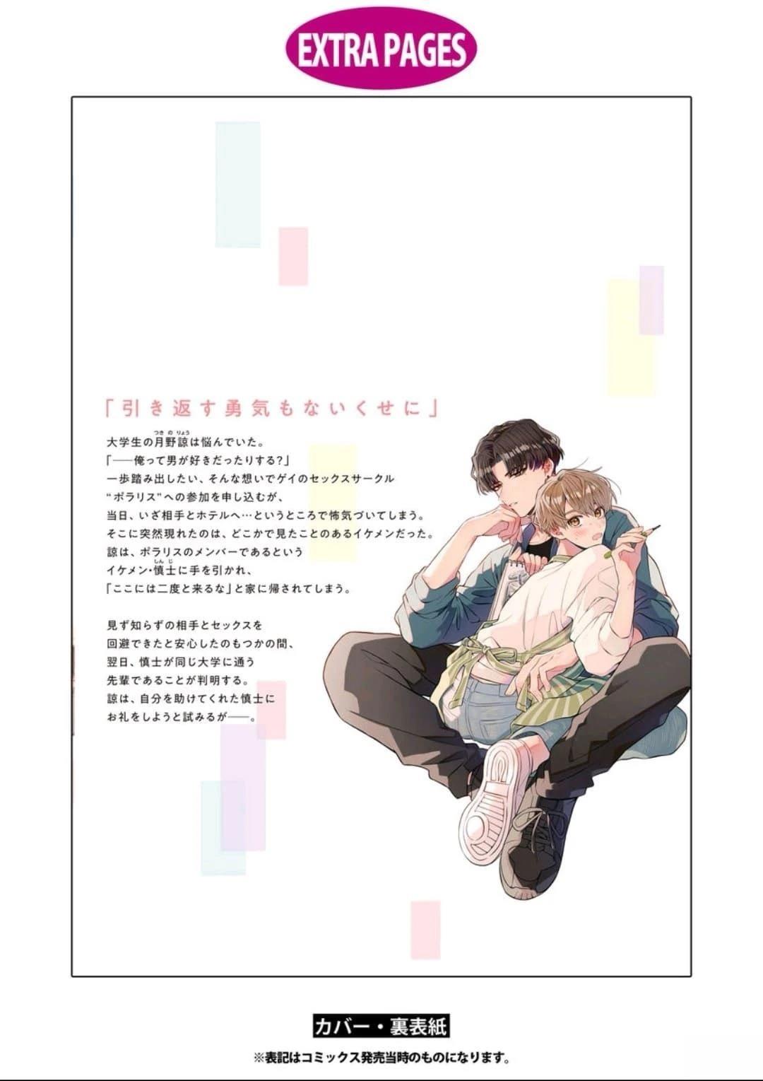 大学生月野谅在烦恼著。「——我是不是喜欢男人?」 因为想踏出第一步,因此申请参加了gay的小组「北极星」,当天,在和对方去酒店时...那一刻却感到了害怕。 突然,感觉在哪里见过的帅哥出现了。 谅被北极星的帅哥成员·慎士警告,「别再来这里了 」然后让他回去了。 在避免了和素不相识的对象做爱于是[]是放心了的转眼间,翌日,弄清了慎士是就读同一间大学的前辈的事实。 谅尝试向帮了自己的慎士道谢——[-折叠]