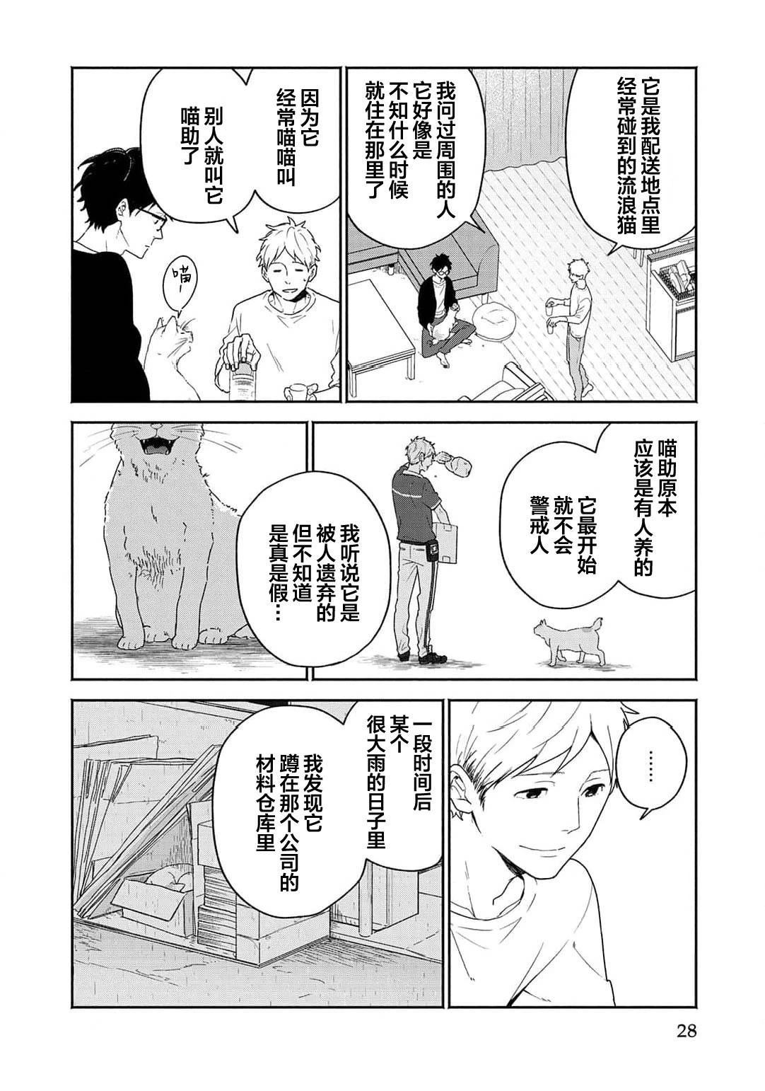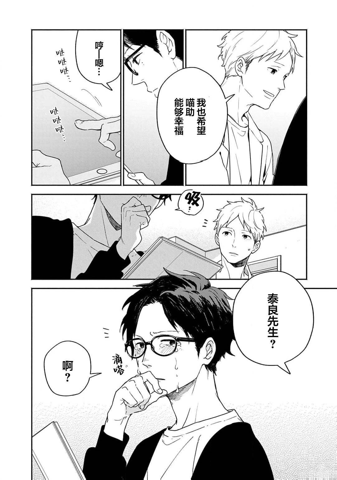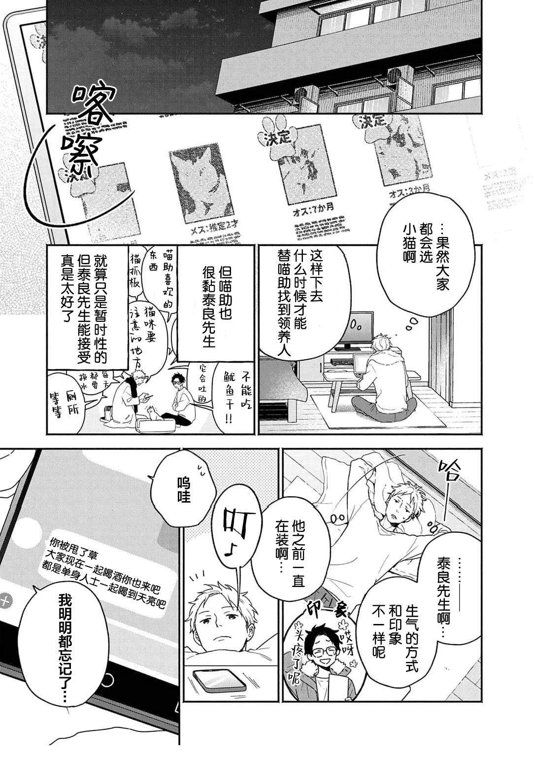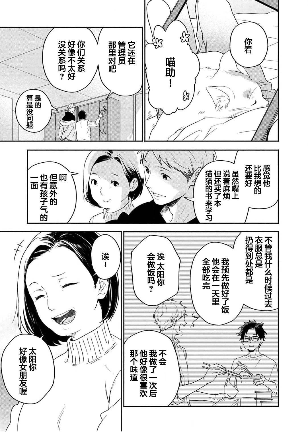 雾山太阳在禁止养宠物的公寓中带回了猫咪猫助,却被管理人泰良旭发现,「希望你能在找到领养人前照顾它」情急之下,以一个月为条件答应了。太阳虽然害怕前不良的旭,但通过喵助两人的交流变深,他亦注意到旭那温柔且魅力的笑容。在那个时候,他知道了旭有个爱慕的人,为了让旭能够保持笑容,于是思考能不能帮助他谈恋爱…?