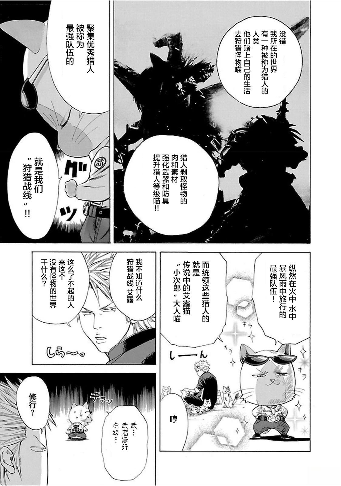因为某件事而不去上学的恶名昭彰不良少年 剑。有一天,遇到了一只奇怪的会说话的猫……!?「武装战线」与「怪物猎人」梦幻联动!!超越时空的热血男儿们的故事!!