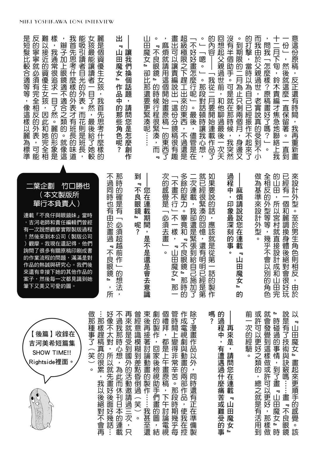 知名作品『不良仔与眼镜妹』、『山田君与7人魔女』的作者吉河美希,自出道以来到现在的所有短篇作品,诸如出道作品『黄金时光』、短篇三作品当中的『东京地狱天堂』、目前的当红作品『杜鹃婚约』等等,还有吉河美希的一万字访谈记录,全部收录在本书当中!吉河美希迷绝对不可错过,出道第十九年的短篇作品集,等著你来掉进[]进吉河漫画世界当中[-折叠]