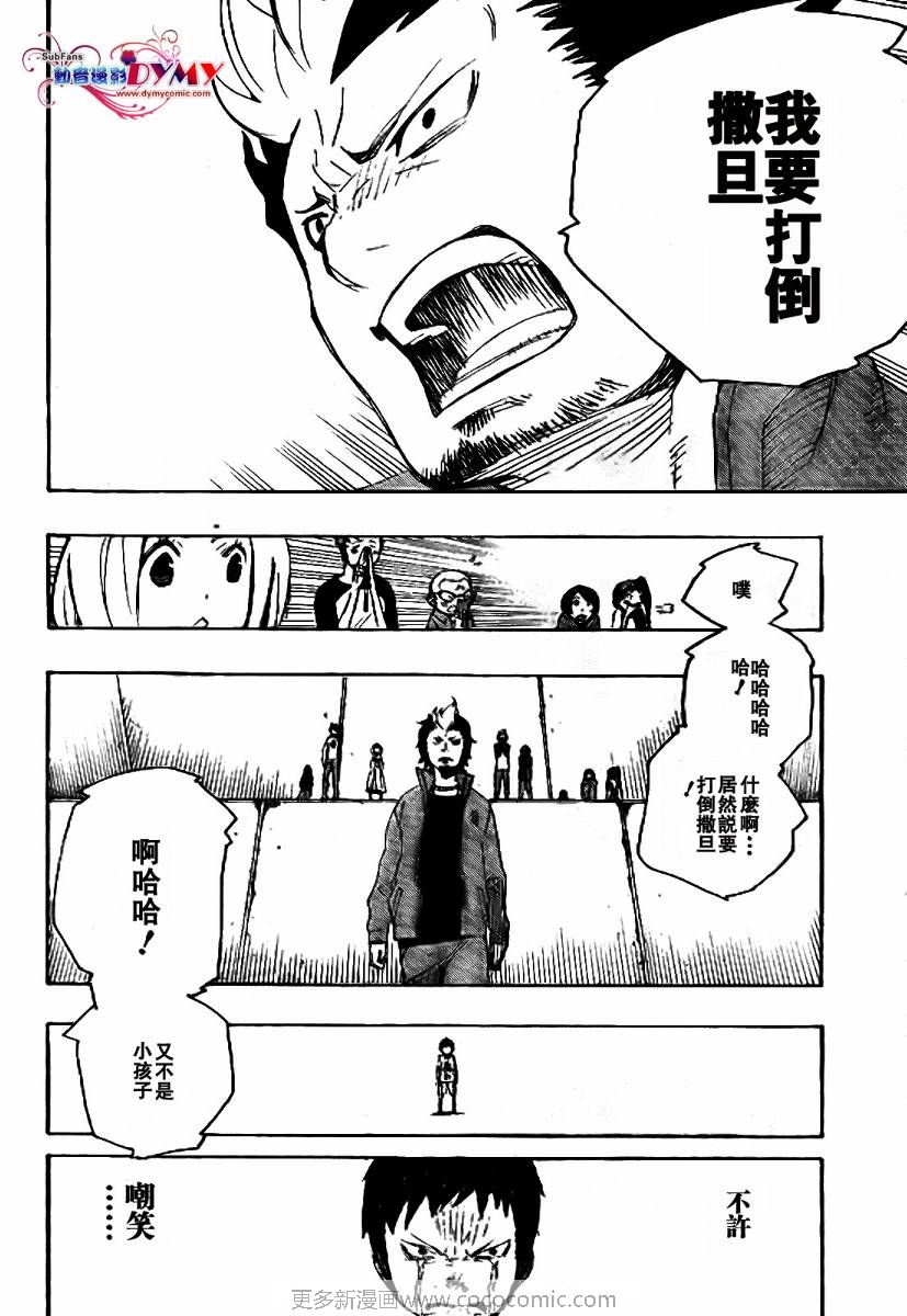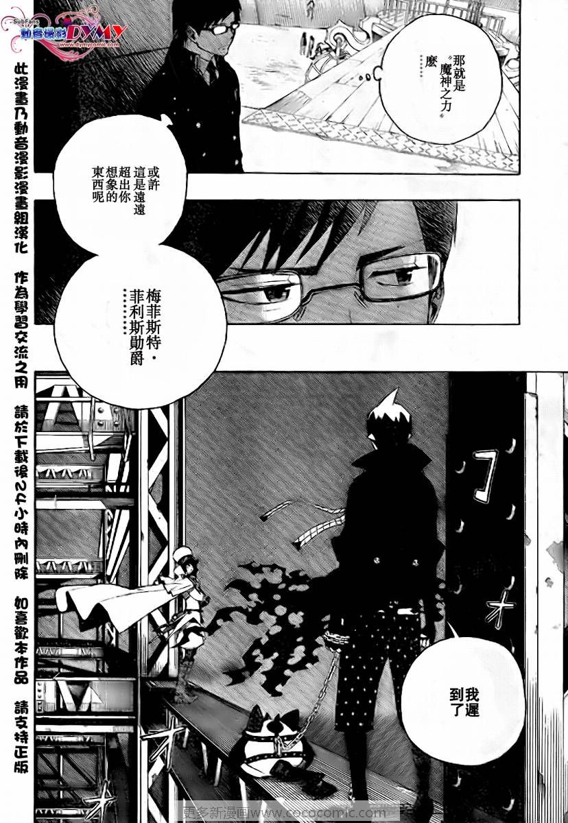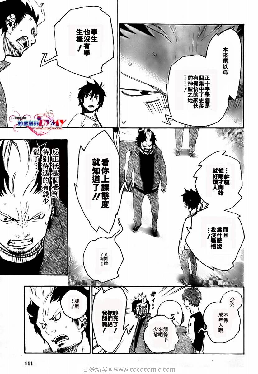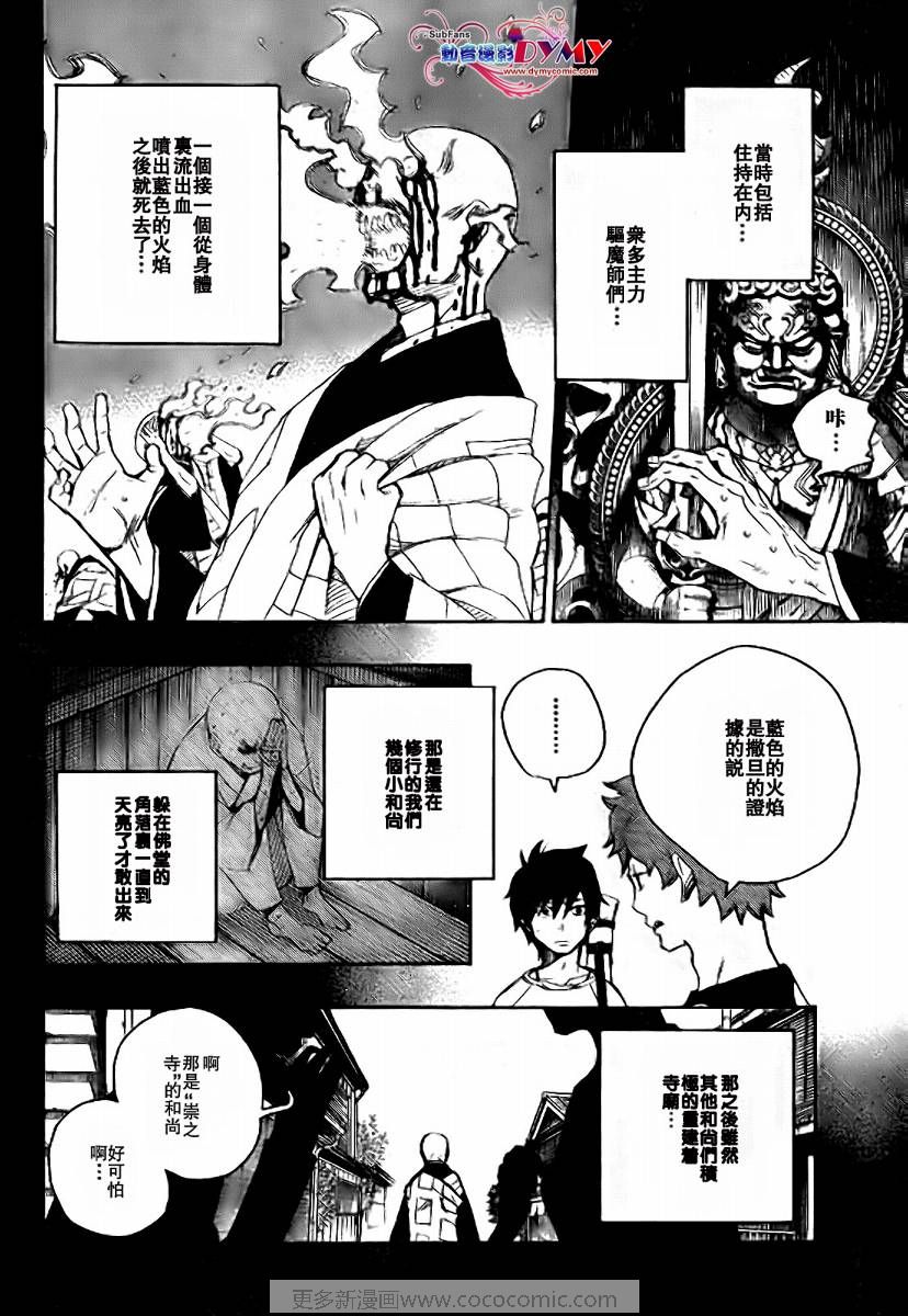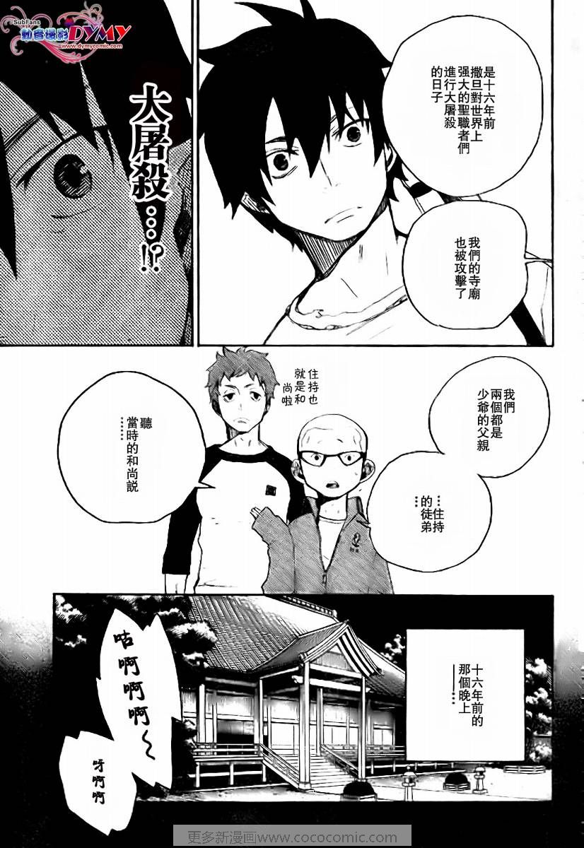 主人公奥村燐,是在正十字学园上学的学生,虽说表面上是炎的后代但是实际上是魔神撒旦的儿子,只能用降魔剣抑制这力量,藤本被撒旦杀死后,就敲正十字骑士団的大门,立志成为除魔师,他的目标是—揍撒旦一顿……于2009年5月号始连载于《Jump Square》(简称Jump SQ、日语:ジャンプスクエア)