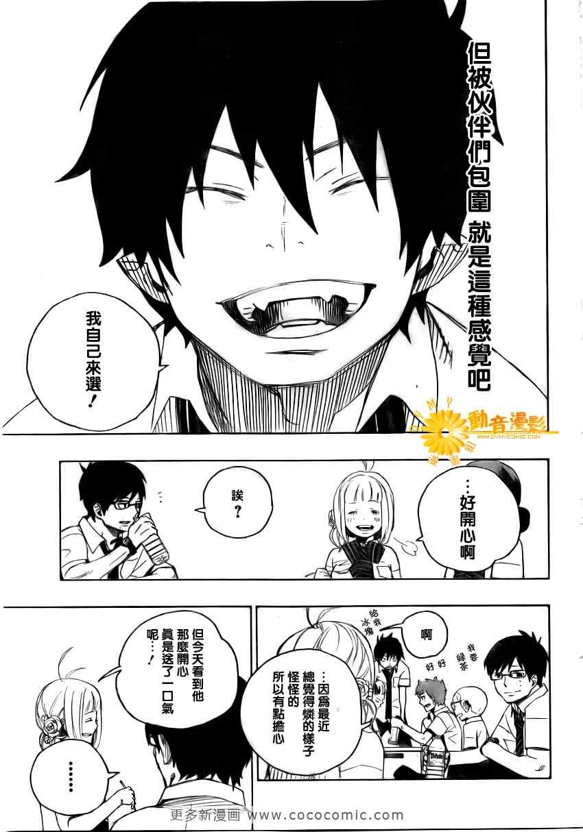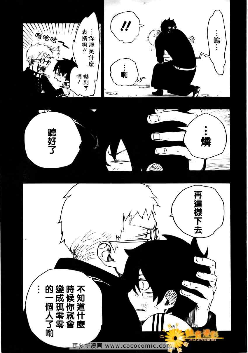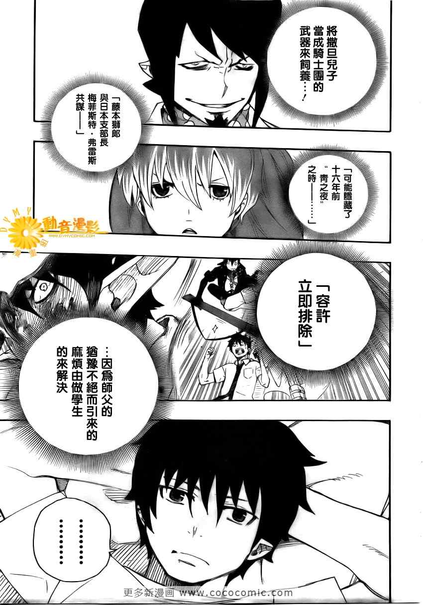主人公奥村燐,是在正十字学园上学的学生,虽说表面上是炎的后代但是实际上是魔神撒旦的儿子,只能用降魔剣抑制这力量,藤本被撒旦杀死后,就敲正十字骑士団的大门,立志成为除魔师,他的目标是—揍撒旦一顿……于2009年5月号始连载于《Jump Square》(简称Jump SQ、日语:ジャンプスクエア)