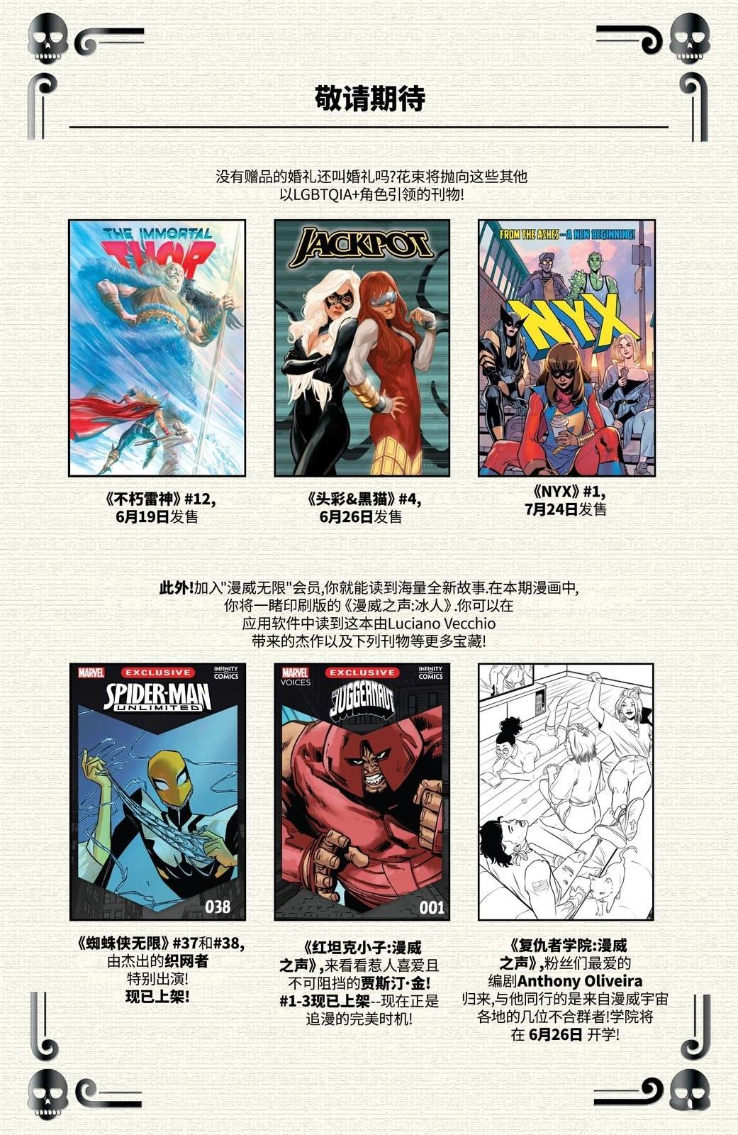 魔形女与命运是漫威漫画史上最受喜爱且最长久的同性伴侣之一。在她们共度的100多年岁月中的某个时刻,这对伴侣喜结连理,但我们从未在书页上见证过这一盛事。今年,《漫威之声:骄傲》将创造历史,呈现漫威首场女性与女性的婚礼!而像她们这样关系复杂的情侣,故事自然远不止于此。我们承诺,这将是一场充满狂欢、阴谋与[]与浪漫的盛宴[-折叠]