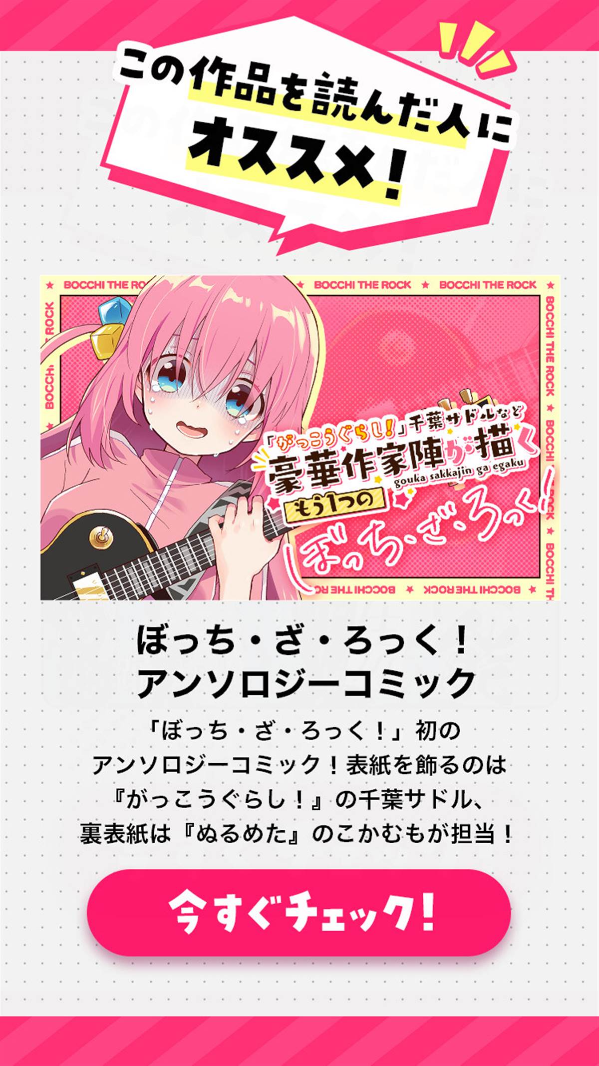 广井菊里(25岁)。作为独立摇滚乐队「SICK HACK」的核心人物,被称为“天才贝斯手”,酷爱喝酒。经常醉醺醺的样子不说,还经常损坏LIVE HOUSE的演出器材因而总是背负著债务。住在已有52年历史的事故出租房,还总是去朋友家里蹭洗澡。虽然对未来的不安总会定期而至,但在酒精的作用下又会深信著「幸[]幸福螺旋理论」迈步向前。这样的她又会每天度过怎样的日常呢……![-折叠]