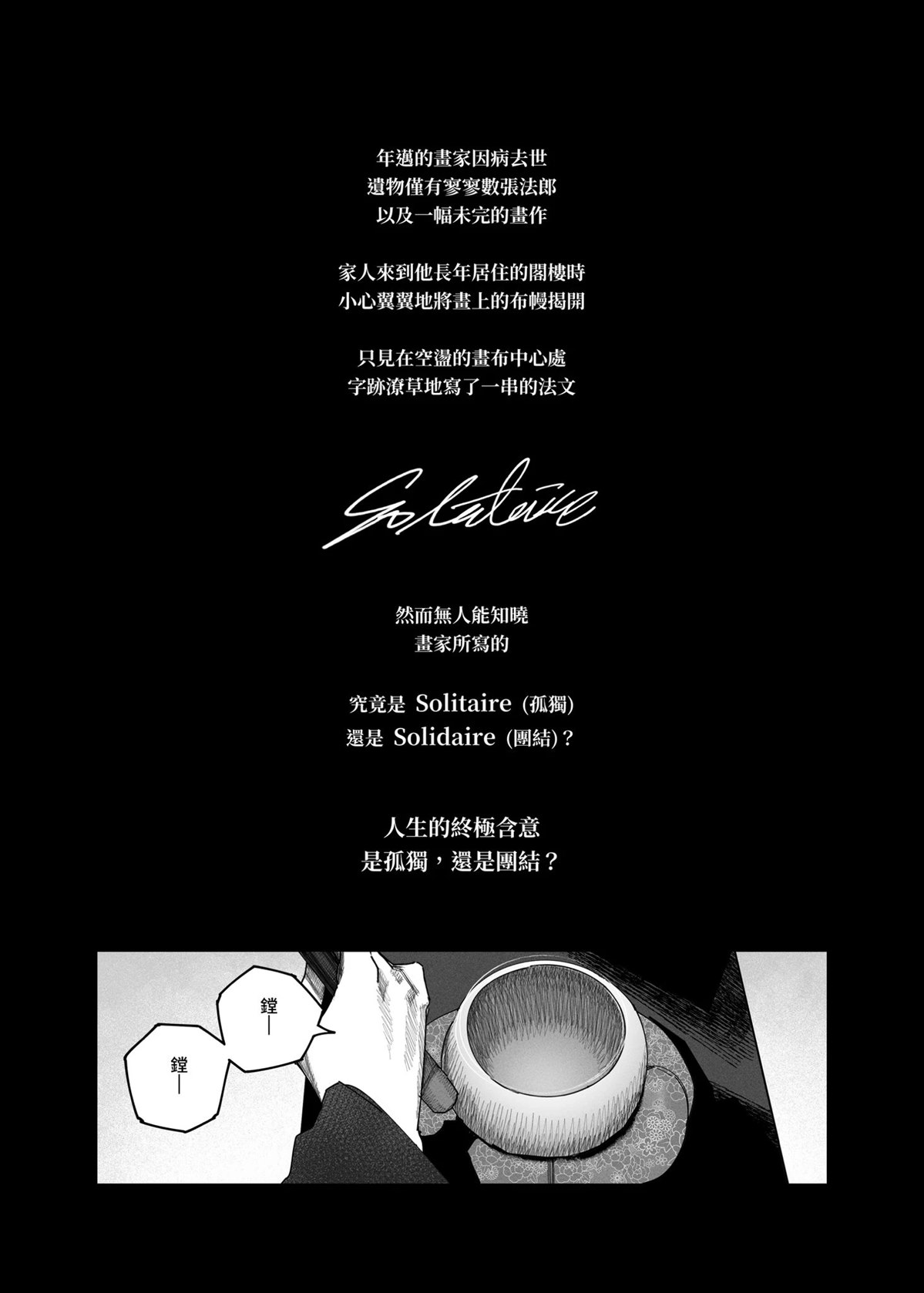 年迈的画家因病去世,遗物仅有寥寥数张法郎,以及一幅未完的画作。家人来到他长年居住的阁楼时,小心翼翼地将画上的布幔揭,只见在空荡的画布中心处,字迹潦草地写了一串的法文。然而无人能知晓,画家所写的,究竟是 Solitaire(孤独),还是 Solidaire(团结)? 人生的终极含意 是孤独,还是[]是团结[-折叠]