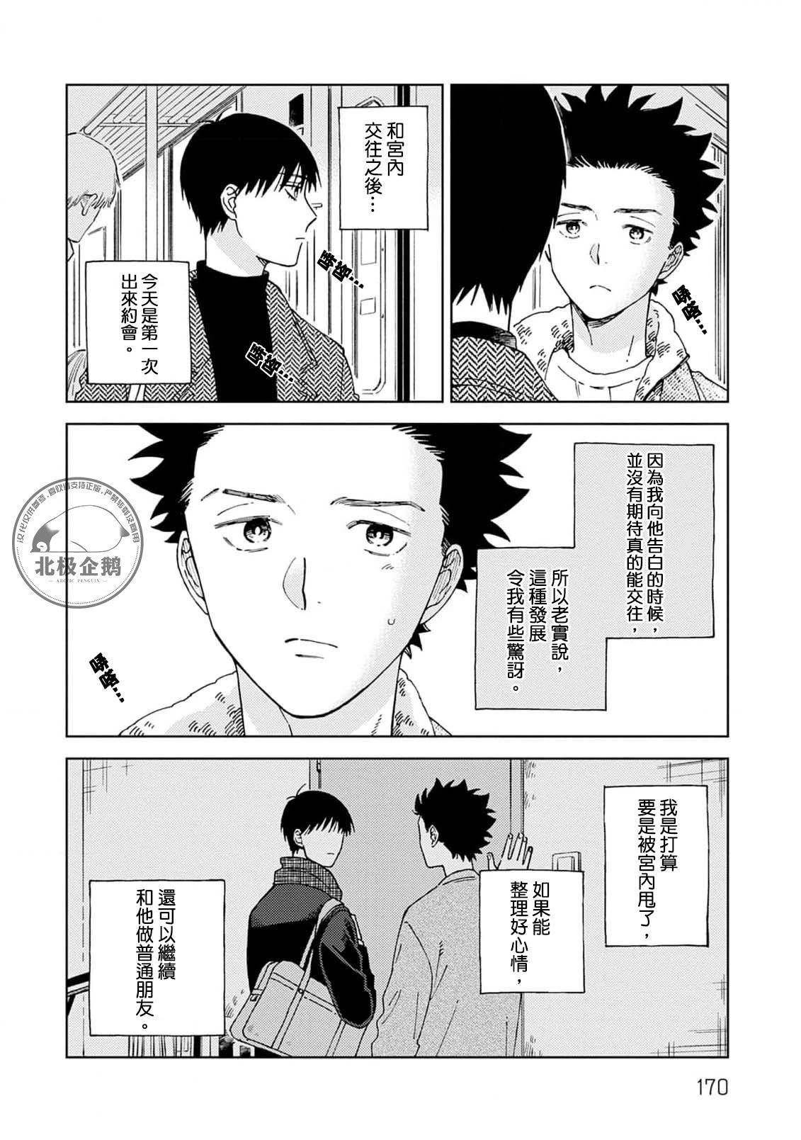 男子高中生井口在参加网红的线下活动时,不知为何对站在自己身边的美女十分在意。他忍不住盯著对方仔细观详,不知为何脑海中闪现过同年级的男同学——长著一副中性面容的宫内。活动结束后井口追上对方,发现他果然是宫内。虽然有些震惊,但是高兴于结交到同样喜欢可爱事物的朋友,井口忍不住对冷淡的宫内亲近起来,在学校里[]里也积极地与他搭话。随著两人聊天的机会逐渐变多,井口与女装的宫内一起约会(?),和朋友为他庆生,两个人的距离也逐渐缩短。然而单纯觉得宫内很「可爱」的心情,与发现还有其他人知道宫内女装的秘密之后有些烦闷的心情,让井口忍不住烦恼起来,自己对宫内的「喜欢」并不仅限于朋友的喜欢——[-折叠]