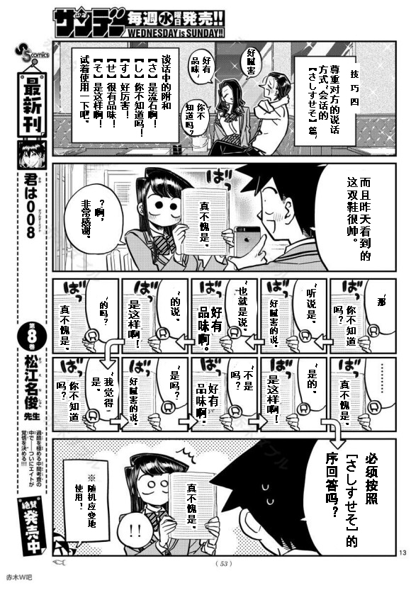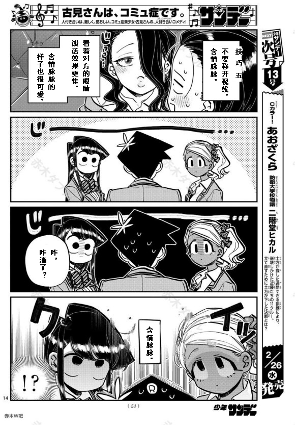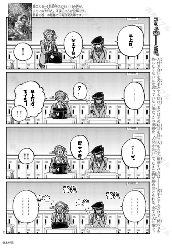 古见同学有交流障碍症漫画 ,少年sunday短篇五连弹的第一弹。 古见同学是美少女,站著就是艺术,坐著就是绝赞,走三步就会被人告白。可是她有交流障碍症!