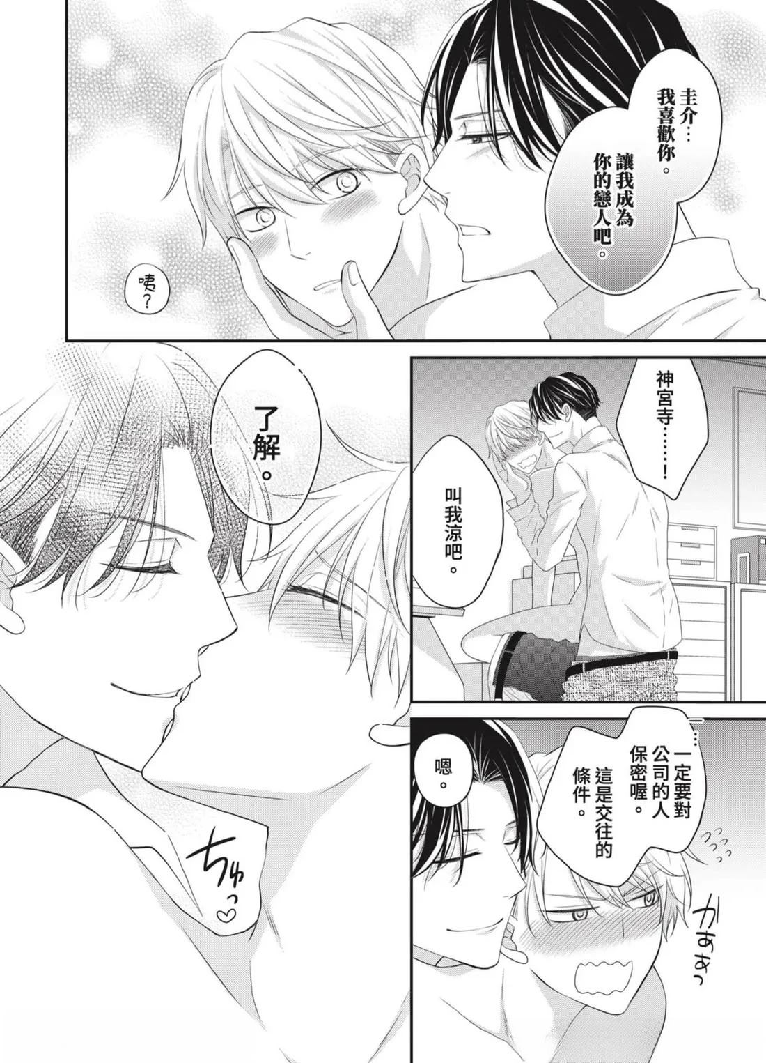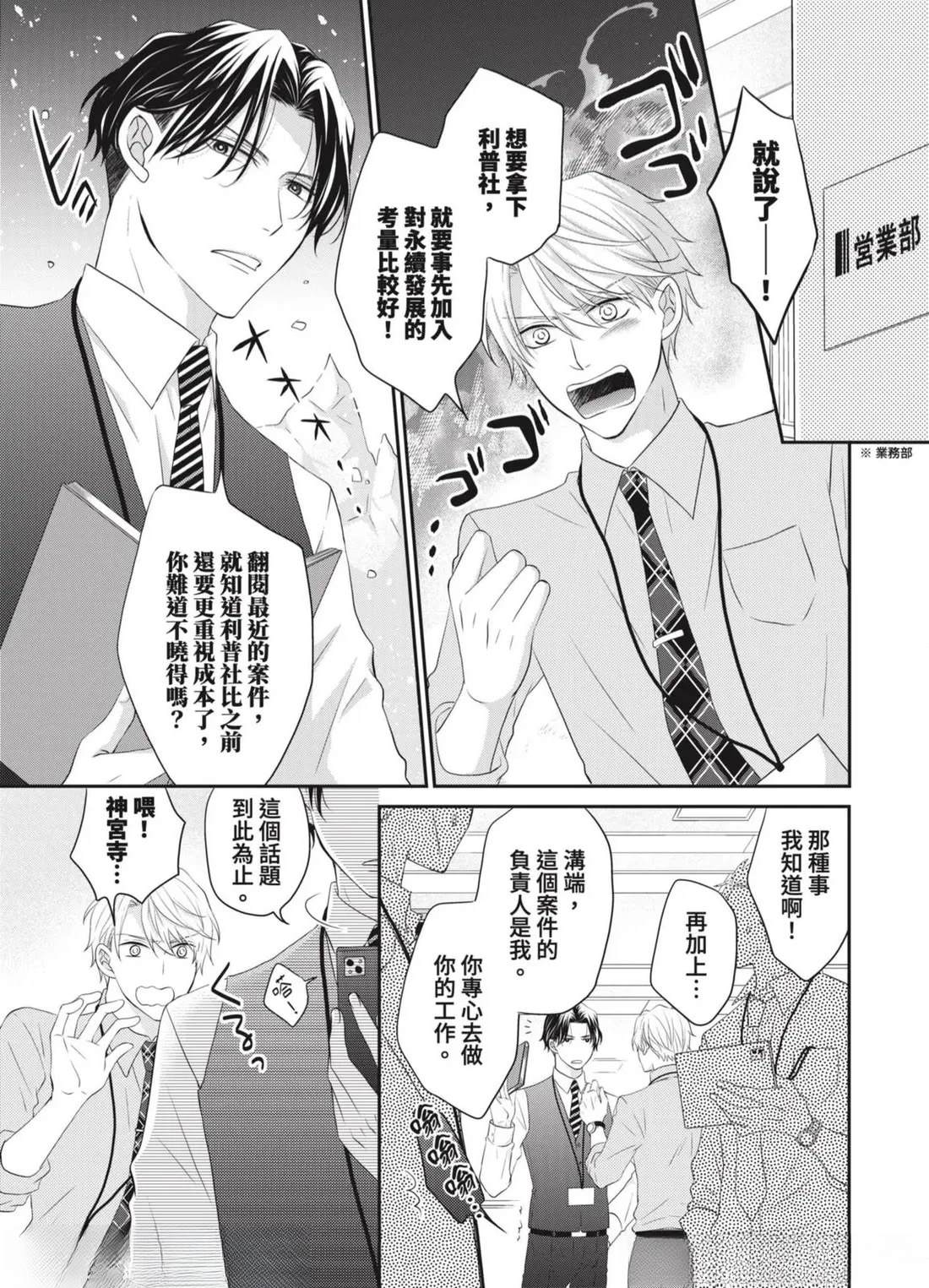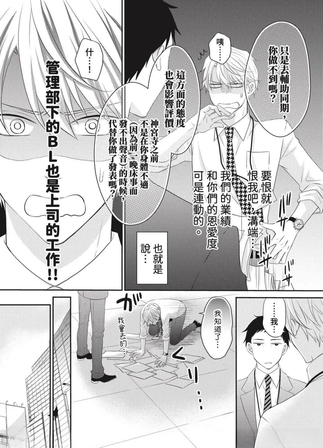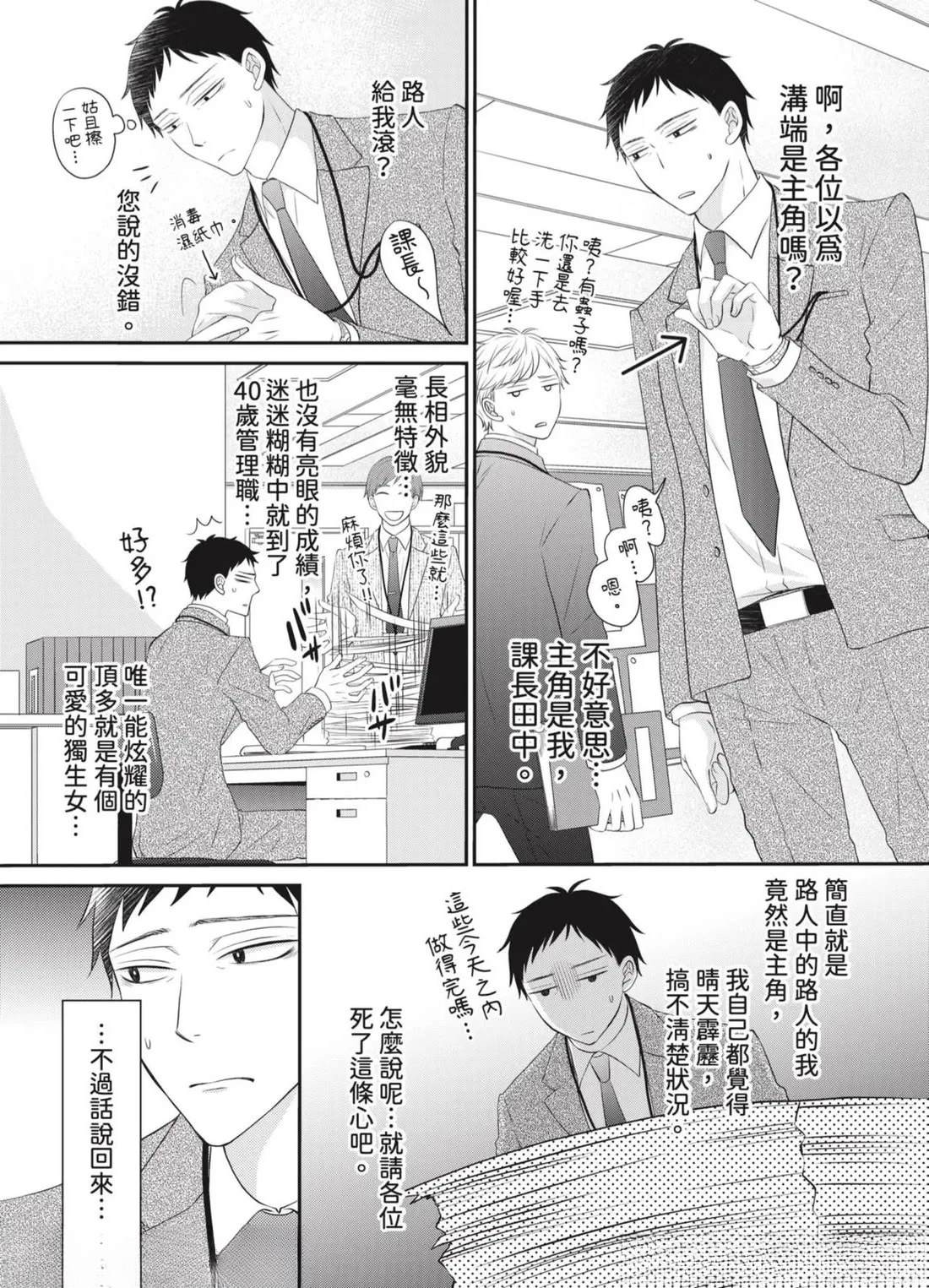 「管理部下的BL是上司的工作!」社内BL或许就是这样被妥善保护著…!?——平凡不起眼的课长.田中(40)某天,目击部下神宫寺和沟端在公司里做色色的事!便知道了他们秘密的BL关系。那之后,田中默默守护著两人的关系,并在私底下支持著他们…然而,两人却吵了架,甚至面临分手危机!?因为身为台柱的两人相处生硬[]硬,让业绩也大幅下降…为了公司,只好由我负责调停了…吗…!?全新观感的应援系BL漫画,幕[-折叠]