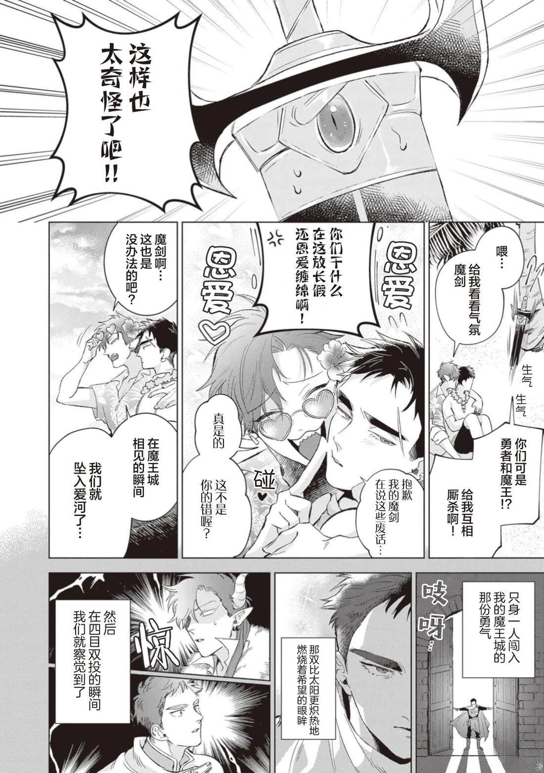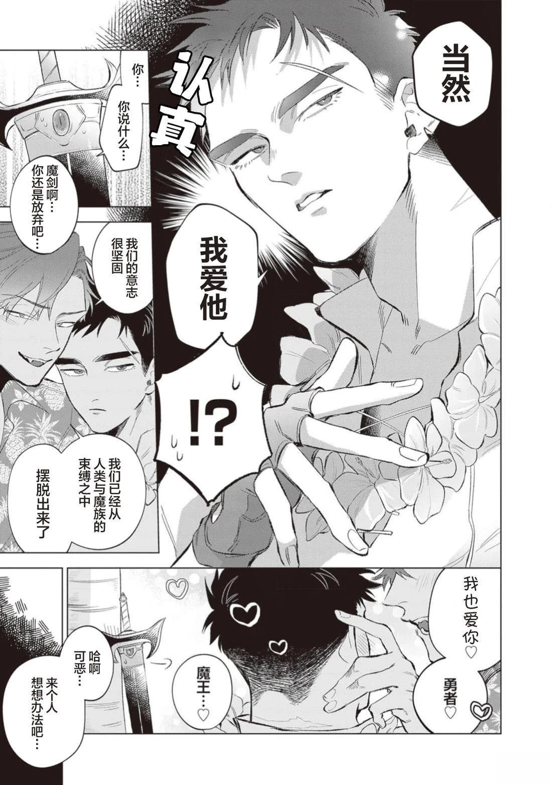 最大的宿敌是…最爱的爱人!?被因缘指引的爱恨白痴情侣BL!? 百年间,人类与魔族仇恨著对方种族,不断互相争夺。 魔王与勇者为了杀死而接近对方。 可是,五年后——。 两人在南方小岛上恩爱缠绵地度假!为什么!? 两人避世的去向是…?