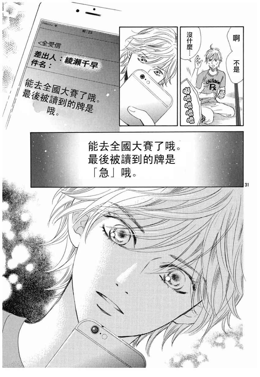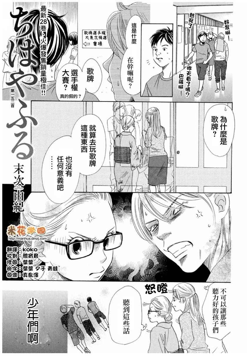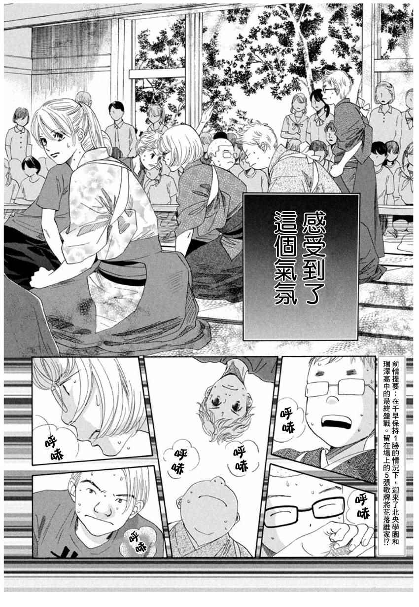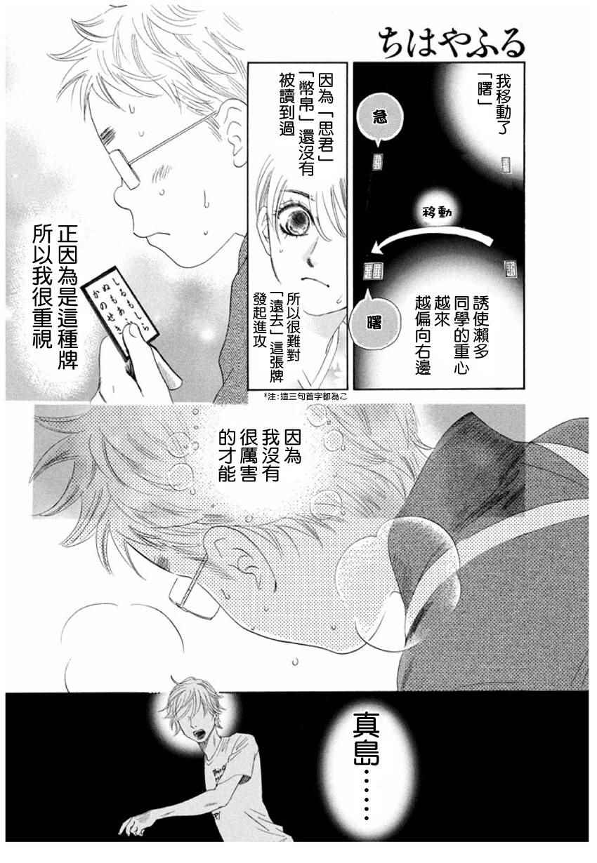 小六生千早认识了来自福井的转学生.新。新是个稳重沉默的孩子,但他却有项出人意料之外的才艺,就是小仓百人一首竞技花牌。新比任何人都快、比任何人都沉迷于抢牌的模样,给千早带来很大冲击。不过,令这样的新目不转睛的是…千早高人一等的「才能」──