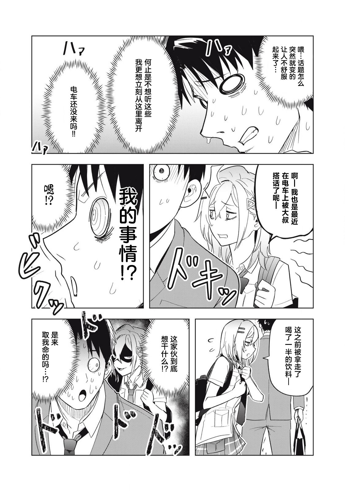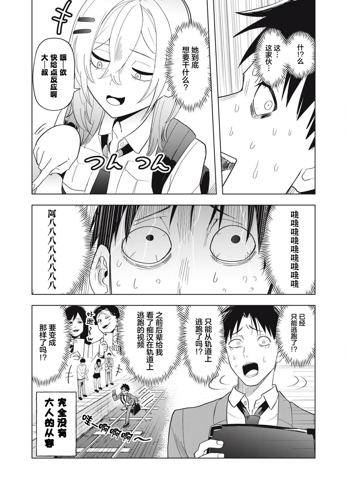 社畜和辣妹JK在拥挤的电车里,浑身大汗地,聊天。