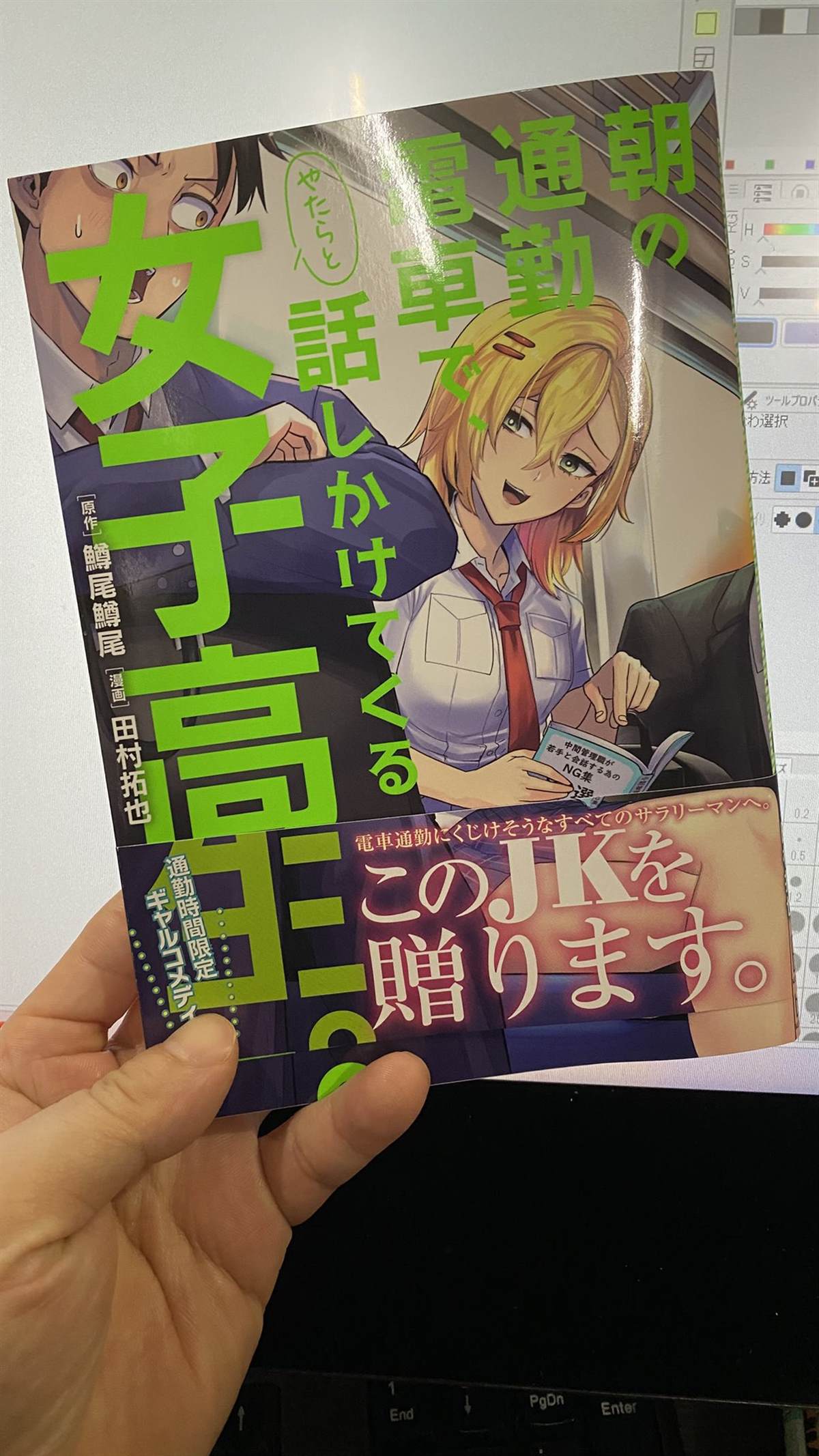 社畜和辣妹JK在拥挤的电车里,浑身大汗地,聊天。