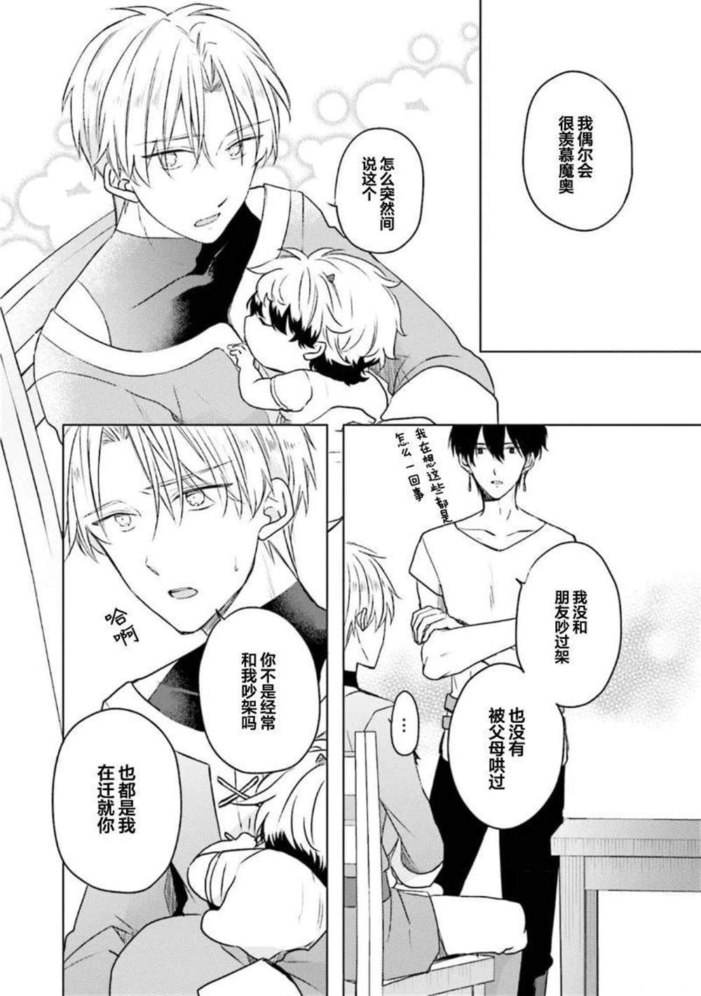 魔王路易和勇者杰德。 曾经不知道对方的身份而坠入爱河的敌对的两人,在乡下里,一边养育著未来的魔王魔奥,一边平静地生活著。 被认为「打倒魔王,将世界引向了和平」的杰德现在每天都在做家务,为育儿而奋斗。 零食是亲手制作的、烦恼是讨厌番茄,稍微离一点就会有恶作剧!! 一切都是为了将魔奥培养成心地善良的魔[]魔王,实现【人和魔族的共存】 路易不但不协助,反而说著「再更加关心我吧」对小孩子闹别扭…![-折叠]