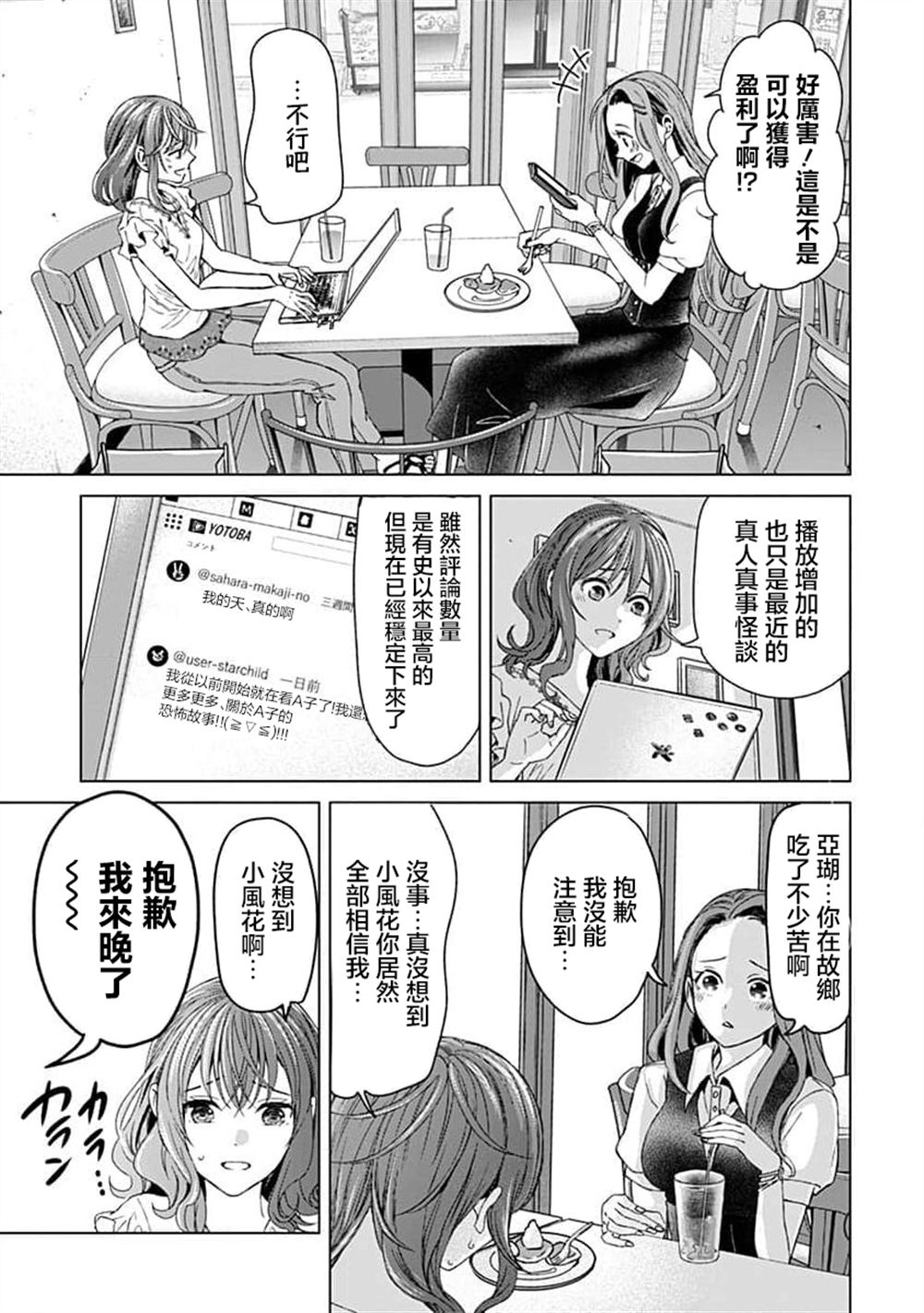 「就是因为你,知景死了。」在视频网站上投稿了怪谈朗读视频的大学生亚瑚,却在亲友的葬礼上被人说了这么一段难以置信的话。在这个被鬼缠上的村子里,流传著如果说出那段朗读就会有鬼作祟的「忌讳说法」。随著惨剧不断发生,亚瑚的身心都濒临崩溃。不久后,她就会成为被人称呼为「鬼妇」的存在……。冲击性的纯爱恐怖悬疑漫[]漫画[-折叠]
