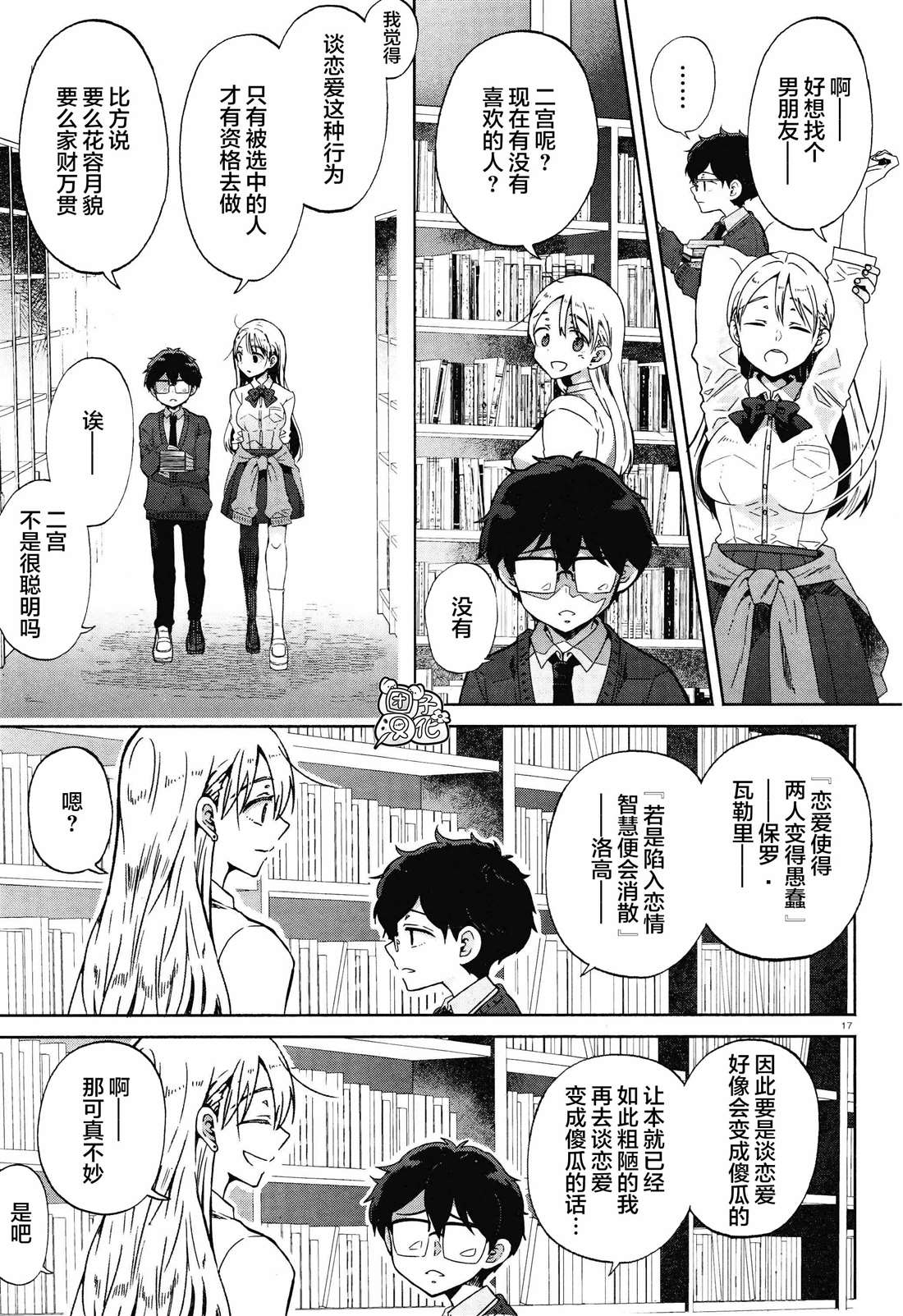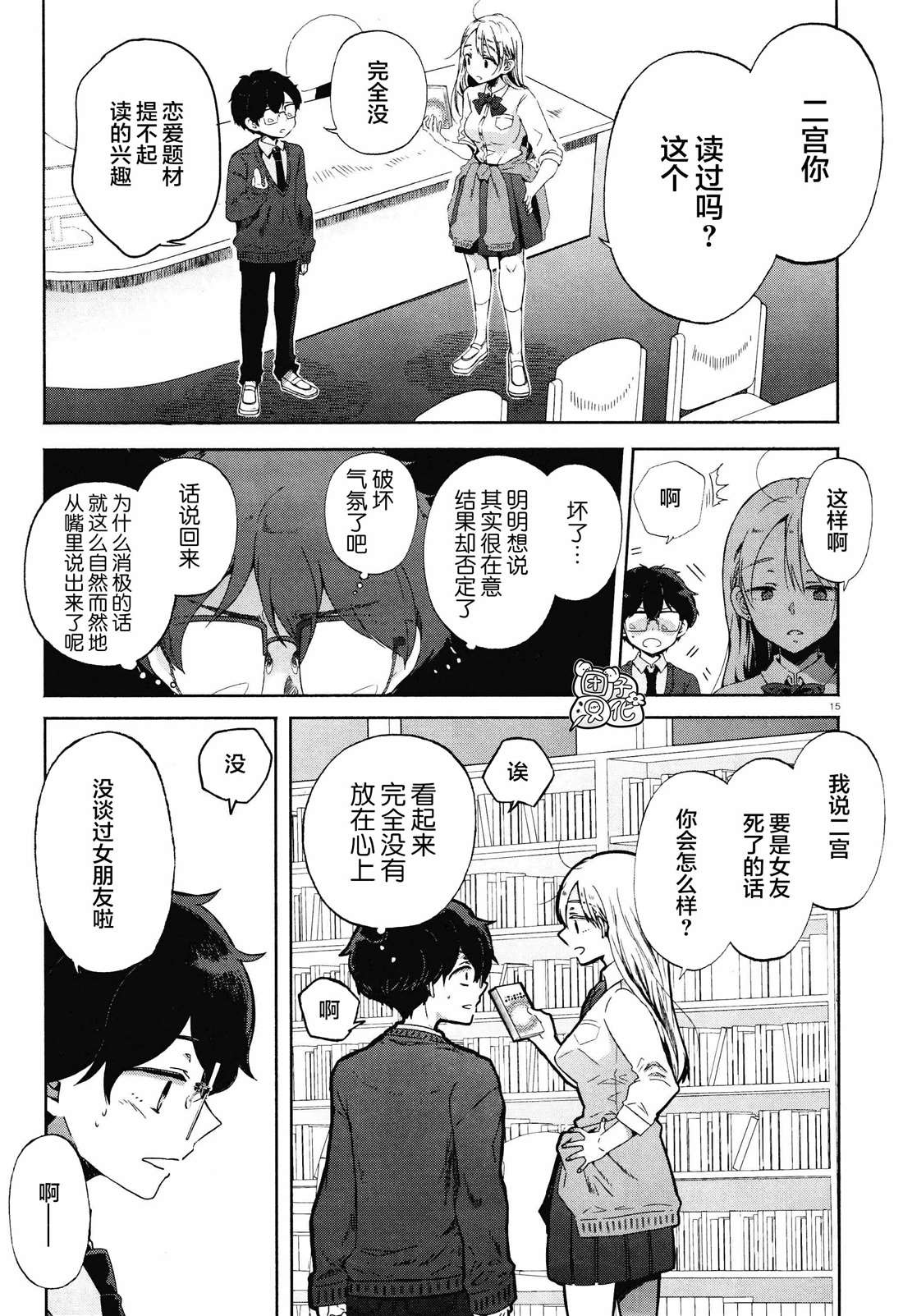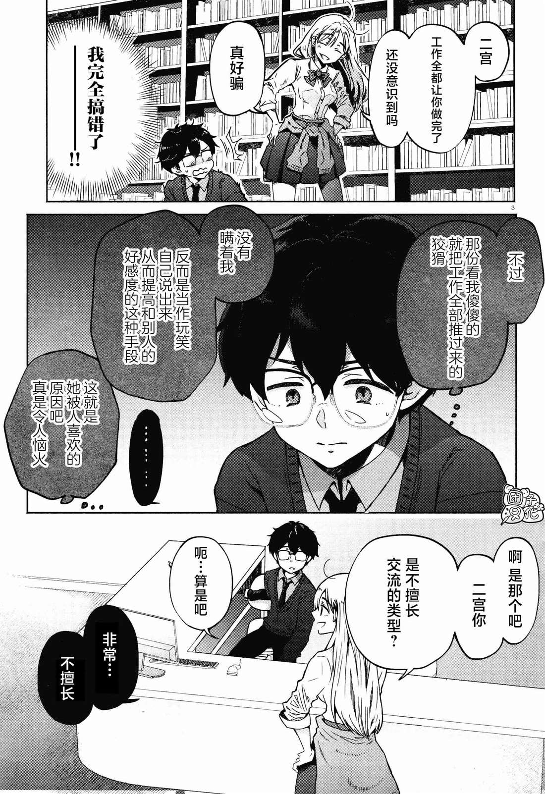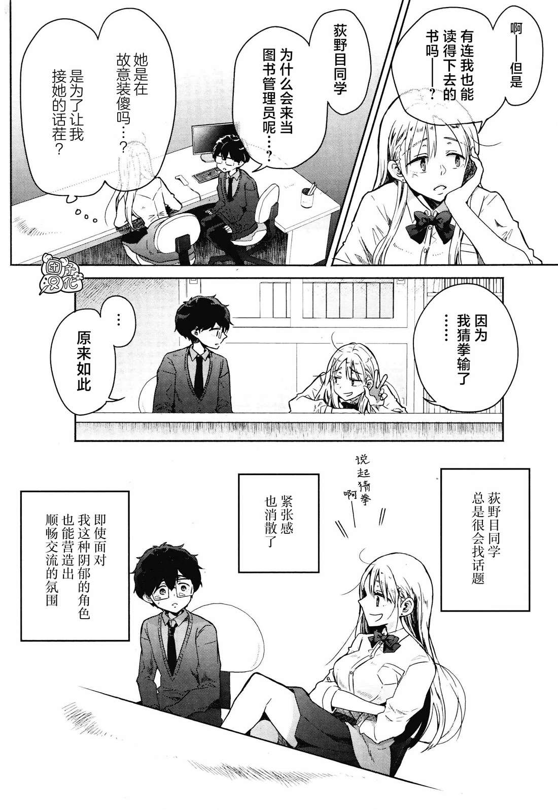 班级里”一线军团”的女生荻野目和不擅长同他人交流的二宫一起成为了图书室管理员。一个是沟通力满分的活泼辣妹,一个是不善于交谈的阴郁男生。而二宫则在第一次交谈后喜欢上了荻野目……。