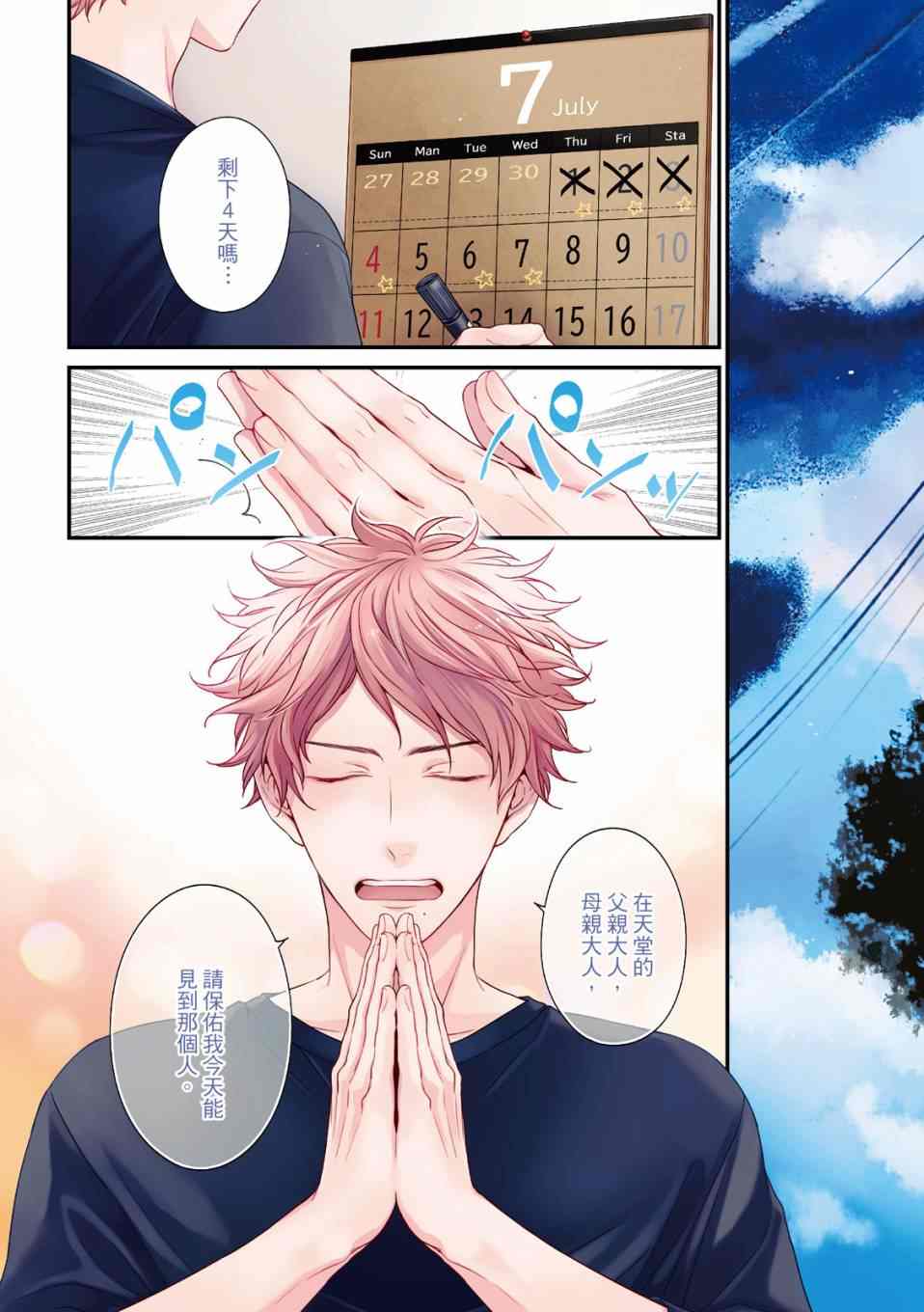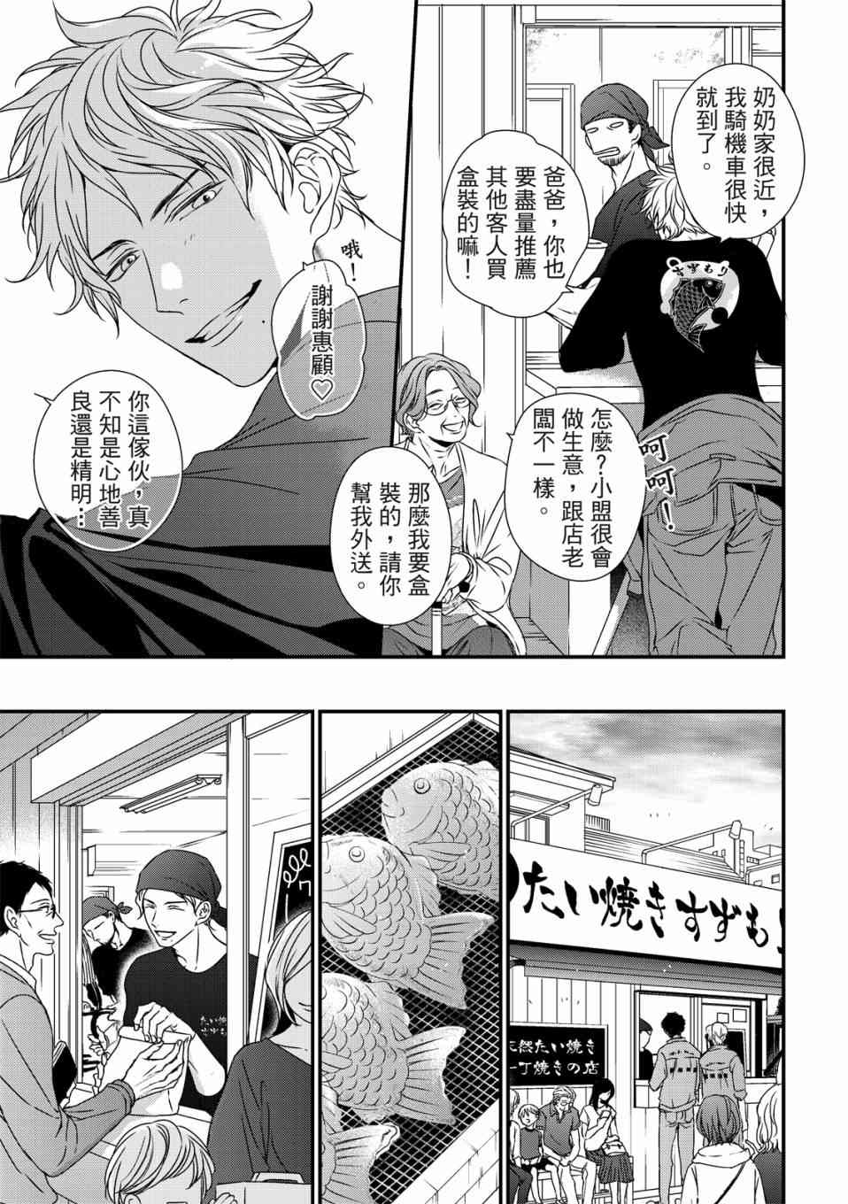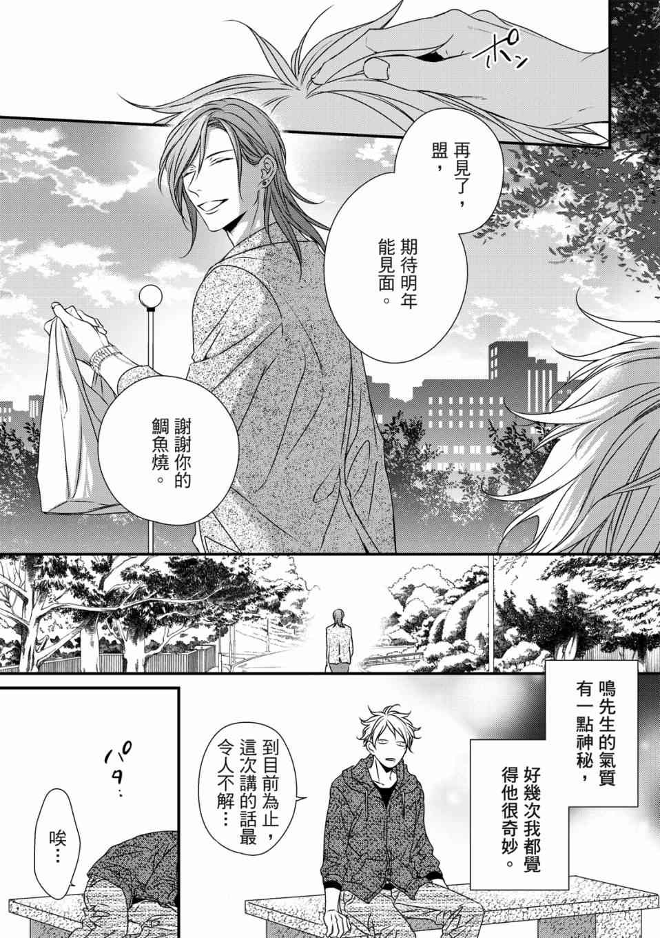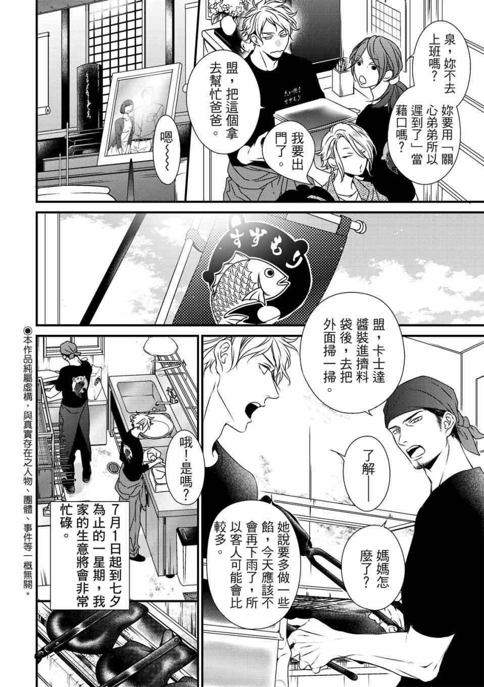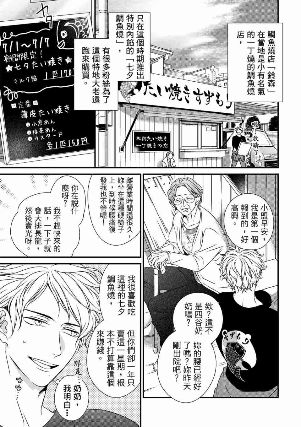 盟是鲷鱼烧店“铃森”老板的独生子,每年七夕是家里生意最忙的时候,因为独家的鲷鱼烧口味深受顾客们的喜爱。但是其实对盟来说,七夕是个可以见到喜欢之人的日子。鸣是一年一度会来买独家口味鲷鱼烧的客人之一,一始盟对鸣只是一种憧憬,但在高中的时候盟知道了鸣有恋人,此时才明白憧憬渐渐变成了爱恋,而且是不能说出口[]口没有结果的爱恋。这样的状态持续了六年,不想再这么不明不白地过日子的盟,决定要向鸣告白了[-折叠]