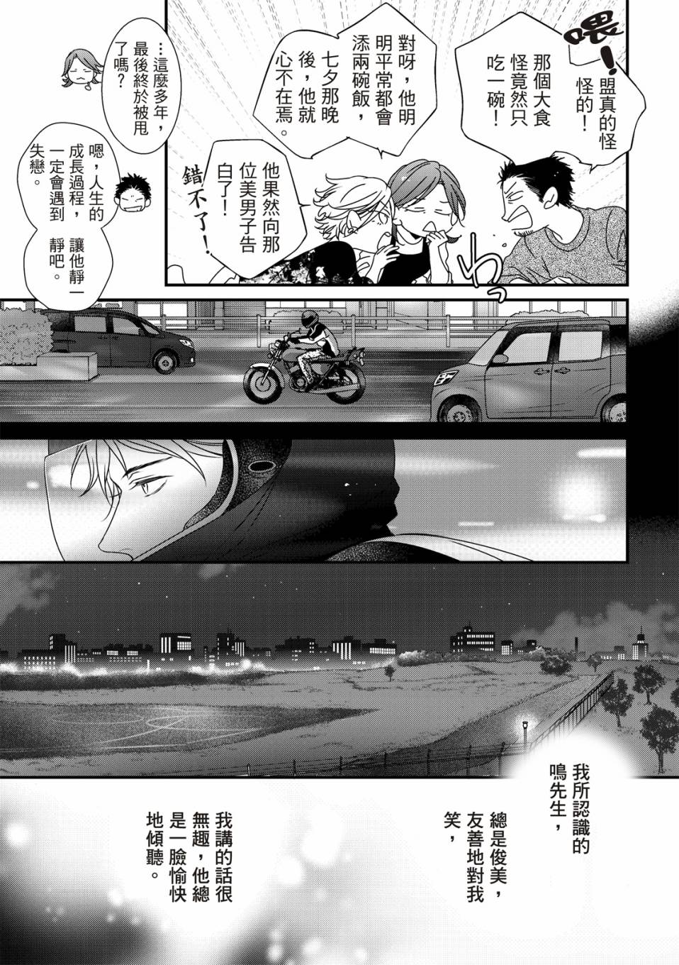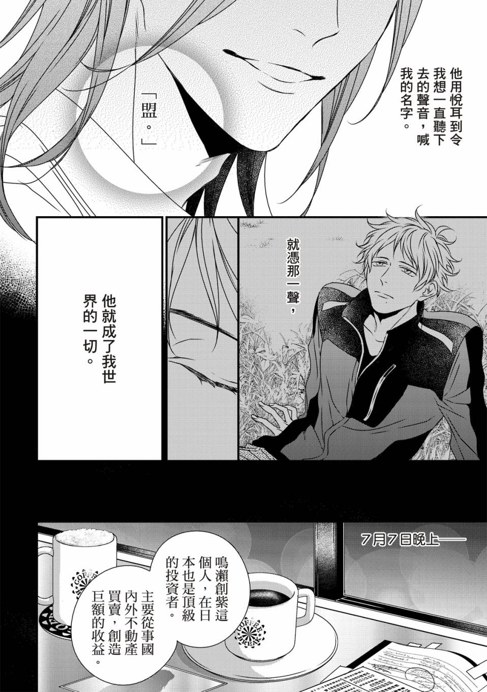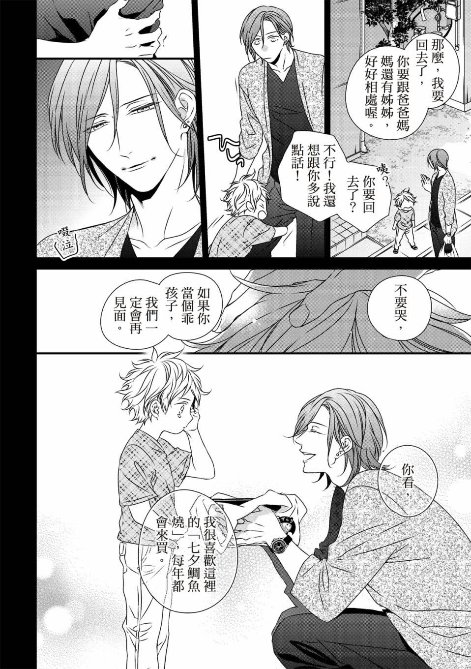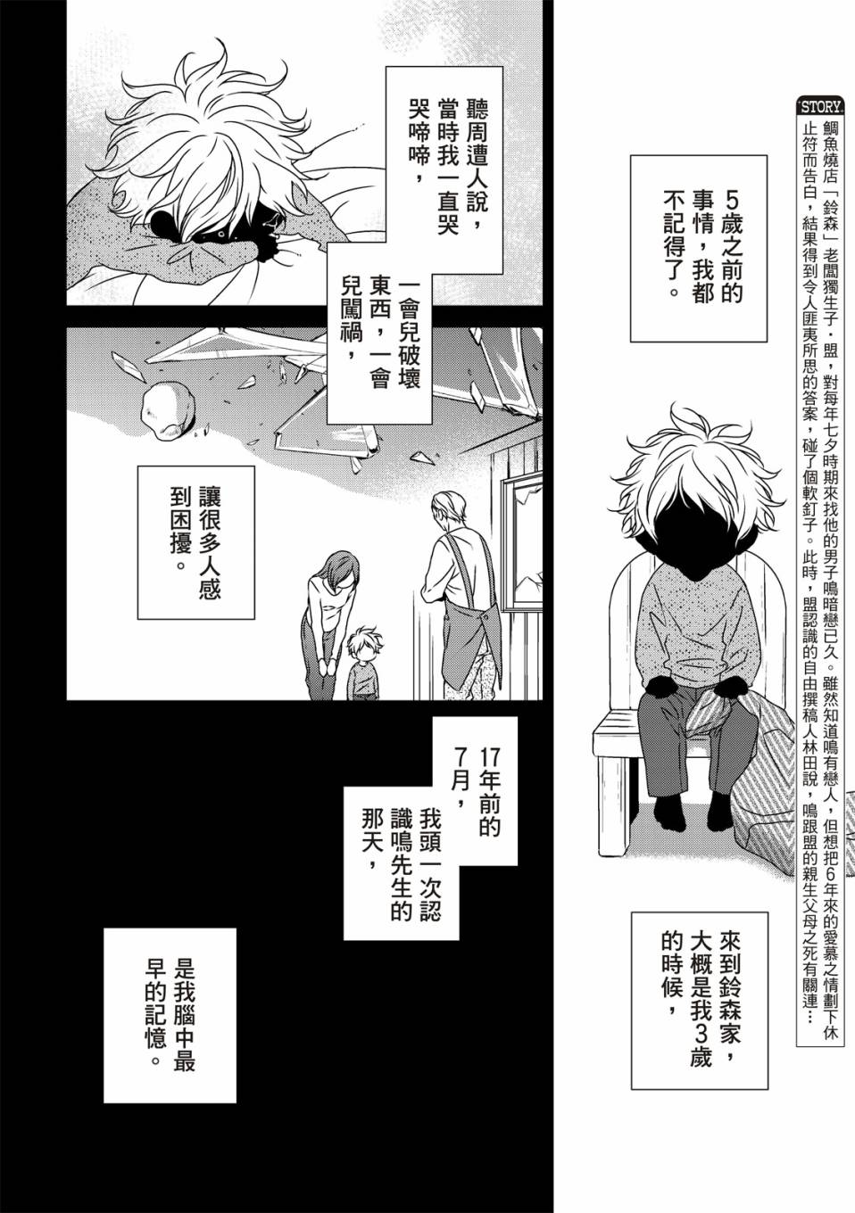 盟是鲷鱼烧店“铃森”老板的独生子,每年七夕是家里生意最忙的时候,因为独家的鲷鱼烧口味深受顾客们的喜爱。但是其实对盟来说,七夕是个可以见到喜欢之人的日子。鸣是一年一度会来买独家口味鲷鱼烧的客人之一,一始盟对鸣只是一种憧憬,但在高中的时候盟知道了鸣有恋人,此时才明白憧憬渐渐变成了爱恋,而且是不能说出口[]口没有结果的爱恋。这样的状态持续了六年,不想再这么不明不白地过日子的盟,决定要向鸣告白了[-折叠]