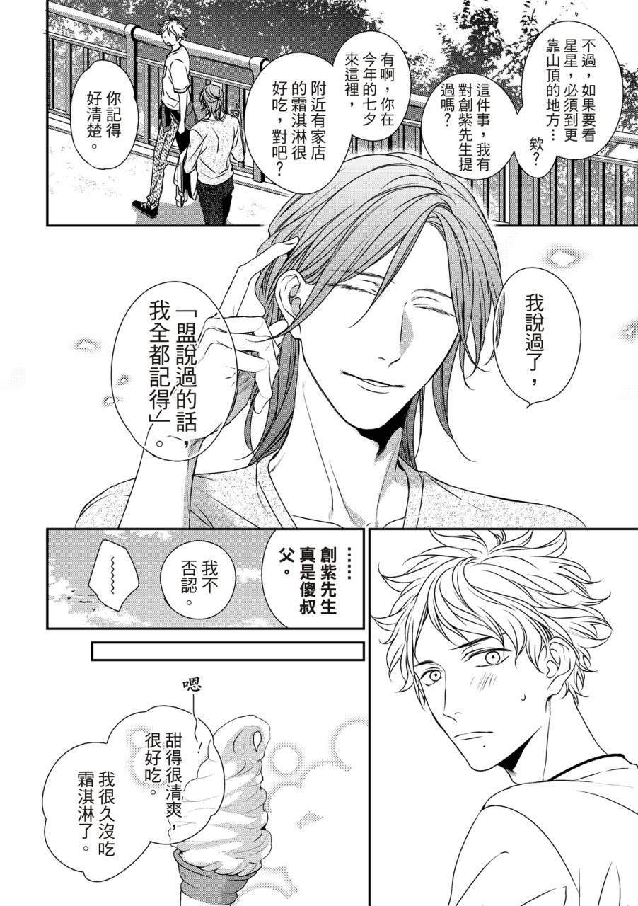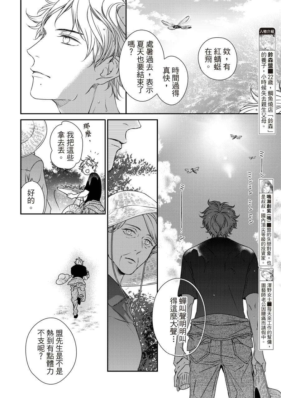 盟是鲷鱼烧店“铃森”老板的独生子,每年七夕是家里生意最忙的时候,因为独家的鲷鱼烧口味深受顾客们的喜爱。但是其实对盟来说,七夕是个可以见到喜欢之人的日子。鸣是一年一度会来买独家口味鲷鱼烧的客人之一,一始盟对鸣只是一种憧憬,但在高中的时候盟知道了鸣有恋人,此时才明白憧憬渐渐变成了爱恋,而且是不能说出口[]口没有结果的爱恋。这样的状态持续了六年,不想再这么不明不白地过日子的盟,决定要向鸣告白了[-折叠]