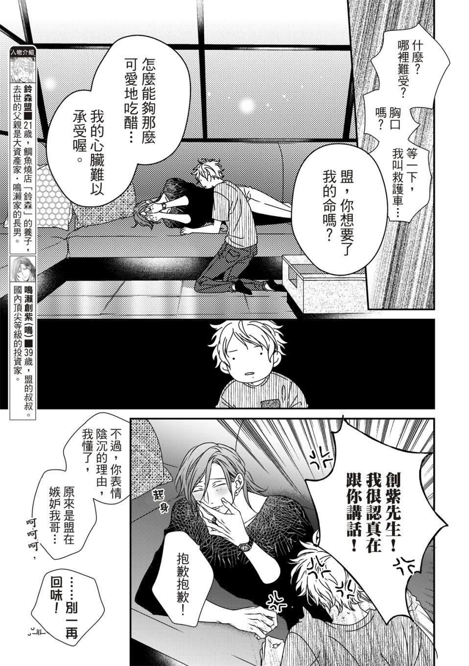 盟是鲷鱼烧店“铃森”老板的独生子,每年七夕是家里生意最忙的时候,因为独家的鲷鱼烧口味深受顾客们的喜爱。但是其实对盟来说,七夕是个可以见到喜欢之人的日子。鸣是一年一度会来买独家口味鲷鱼烧的客人之一,一始盟对鸣只是一种憧憬,但在高中的时候盟知道了鸣有恋人,此时才明白憧憬渐渐变成了爱恋,而且是不能说出口[]口没有结果的爱恋。这样的状态持续了六年,不想再这么不明不白地过日子的盟,决定要向鸣告白了[-折叠]