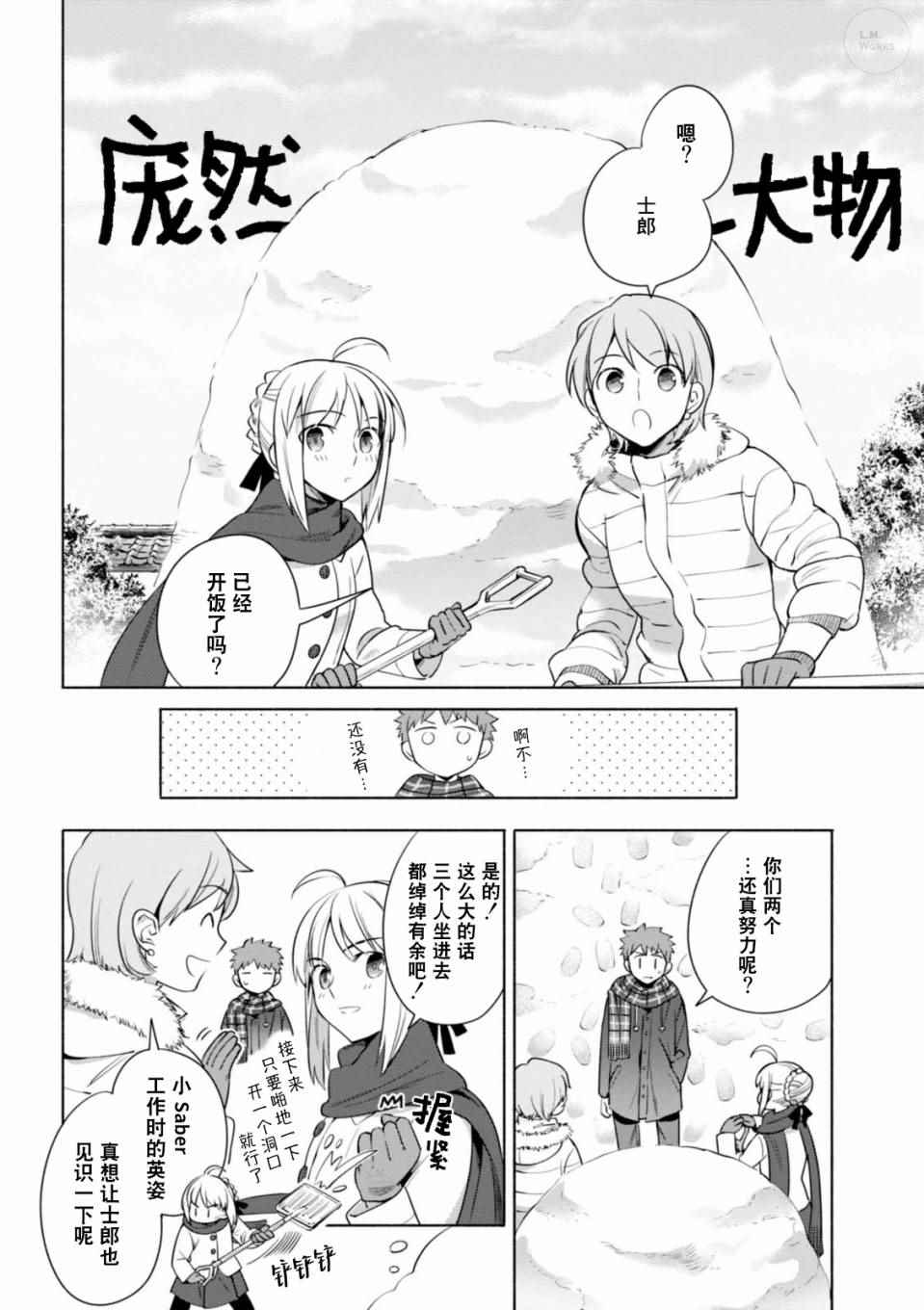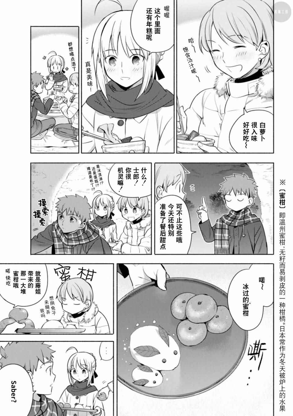 卫宫家今天的饭漫画 ,《卫宫家今天的饭》是根据原作游戏与动画为题材创作的美食漫,卫宫士郎每天忙著给SABER、间桐樱等女生做饭。第一话中的好媳妇卫宫士郎顶著大雪天在街上买食材准备晚上打火锅,毕竟这是圣杯战争的重要一环。卫宫士郎在众人面前示了整个做菜过程,非常详细,对厨艺有兴趣的同学可以跟著做成现实[]实版[-折叠]