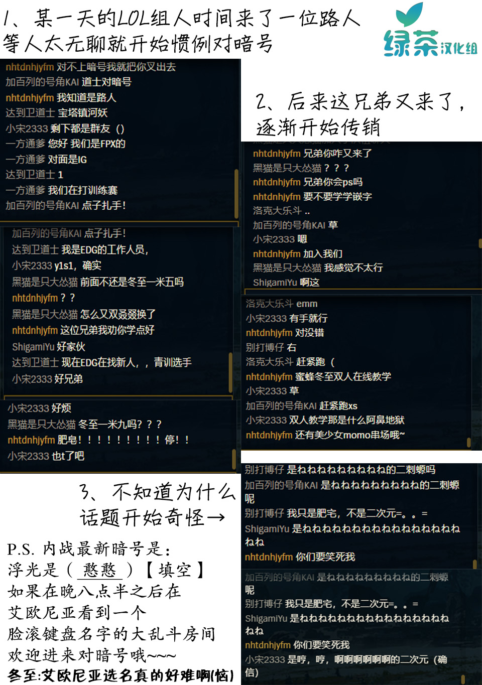 绿茶汉化组趣事漫画,以群魔乱舞的形式来讲述组内发生的趣事、黑历史、梗、全能美少女组长momo、温柔大姐姐蜜蜂、粉切黑冬至、钞能力博仔、人见人爱喵帕斯、肝帝小智、老色批迅哥等等,我们将通过共同的努力来创造记录我们美好时光的优秀作品,承载著我们的爱与勇气,希望您看得心。