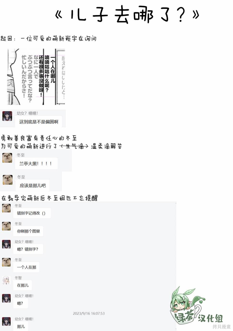 绿茶汉化组趣事漫画,以群魔乱舞的形式来讲述组内发生的趣事、黑历史、梗、全能美少女组长momo、温柔大姐姐蜜蜂、粉切黑冬至、钞能力博仔、人见人爱喵帕斯、肝帝小智、老色批迅哥等等,我们将通过共同的努力来创造记录我们美好时光的优秀作品,承载著我们的爱与勇气,希望您看得心。