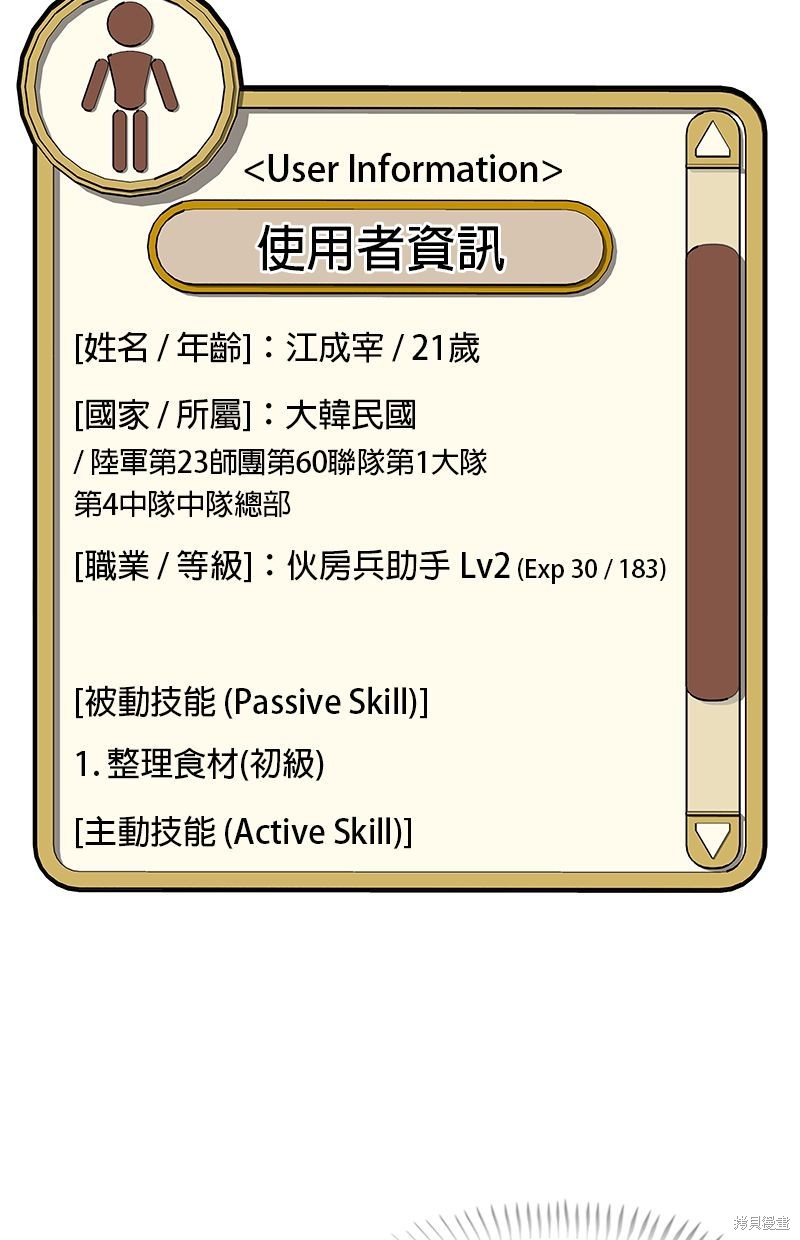 21岁的江成宰是大韩民国典型的穷二代,辛苦维持生计之际收到了入伍通知。 惴惴不安的新兵生活突然出现了一道曙光,只要跟著唯有他才能看见的「游戏教学」破任务升级,就有机会成为军中的传奇厨师!