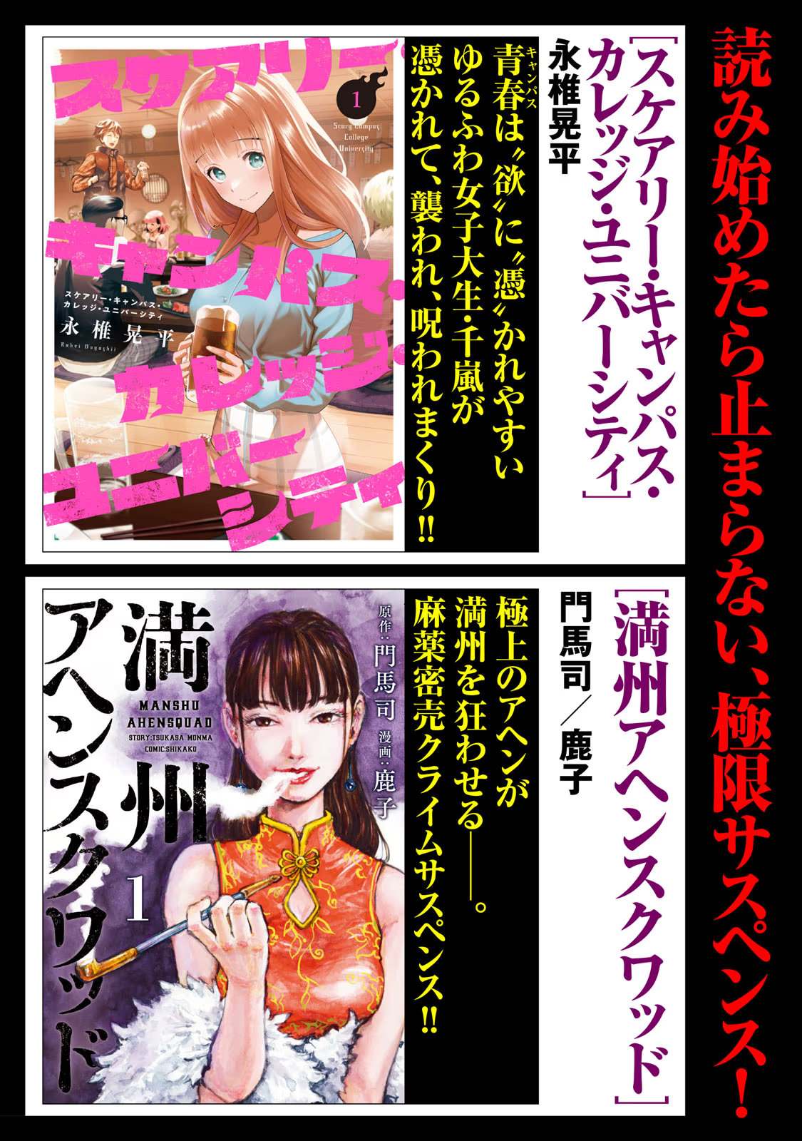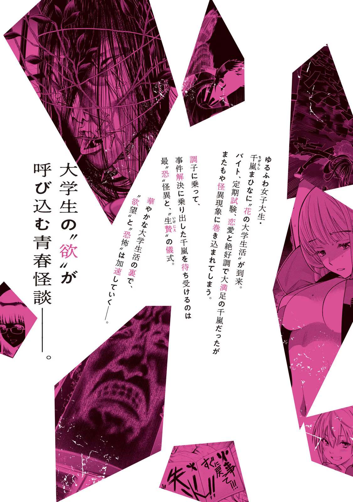 酒会,俱乐部活动,浪漫...洋溢著青春的大学生活容易被欲望驱使,而软萌女大学生千岚在这弥漫“欲望”和“恐怖”的大学生活中不断被缠上、被袭击、被诅咒!!由大学生的“欲望”所启的青春怪谈——。