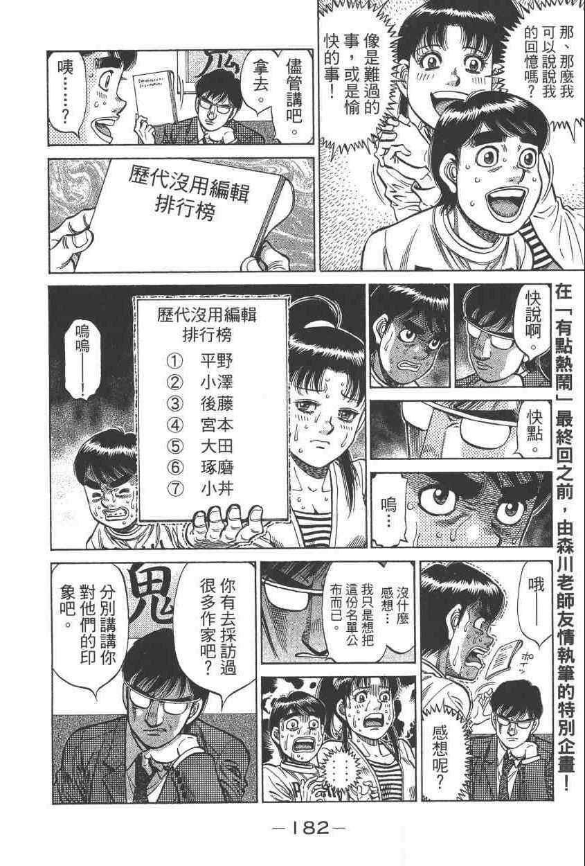 所谓的“强大”是怎么回事呢?我也想变强大!老是打不赢别人、被人欺负的高中生幕之内一步,跟拳手鹰村相遇后,体内潜伏的黄色炸药神拳终于被唤醒!幕之内一步懹抱著职业拳手的美梦,准备要向鸭川拳馆的入门测试挑战了! 之内一步与首位强敌宫田一郎再度决战的铃响起了!面对著宫田漂亮的步法,一步向胜利挑战!现在[]在要测试一下会长不眠不休、付出血汗调教的特训成果!连续猛击打倒宫中,摧毁那必杀的长拳攻击绝招! 终于,初次登场赛的日子来临,应战的敌手是小田裕介–擅打右钩拳的拳手,一步之周围的好友都认为他一定会胜利!但是到了擂台上,小田却有如脱胎换骨一般!超级激烈战斗始!一步能在初次登场赛中赢得胜利吗[-折叠]