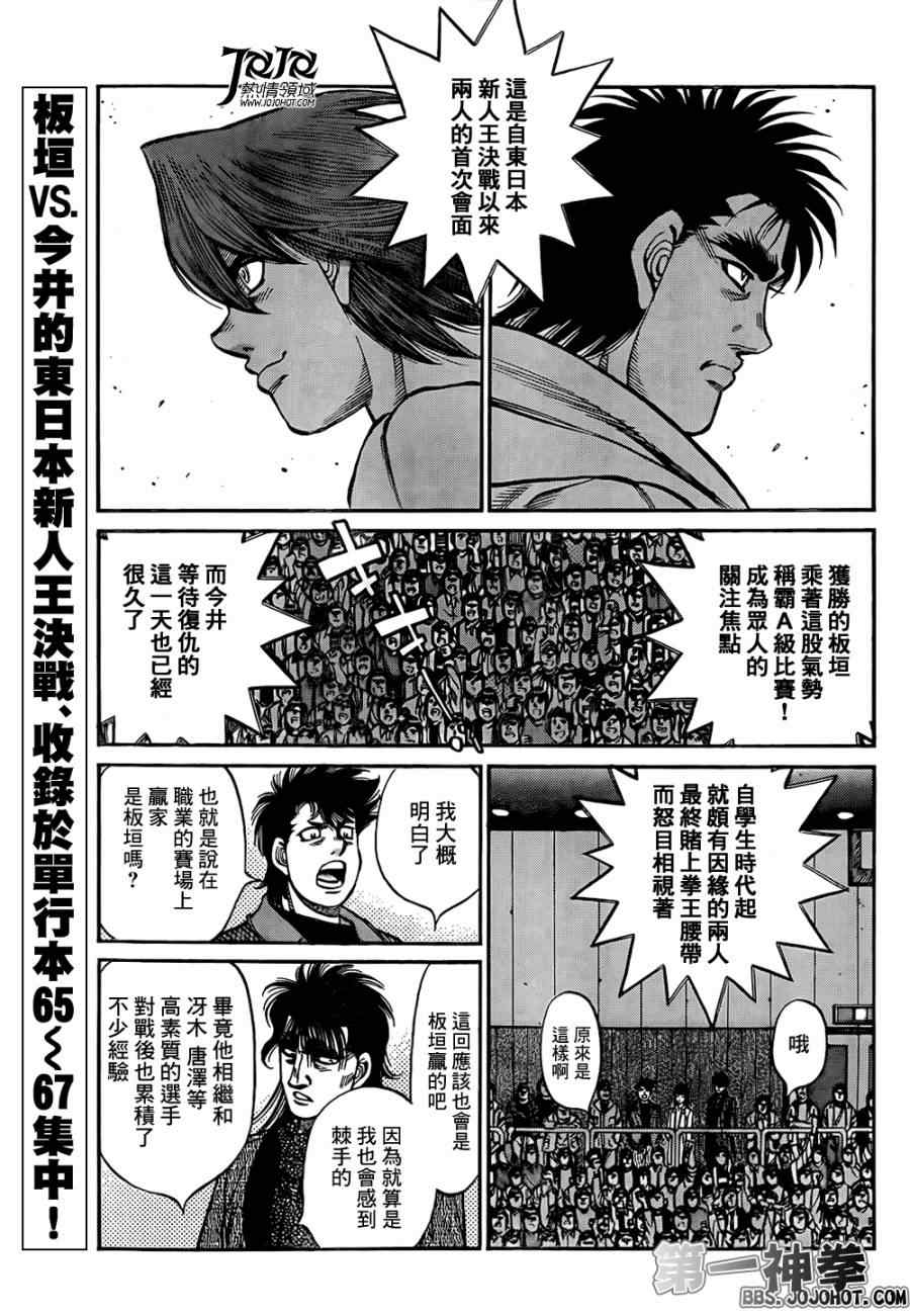 所谓的“强大”是怎么回事呢?我也想变强大!老是打不赢别人、被人欺负的高中生幕之内一步,跟拳手鹰村相遇后,体内潜伏的黄色炸药神拳终于被唤醒!幕之内一步懹抱著职业拳手的美梦,准备要向鸭川拳馆的入门测试挑战了! 之内一步与首位强敌宫田一郎再度决战的铃响起了!面对著宫田漂亮的步法,一步向胜利挑战!现在[]在要测试一下会长不眠不休、付出血汗调教的特训成果!连续猛击打倒宫中,摧毁那必杀的长拳攻击绝招! 终于,初次登场赛的日子来临,应战的敌手是小田裕介–擅打右钩拳的拳手,一步之周围的好友都认为他一定会胜利!但是到了擂台上,小田却有如脱胎换骨一般!超级激烈战斗始!一步能在初次登场赛中赢得胜利吗[-折叠]