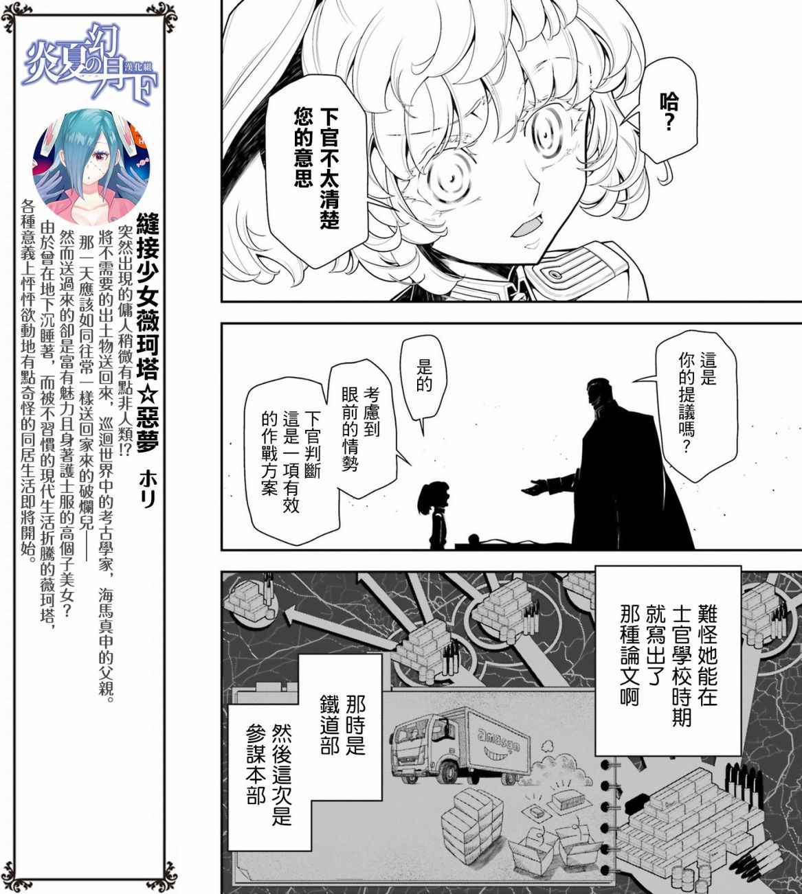 有著金发碧眼与白皙肌肤的幼女翱翔天际,残忍无情地击坠敌军。 以幼女口齿不清的语调指挥大军的她,名叫谭雅.提古雷查夫。 然而她的真实身分,则是在神的失控下转生成为幼女的菁英上班族。 把效率与出人头地看得比什么都还重要的幼女提古雷查夫,逐渐成为帝国军魔导师当中最危险的存在——
