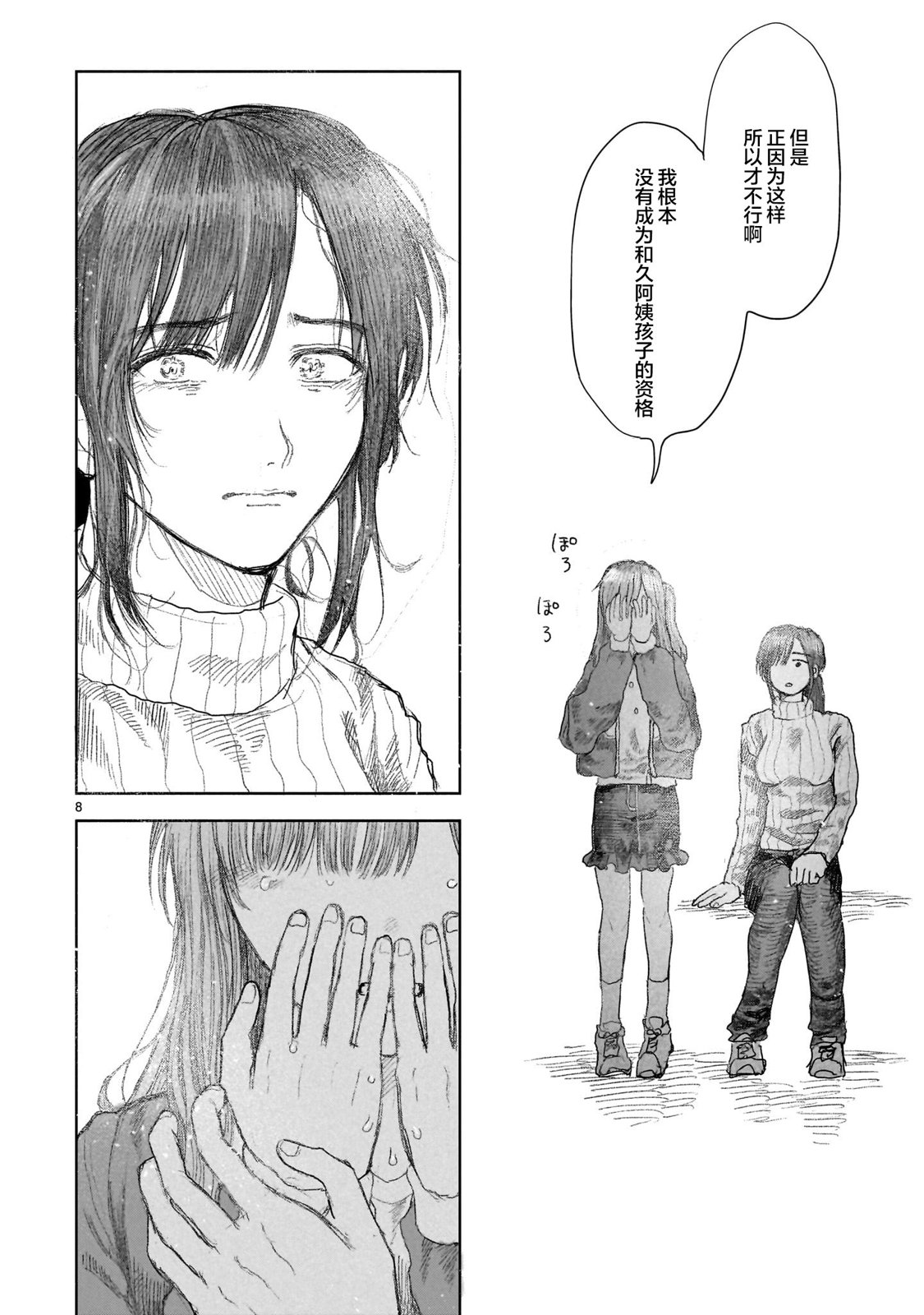 モモヤマハト一般向新连载《最果てに惑う》。主角的妹妹被补习班老师强奸而自杀。他杀死老师为妹妹报仇,服刑出狱之后也一直感到自责,本打算自杀赎罪,却在妹妹的墓前遇到了老师年幼的女儿……
