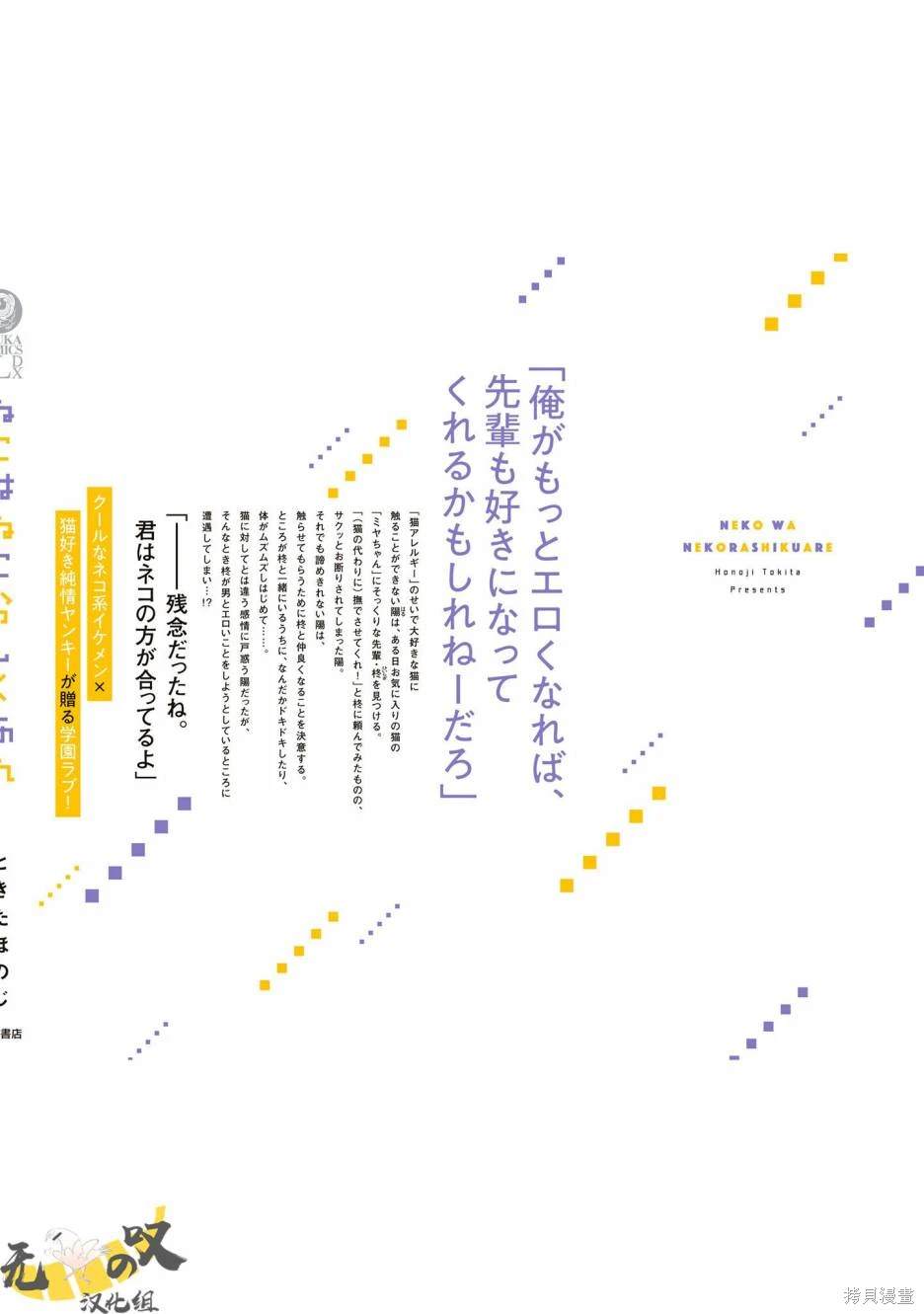 因为「猫过敏」而不能碰自己喜欢的猫的阳,有一天发现了和自己喜欢的猫「小宫」一模一样的学长·柊。阳拜托柊,「请(代替猫)让我摸摸你!」却被果断拒绝了。即便如此也不死心的阳,为了能触摸他,决心和柊打好关系。然而,和柊在一起的时候,阳总觉得心脏狂跳,身体也酥酥麻麻的……。阳对于和对猫不同的感情正感到迷惑,[],随后却撞见了柊正想和男人的事…!? 「——真遗憾,你更适合受。」 高冷猫系帅哥×猫奴纯情不良少年带来的校园爱情[-折叠]