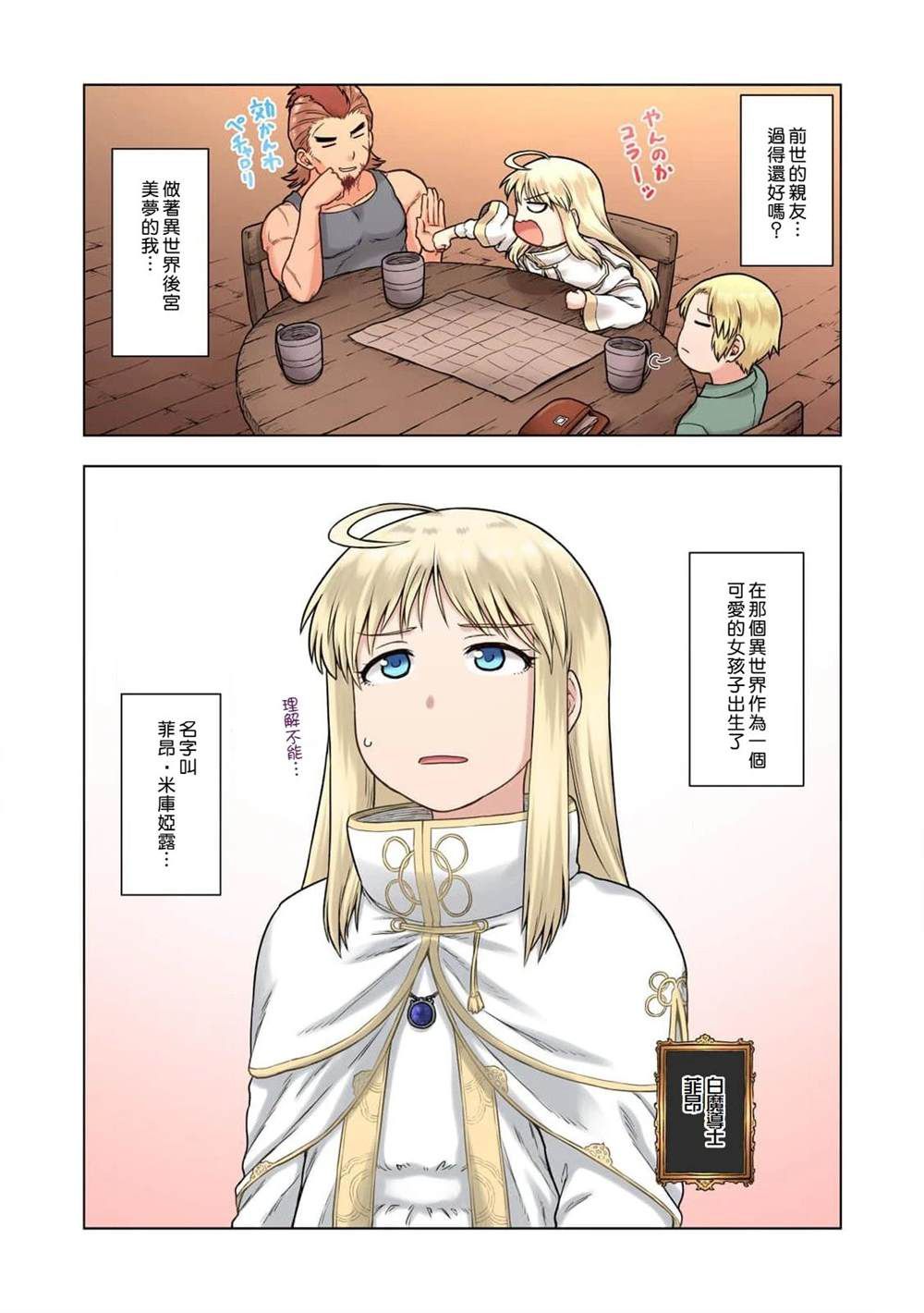 做著后宫美梦死掉的废宅,转生成了拯救世界的勇者中的一员。废宅作为女白魔道士菲昂转生,曾经梦想实现的后宫,在以勇者阿鲁特为中心的身边确实的存在著。菲昂转生后依旧喜欢著女孩,在魔王军的奇袭后队伍七零八散,与阿鲁特在废弃小屋避难作为转折点。之后二人的关系朝著意想不到的方向发……