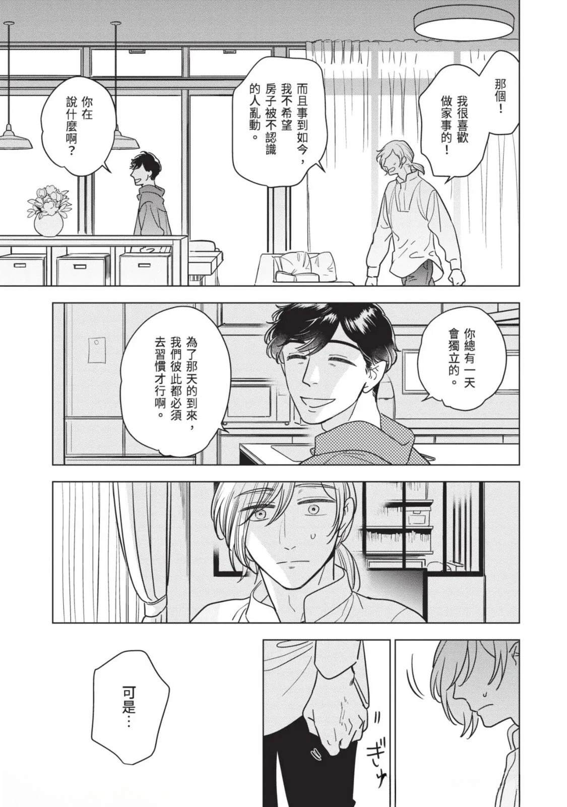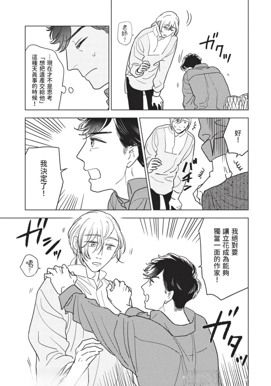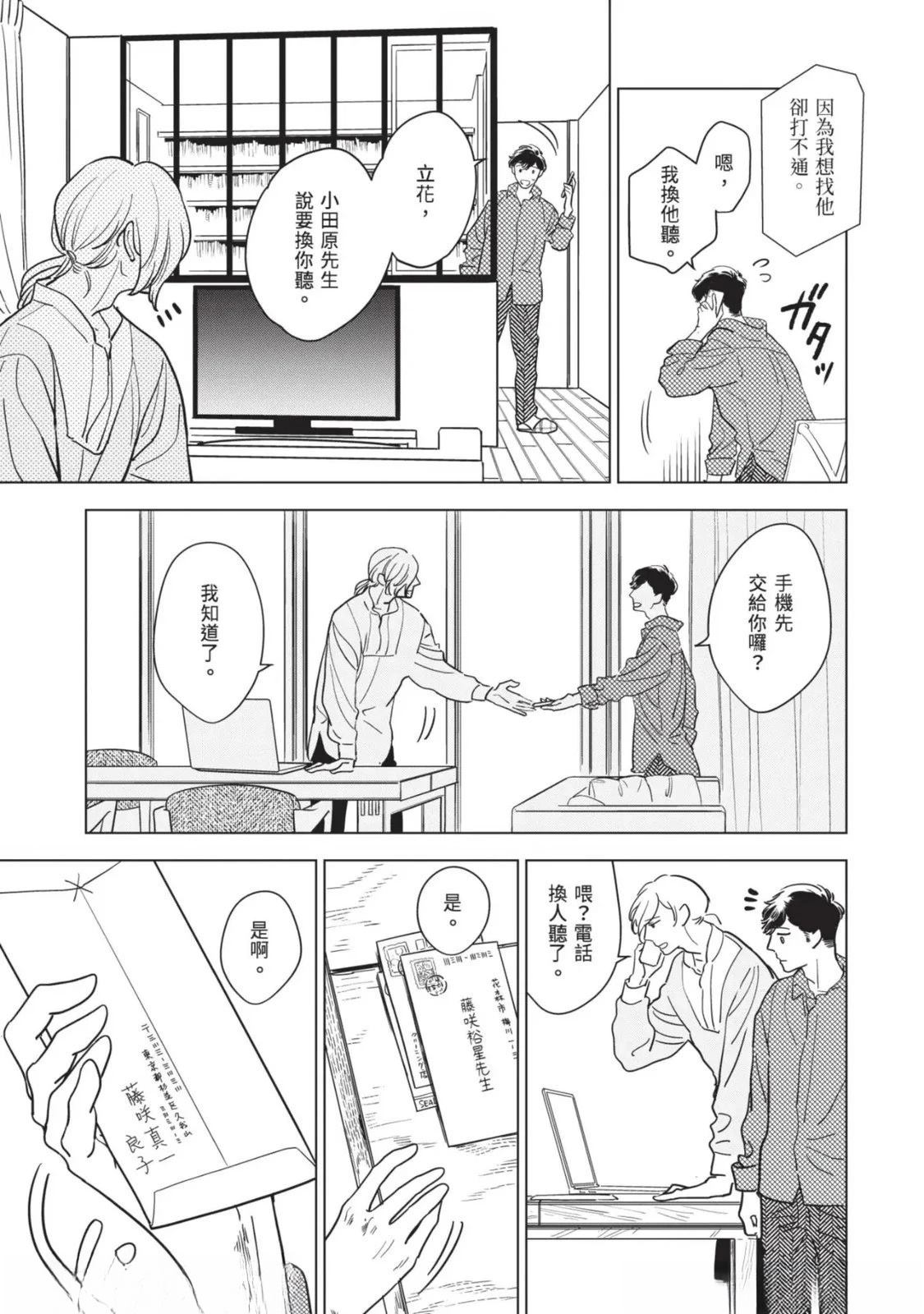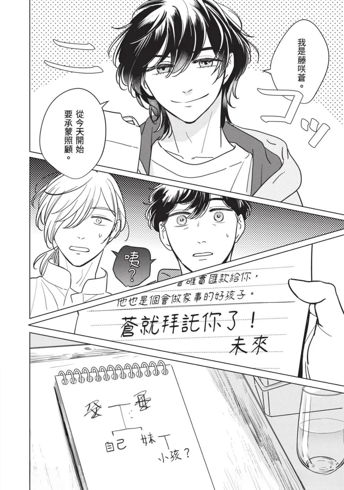 接收到去医院做详细检查的建议,绘本作家.藤咲在隐约对死亡感到不安的同时,得知助手立花参加的竞赛落选。私底下被立花吸引的藤咲为了立花的将来著想,便提议要改变生活型态。就在他们谈论的途中,他的外甥.苍突然造访,并告知藤咲的妹妹,也就是苍的母亲.未来将要去国外的消息。藤咲决定这期间要让苍住在家里,不过立花[]花却提出质疑,问他是否有办法和高中生单独两人生活。无法反驳的藤咲最后决定三人一起生活—[-折叠]