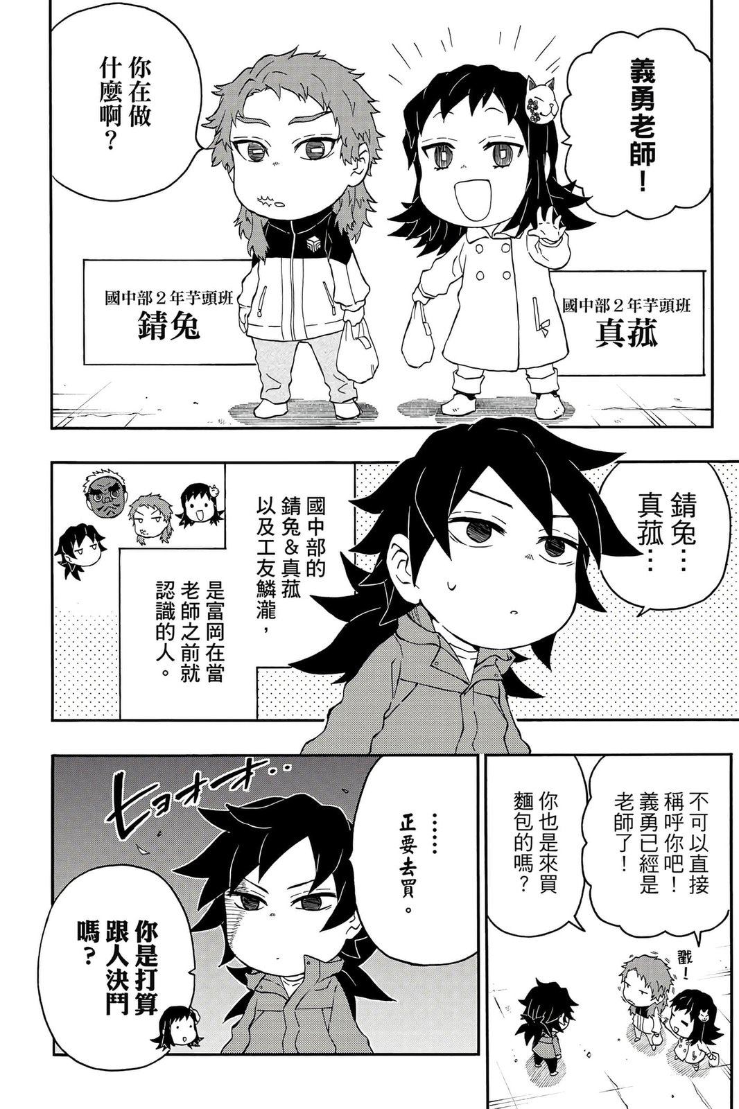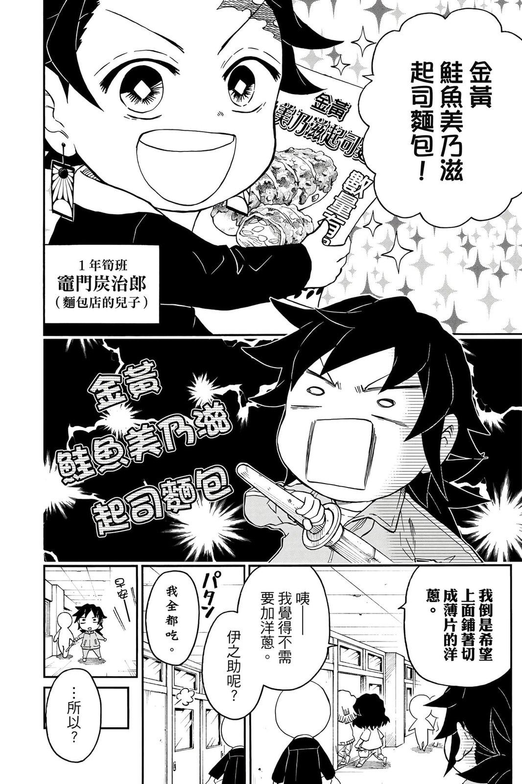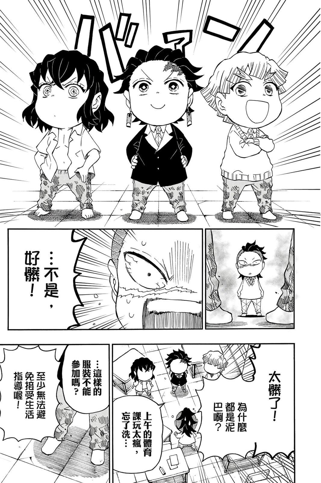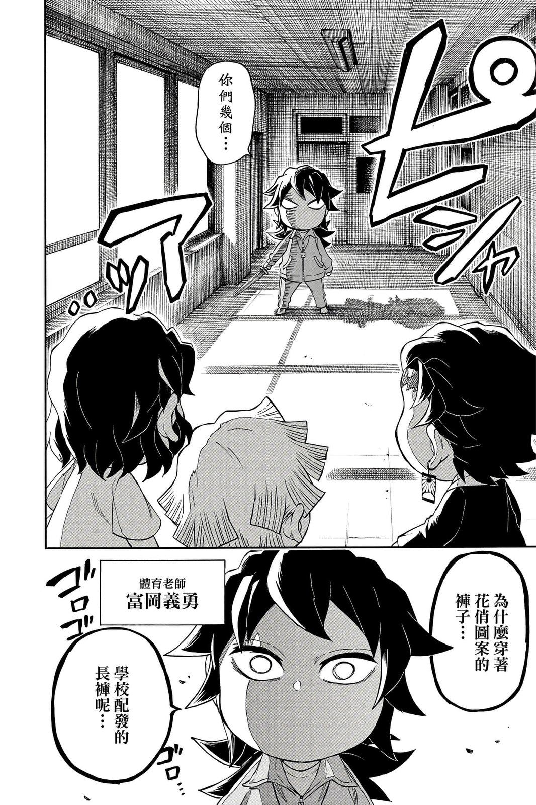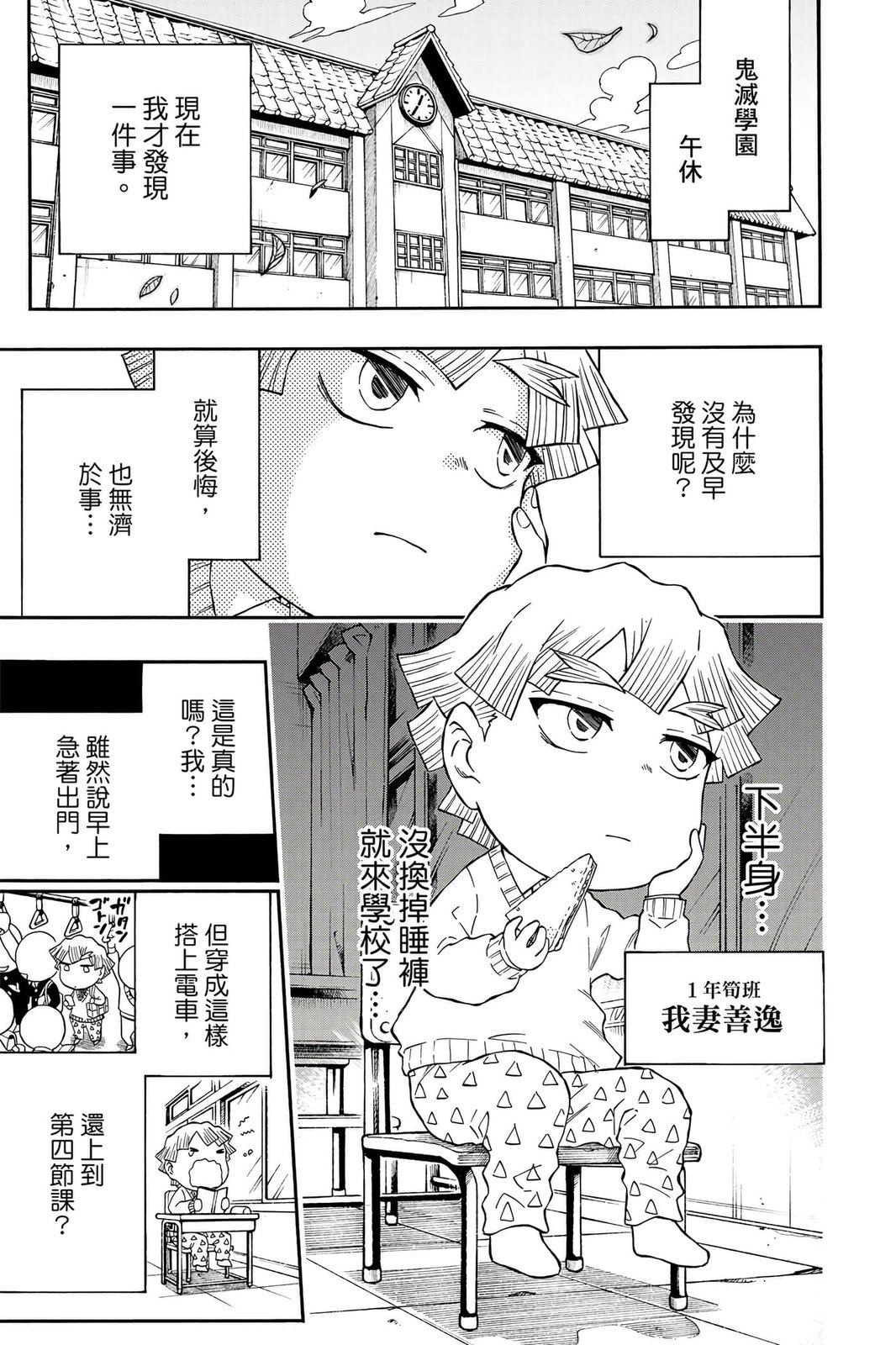 原本只是「鬼灭之刃」单行本里的附录,现在由帆上夏希老师操刀,让原本的角色成了老师跟学生。故事舞台是一所国小国中高中一贯的私立学校?鬼灭学园,一始就是炭治郎跟善逸都迟到,为了顺利进入由体育老师?富冈所看守的校门,惹出许多笑料。