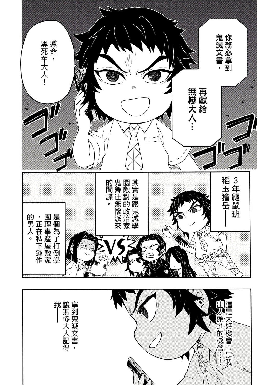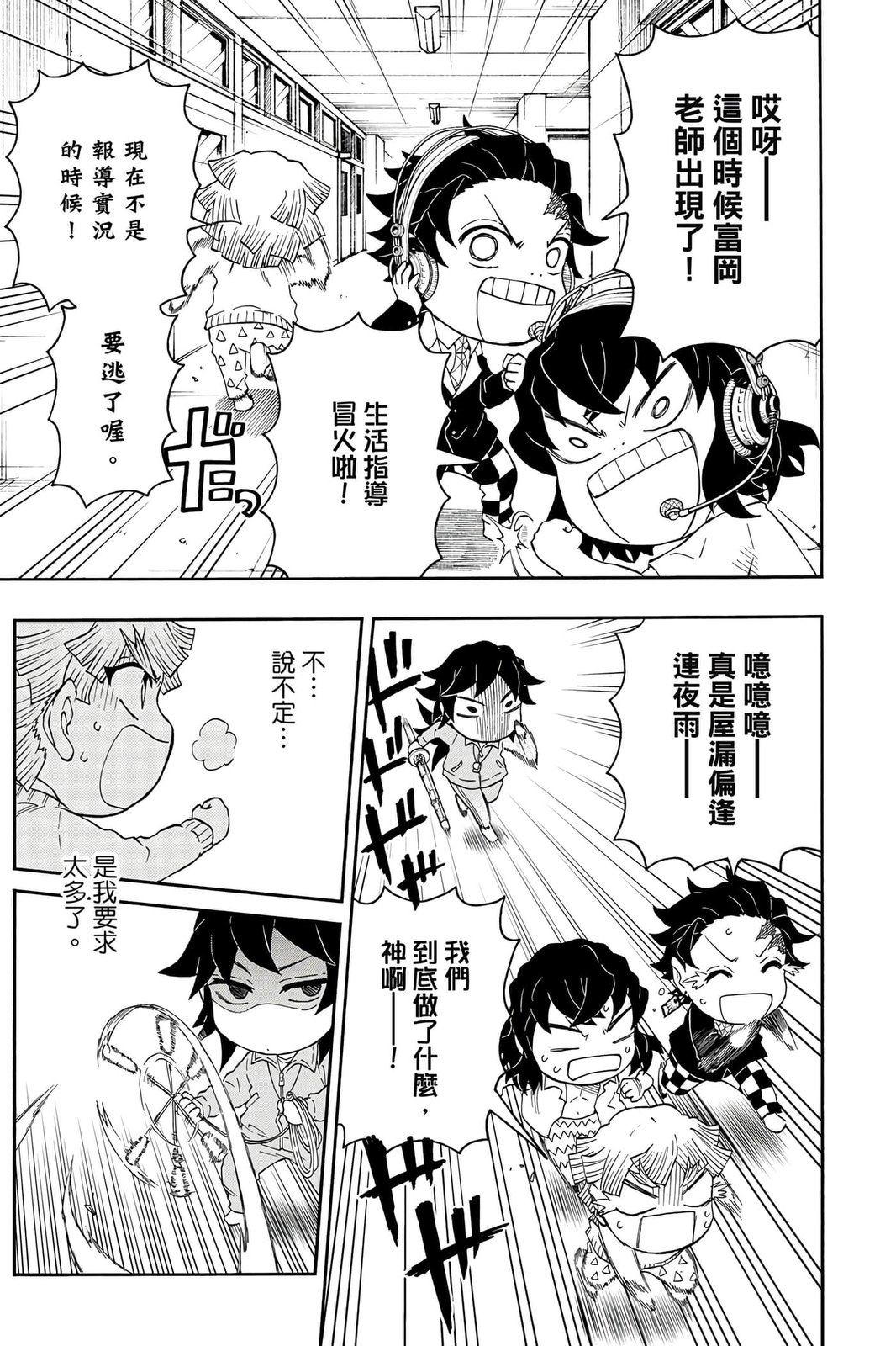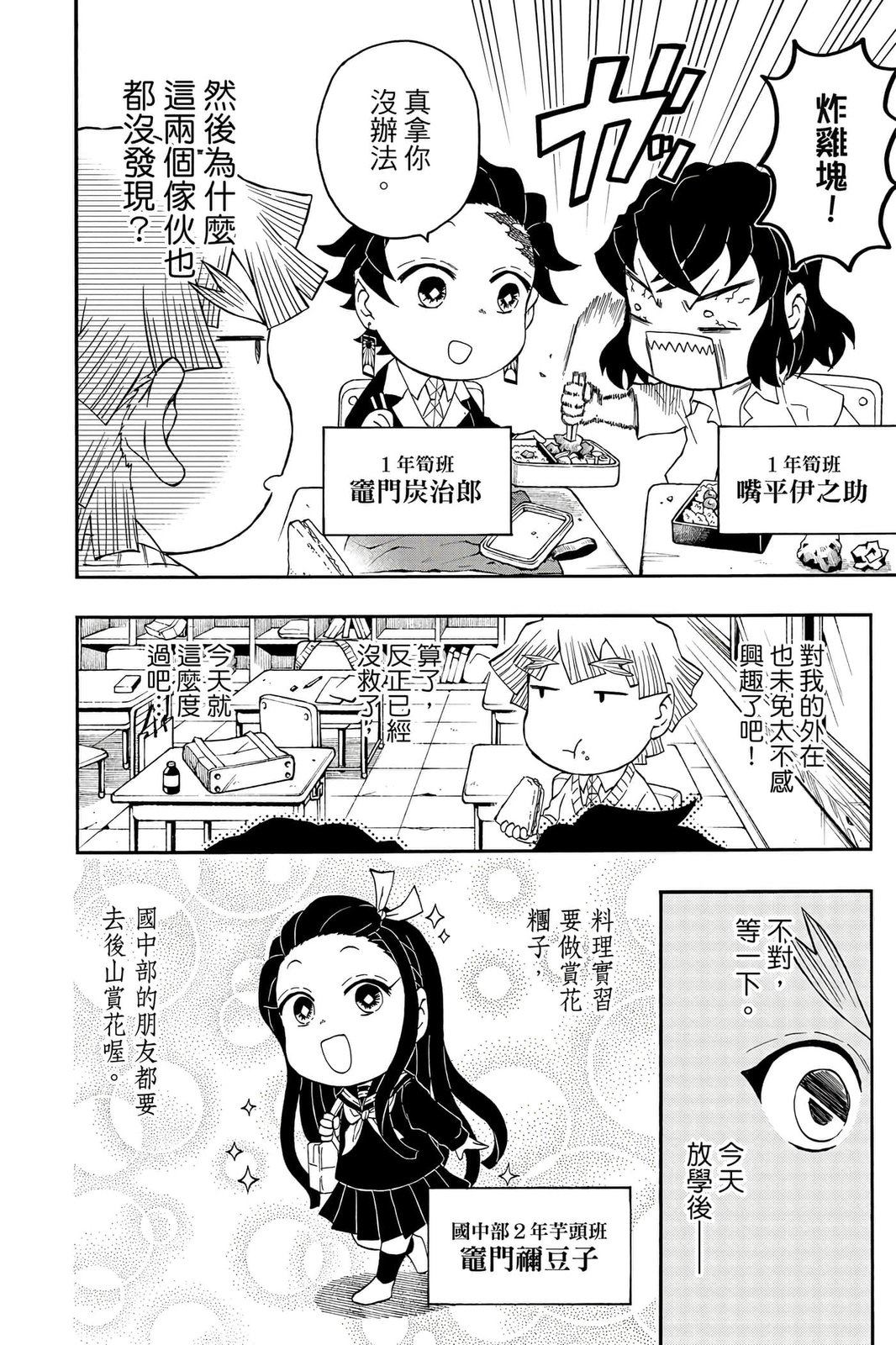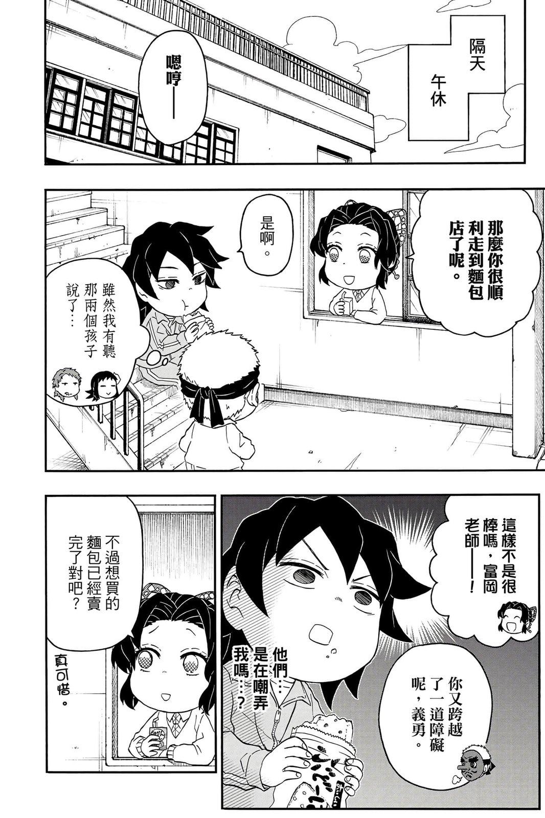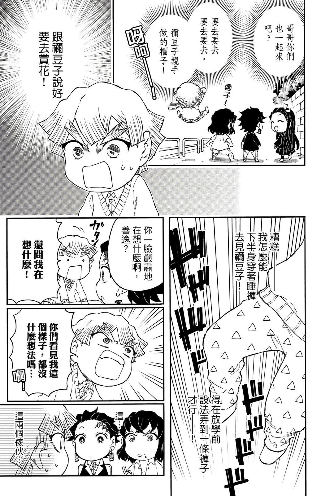 原本只是「鬼灭之刃」单行本里的附录,现在由帆上夏希老师操刀,让原本的角色成了老师跟学生。故事舞台是一所国小国中高中一贯的私立学校?鬼灭学园,一始就是炭治郎跟善逸都迟到,为了顺利进入由体育老师?富冈所看守的校门,惹出许多笑料。