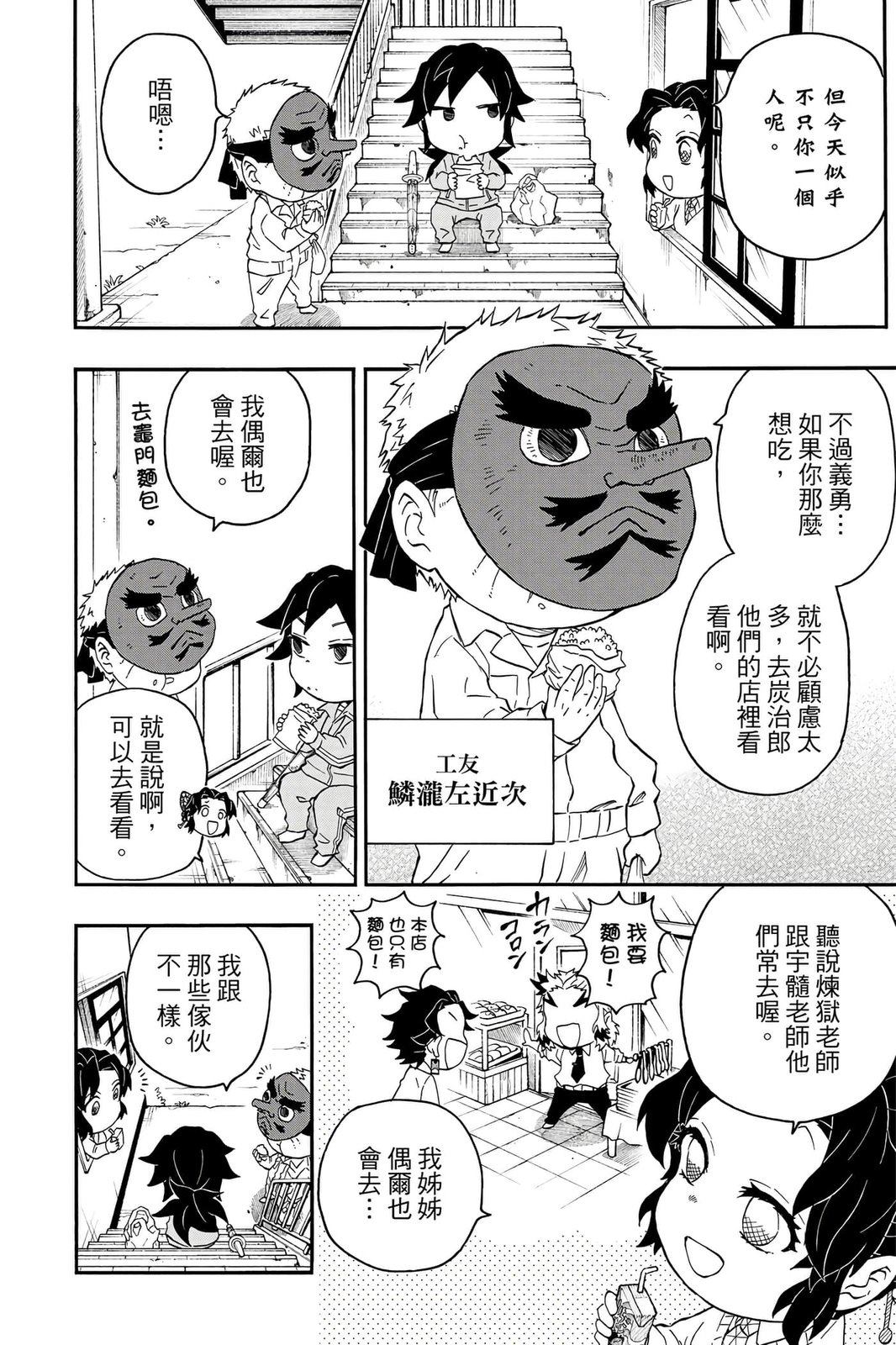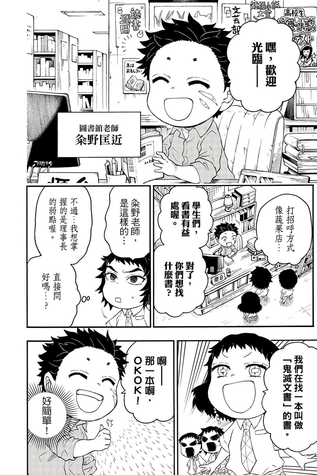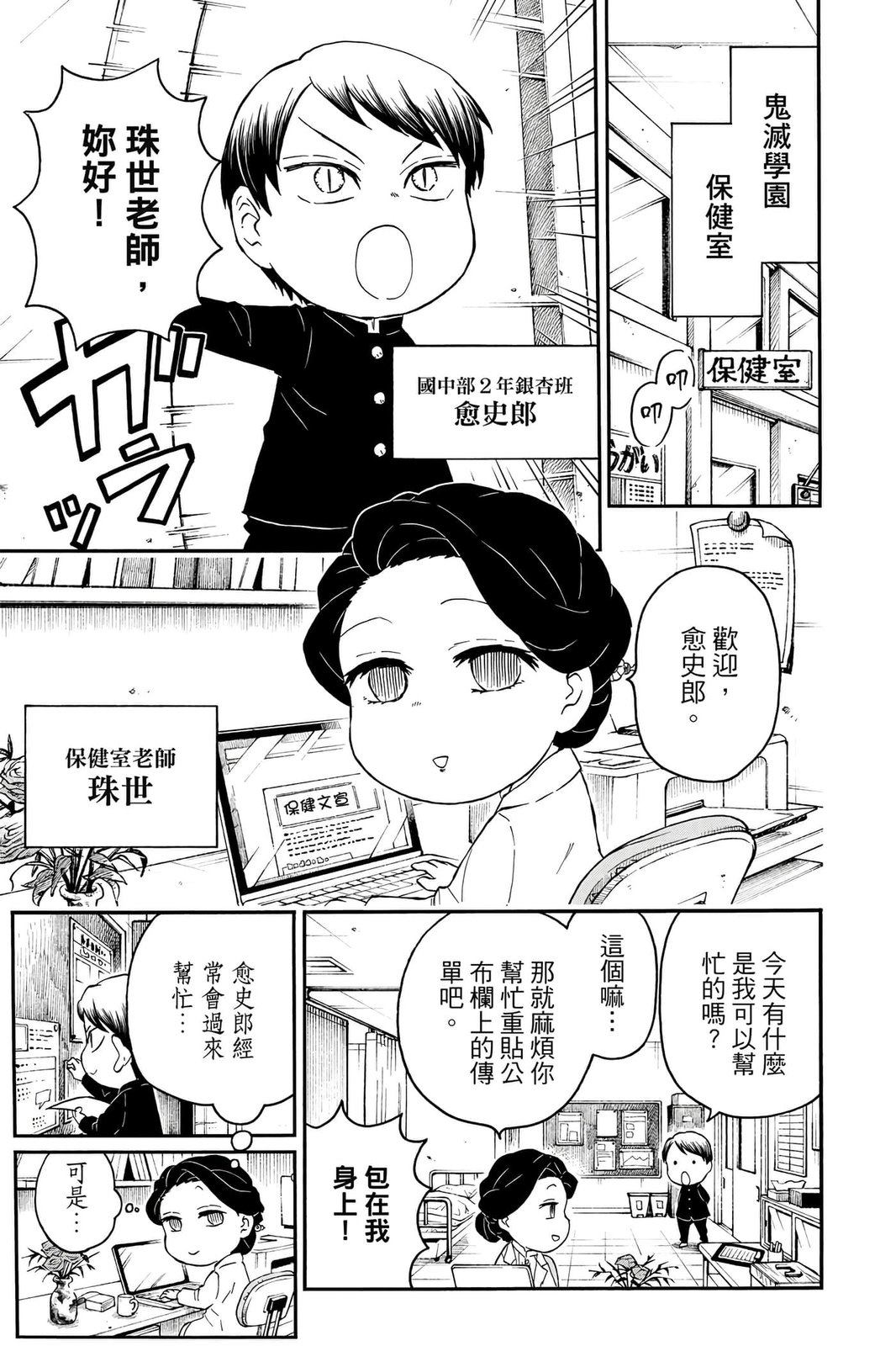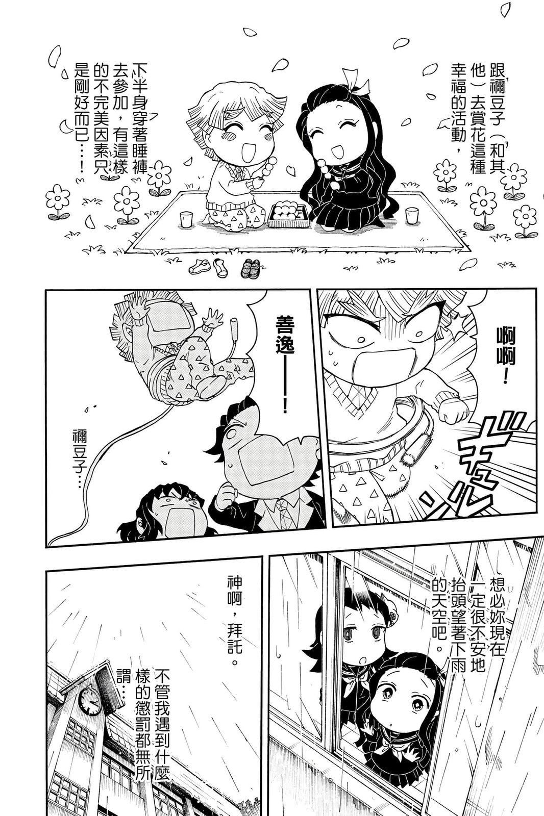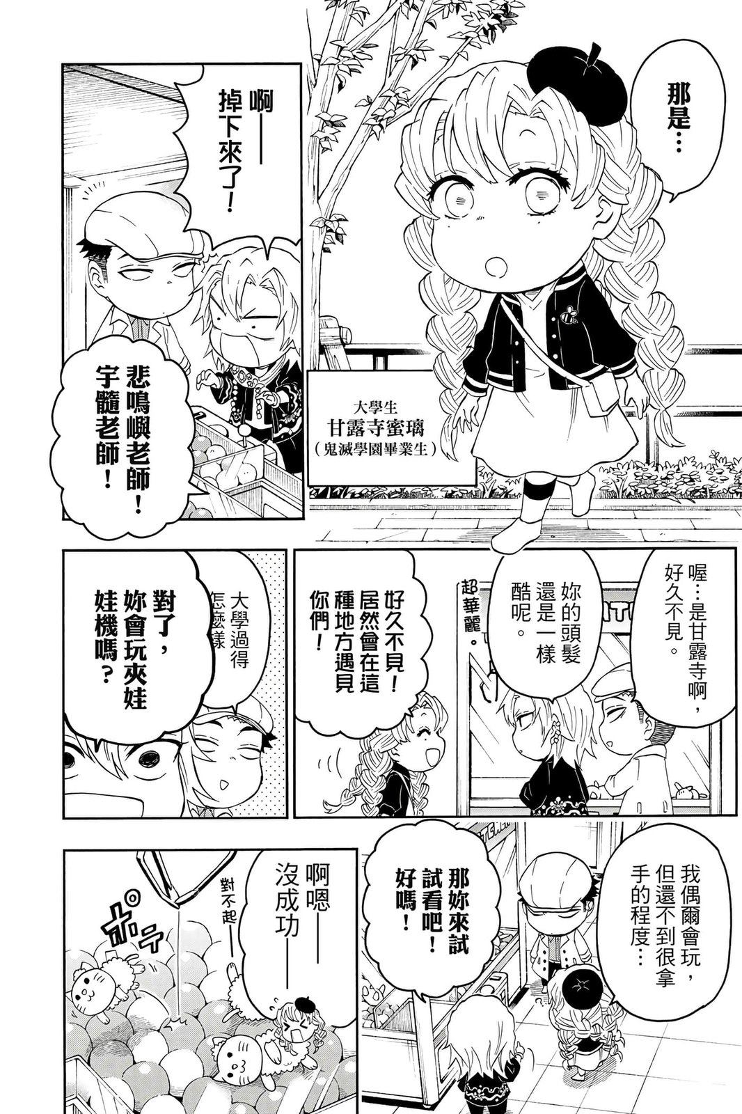 原本只是「鬼灭之刃」单行本里的附录,现在由帆上夏希老师操刀,让原本的角色成了老师跟学生。故事舞台是一所国小国中高中一贯的私立学校?鬼灭学园,一始就是炭治郎跟善逸都迟到,为了顺利进入由体育老师?富冈所看守的校门,惹出许多笑料。