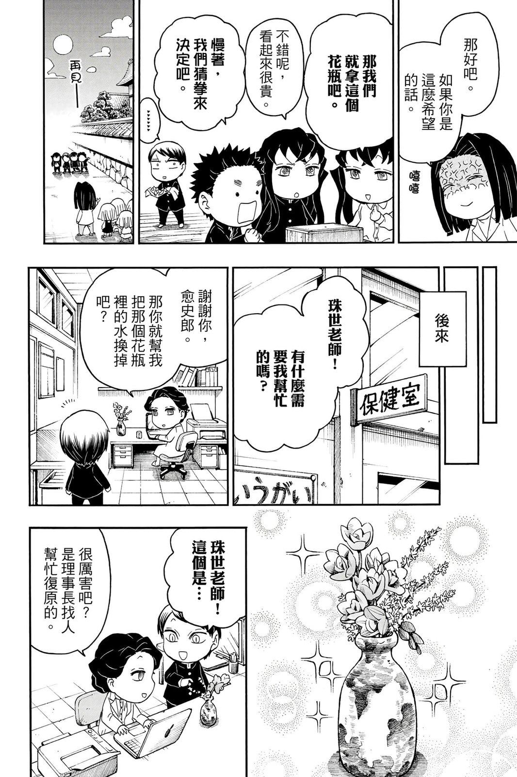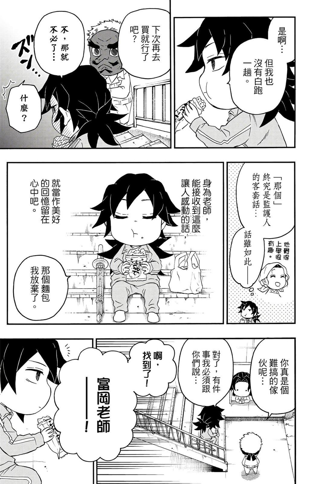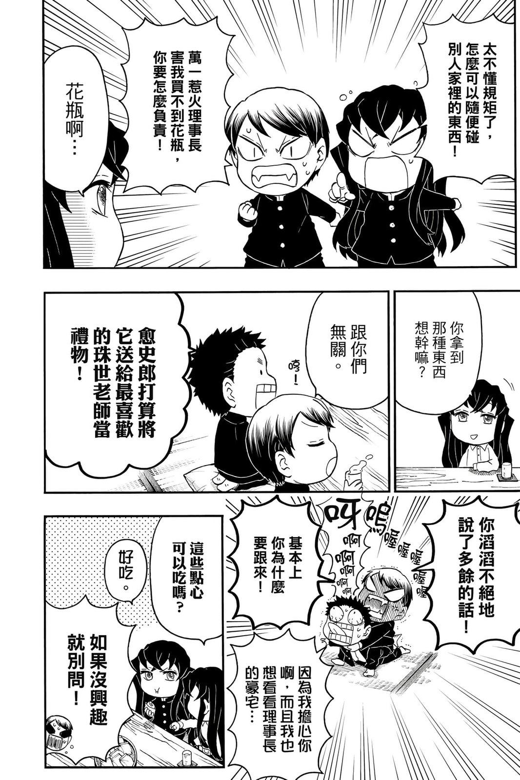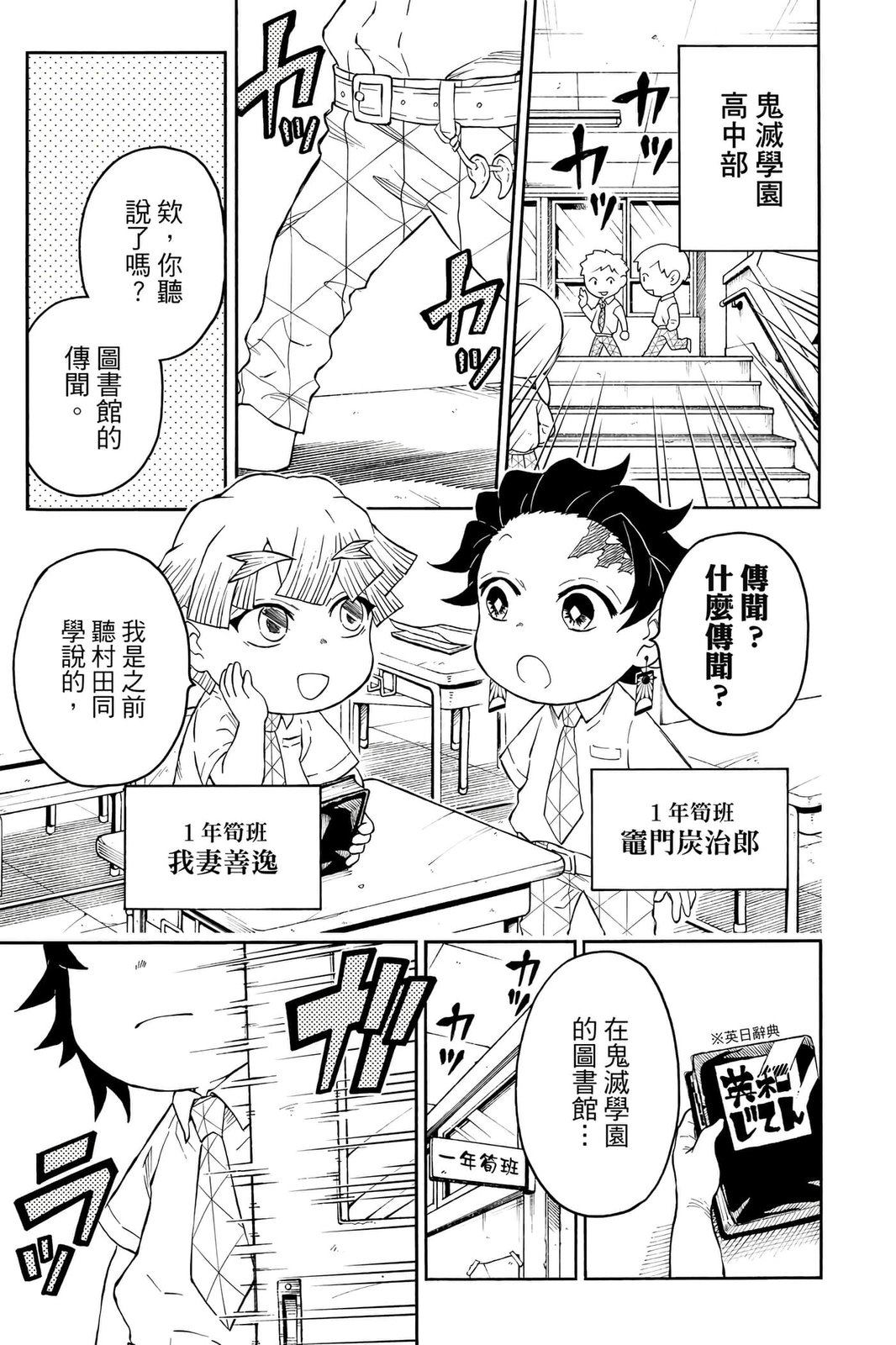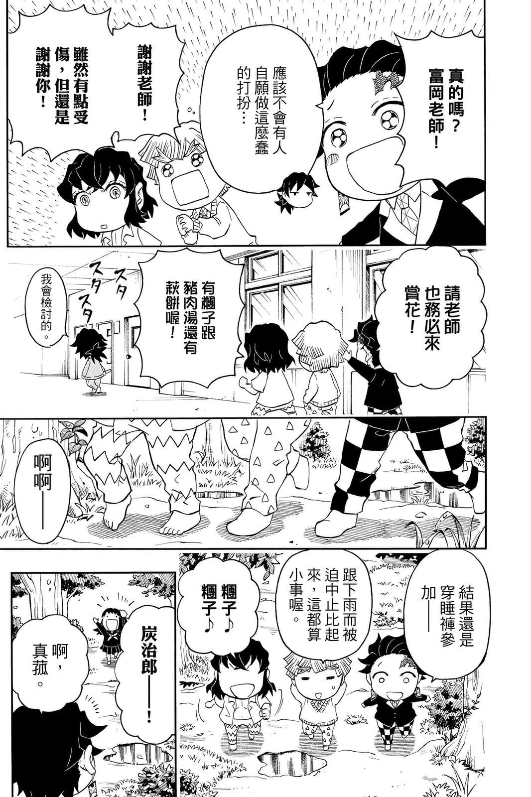 原本只是「鬼灭之刃」单行本里的附录,现在由帆上夏希老师操刀,让原本的角色成了老师跟学生。故事舞台是一所国小国中高中一贯的私立学校?鬼灭学园,一始就是炭治郎跟善逸都迟到,为了顺利进入由体育老师?富冈所看守的校门,惹出许多笑料。