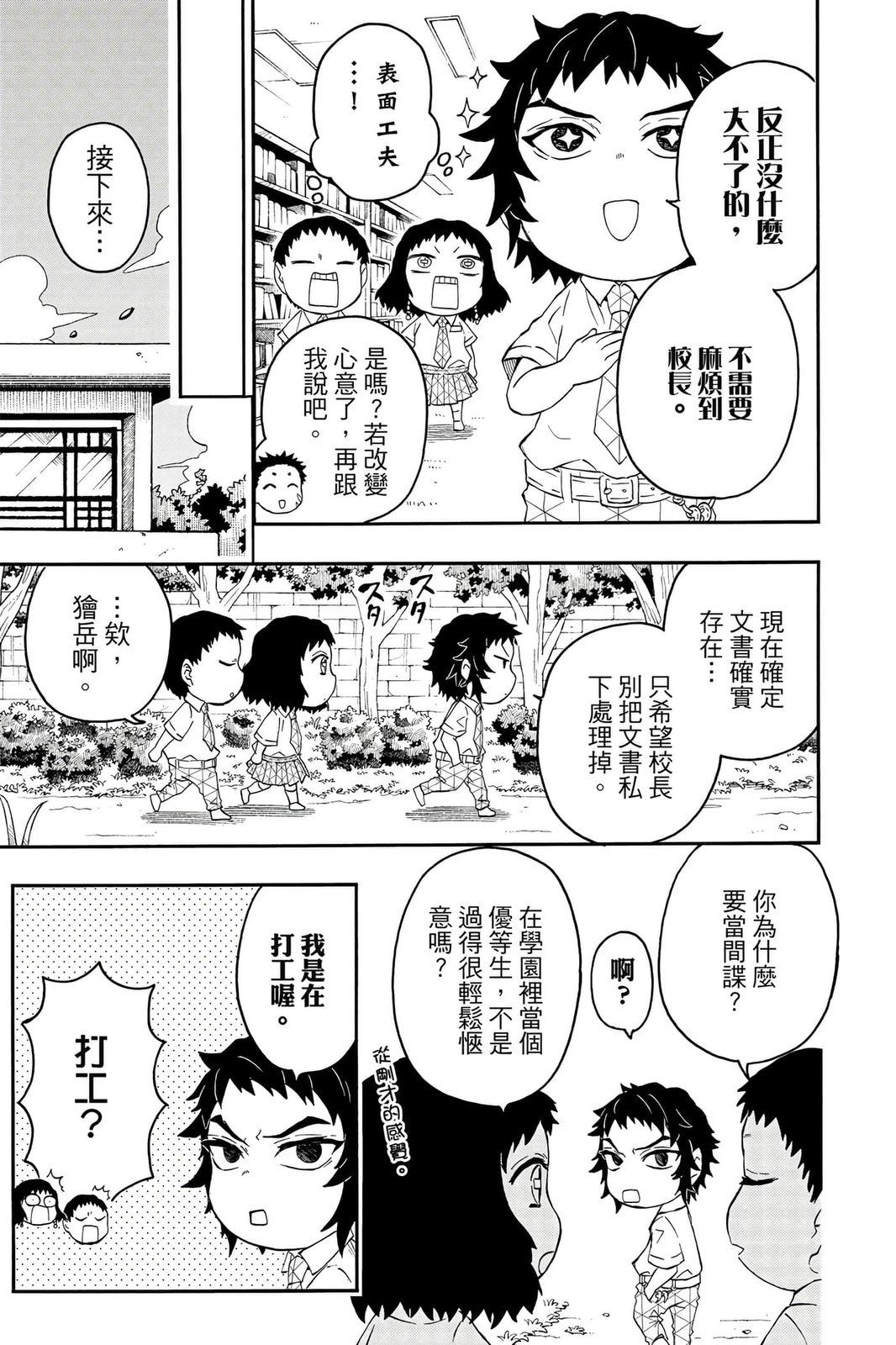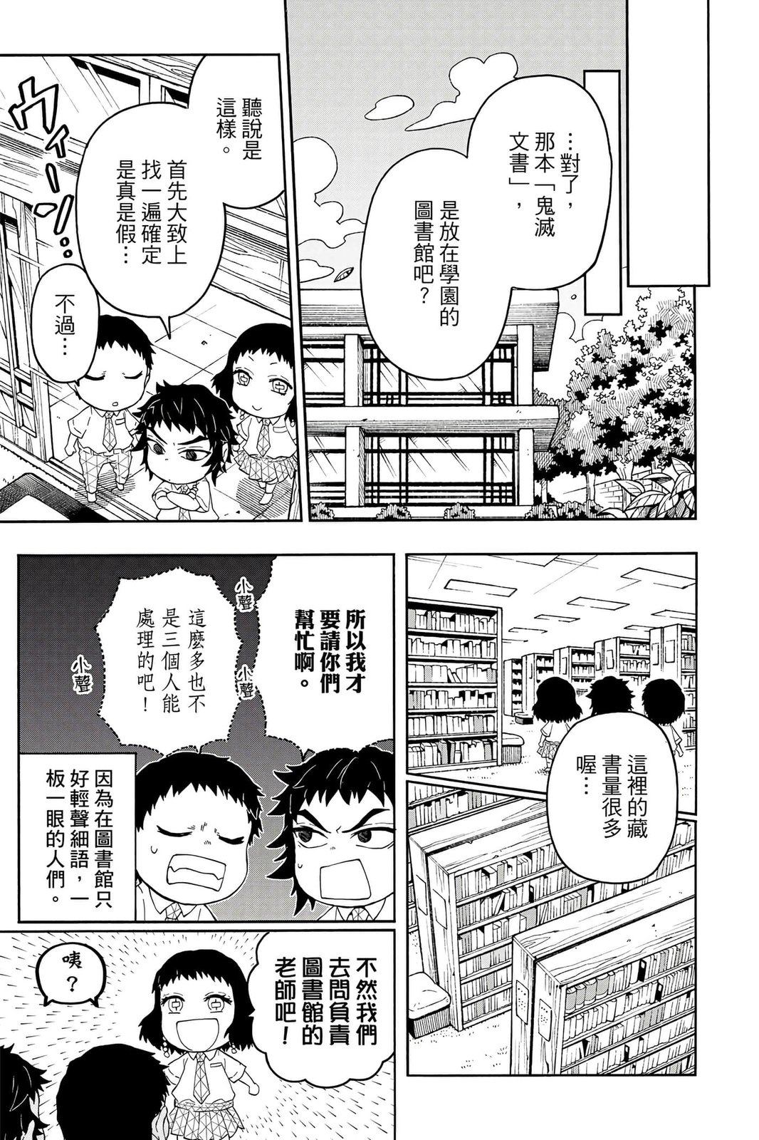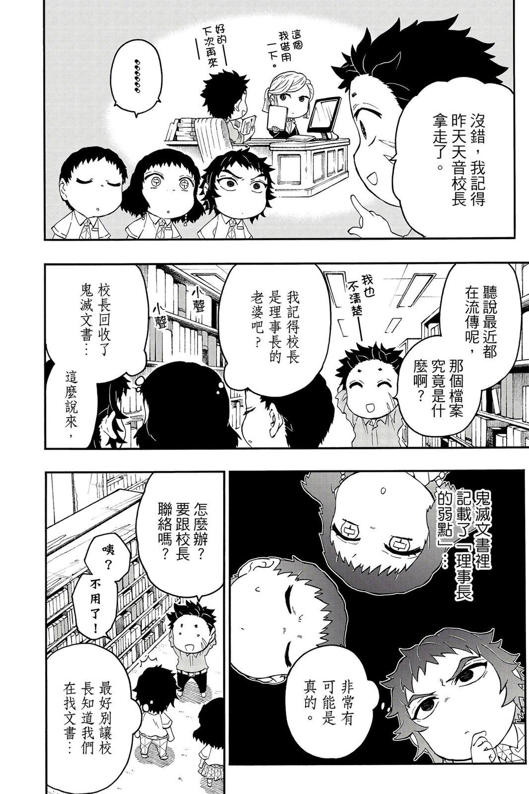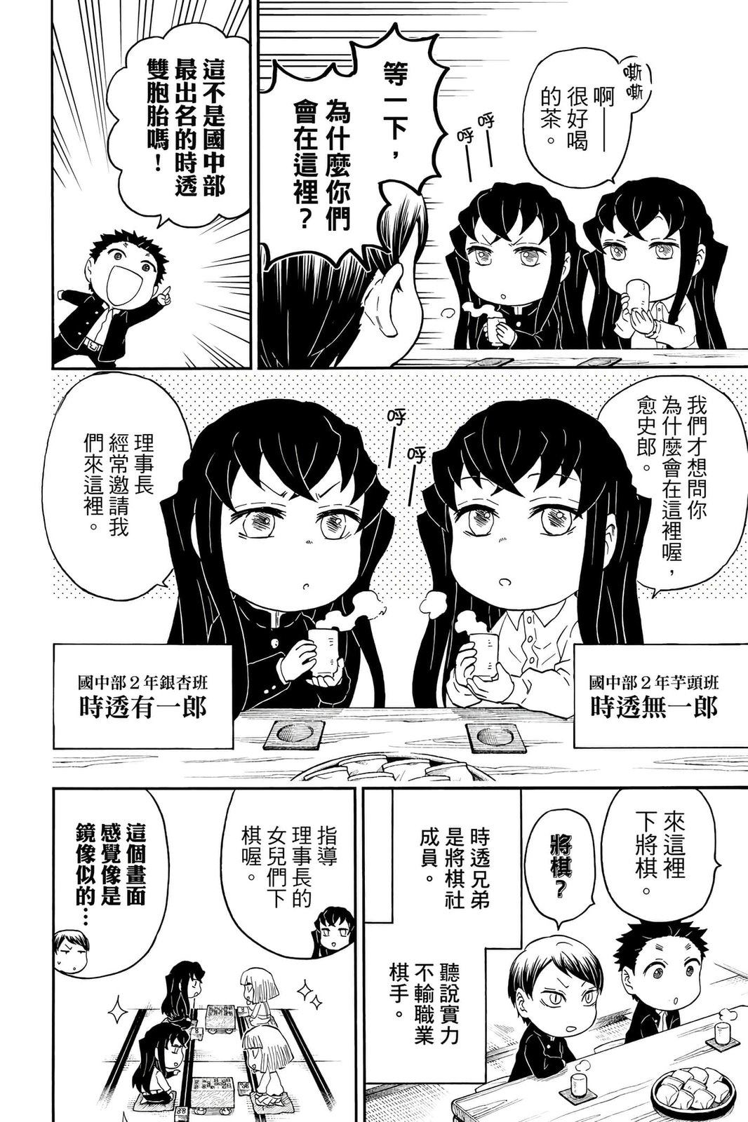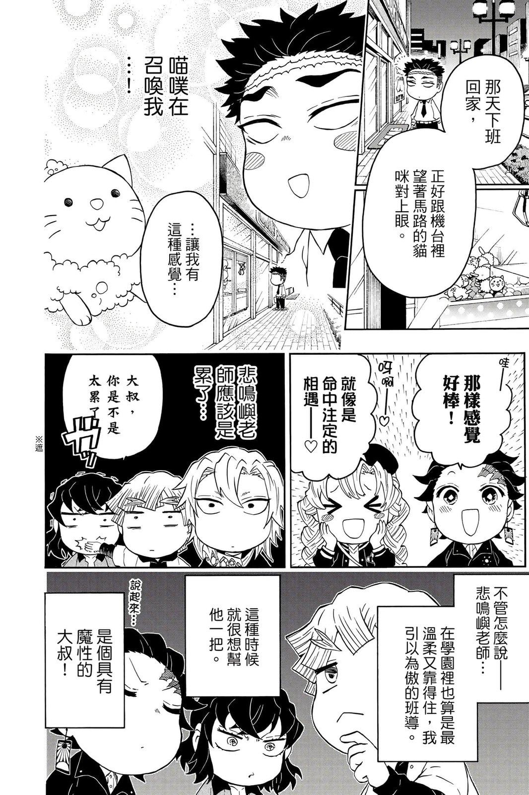 原本只是「鬼灭之刃」单行本里的附录,现在由帆上夏希老师操刀,让原本的角色成了老师跟学生。故事舞台是一所国小国中高中一贯的私立学校?鬼灭学园,一始就是炭治郎跟善逸都迟到,为了顺利进入由体育老师?富冈所看守的校门,惹出许多笑料。