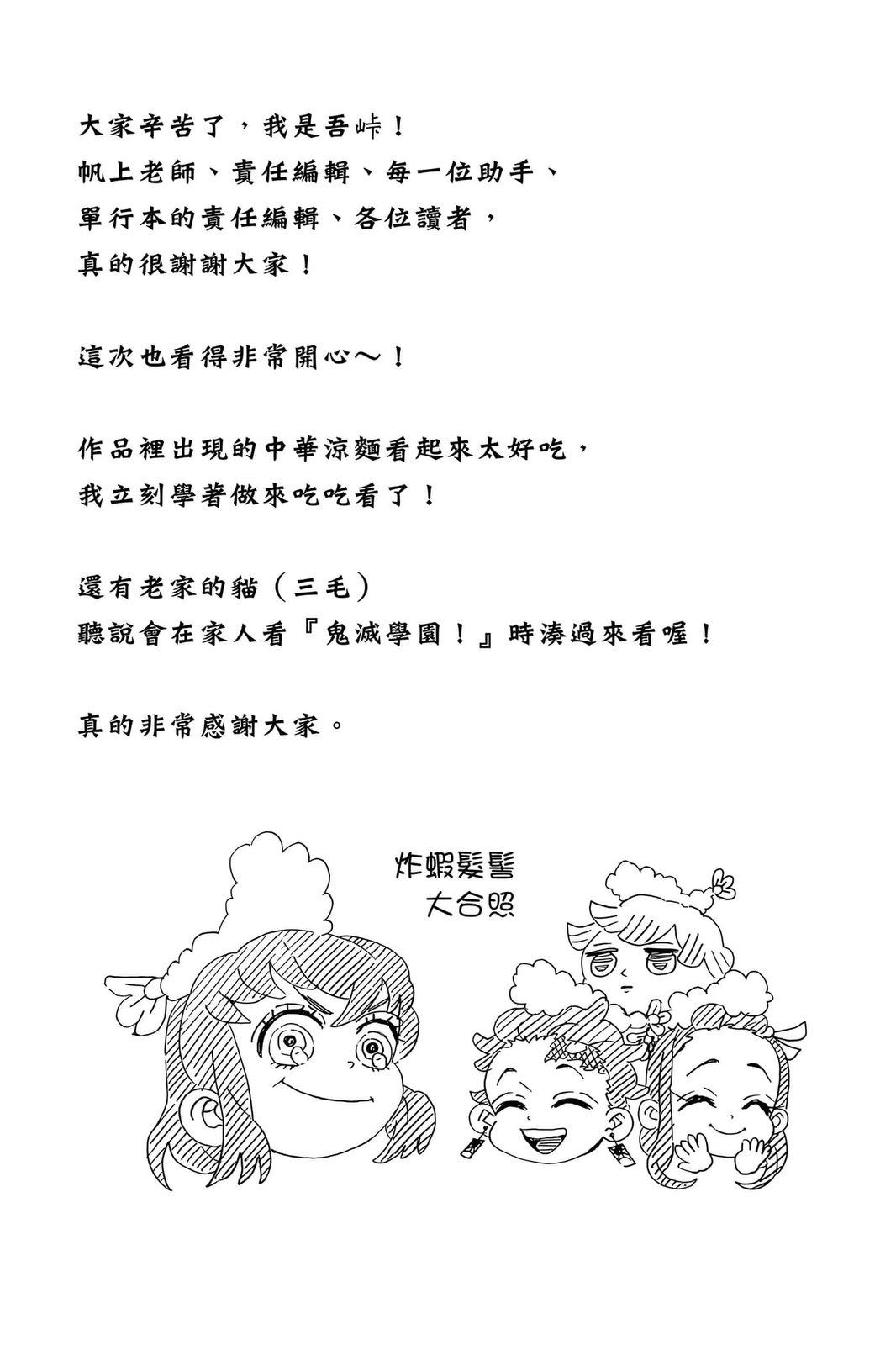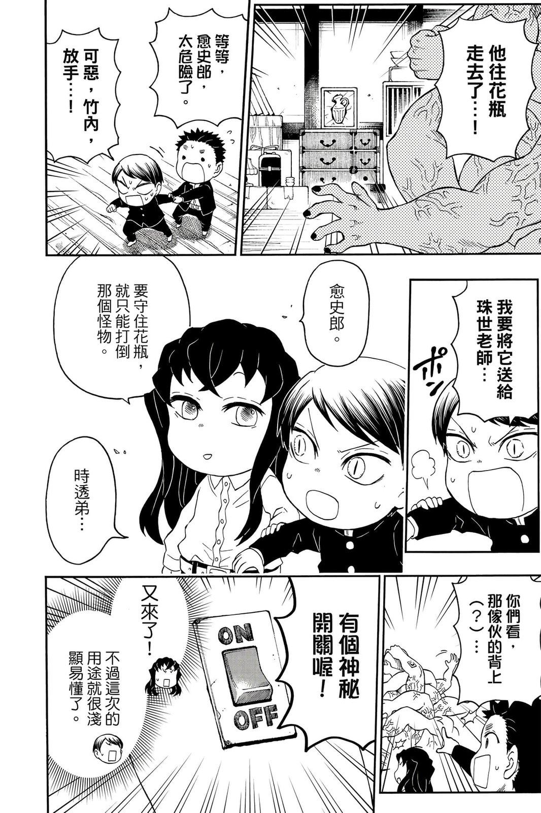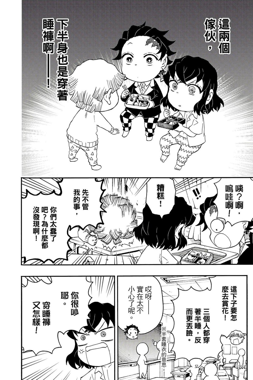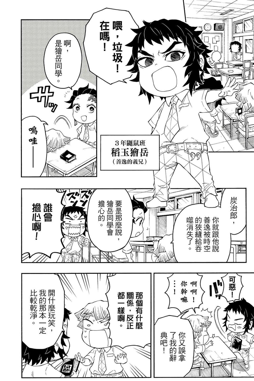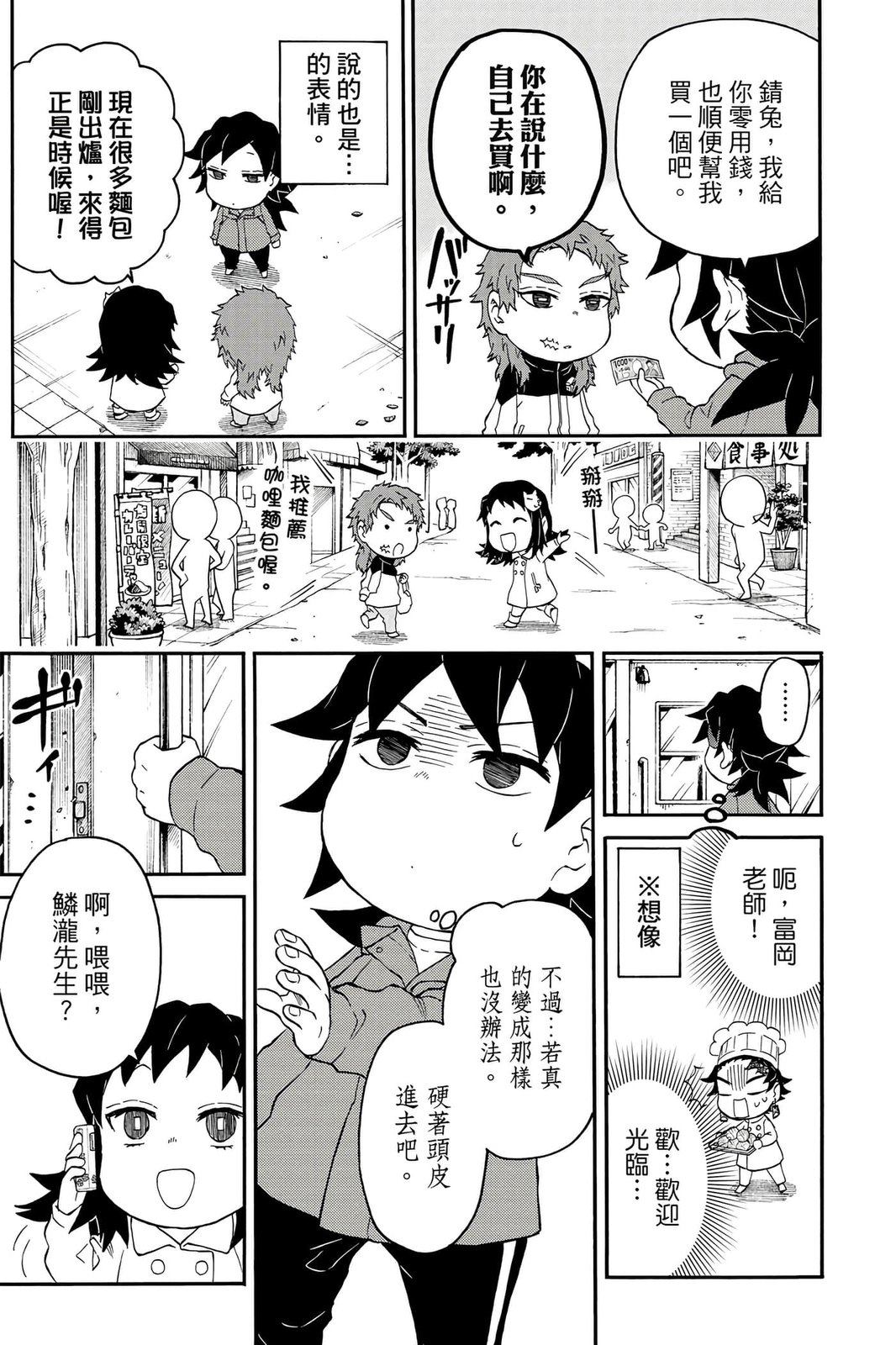 原本只是「鬼灭之刃」单行本里的附录,现在由帆上夏希老师操刀,让原本的角色成了老师跟学生。故事舞台是一所国小国中高中一贯的私立学校?鬼灭学园,一始就是炭治郎跟善逸都迟到,为了顺利进入由体育老师?富冈所看守的校门,惹出许多笑料。