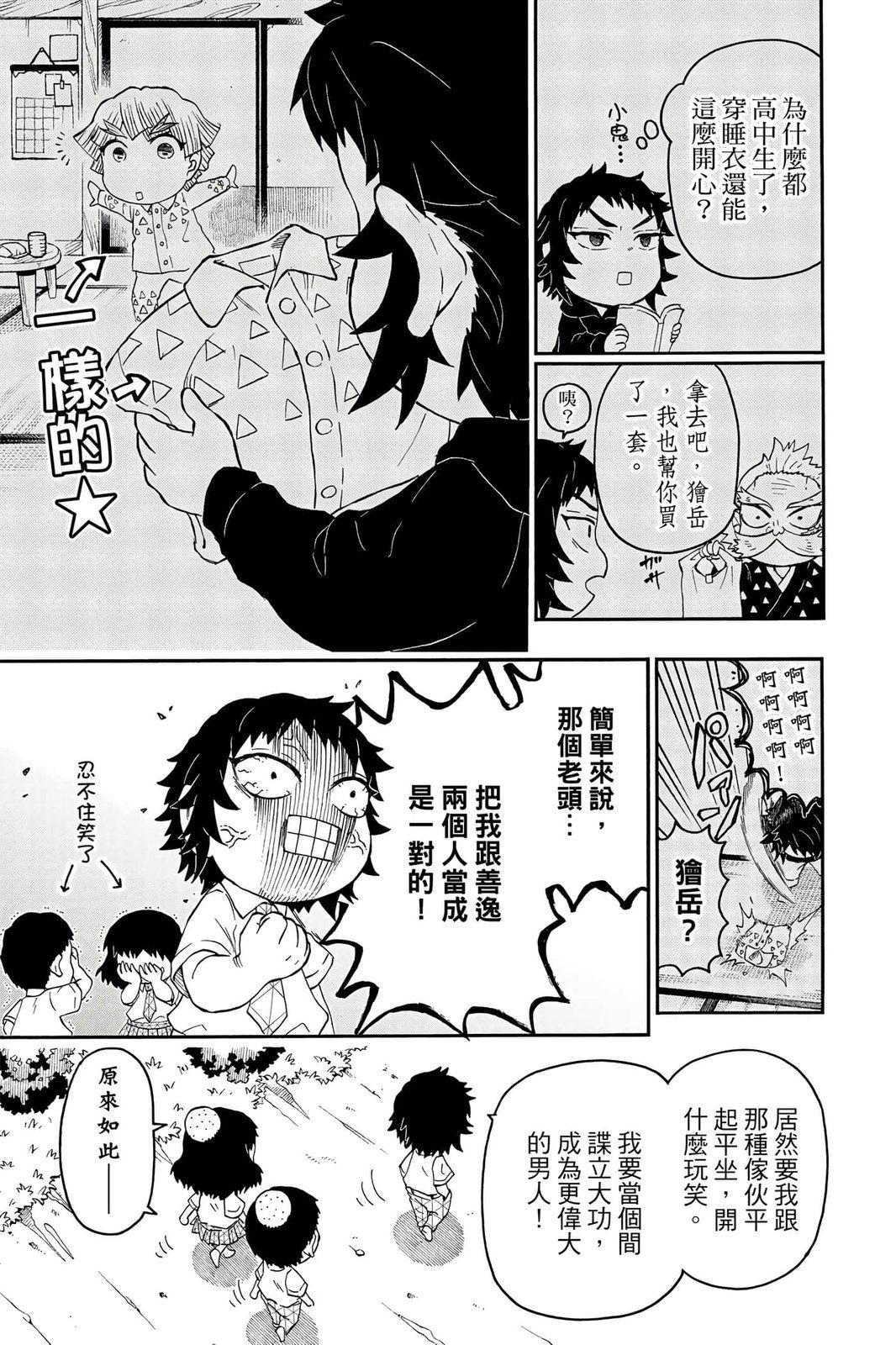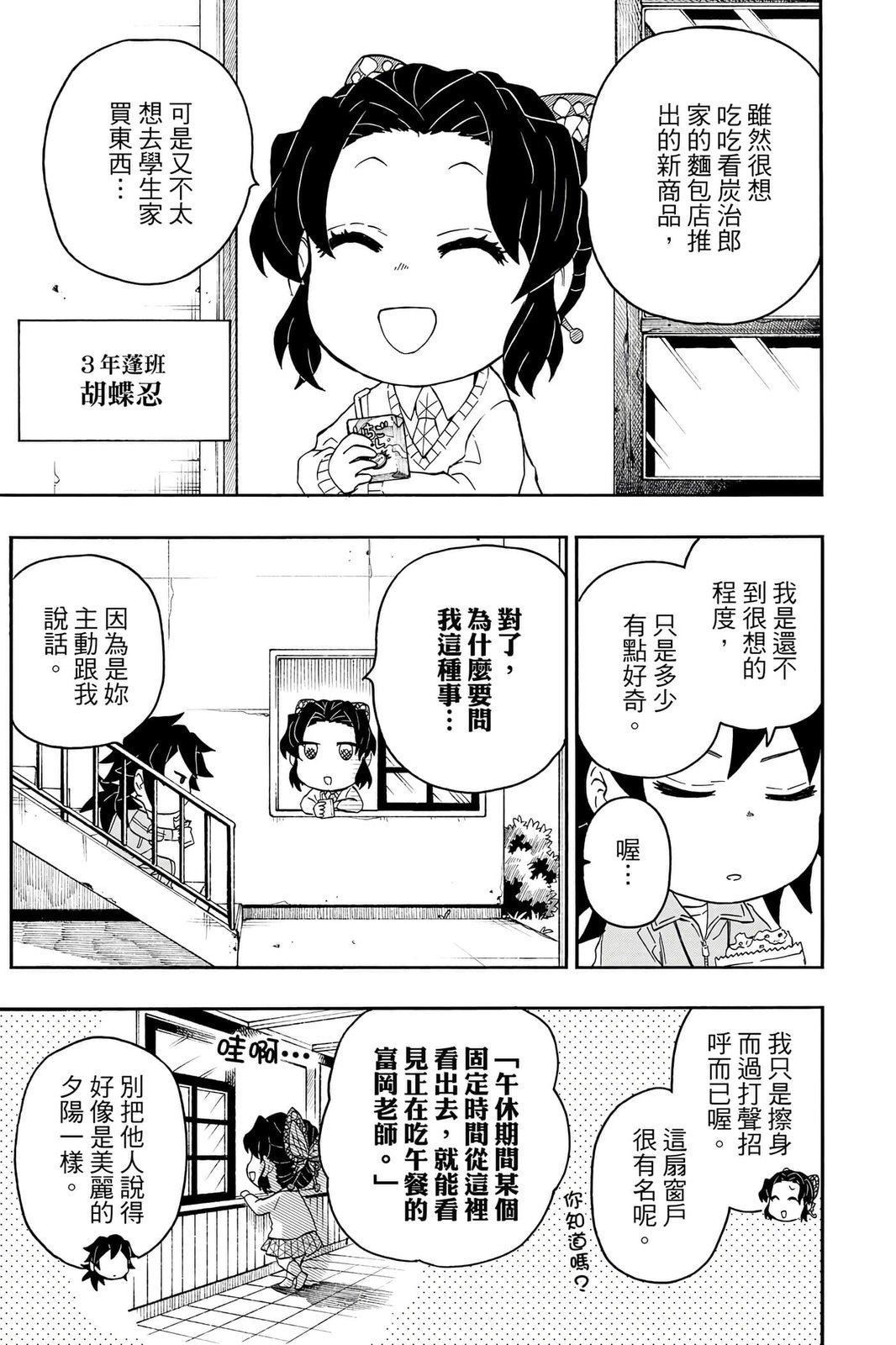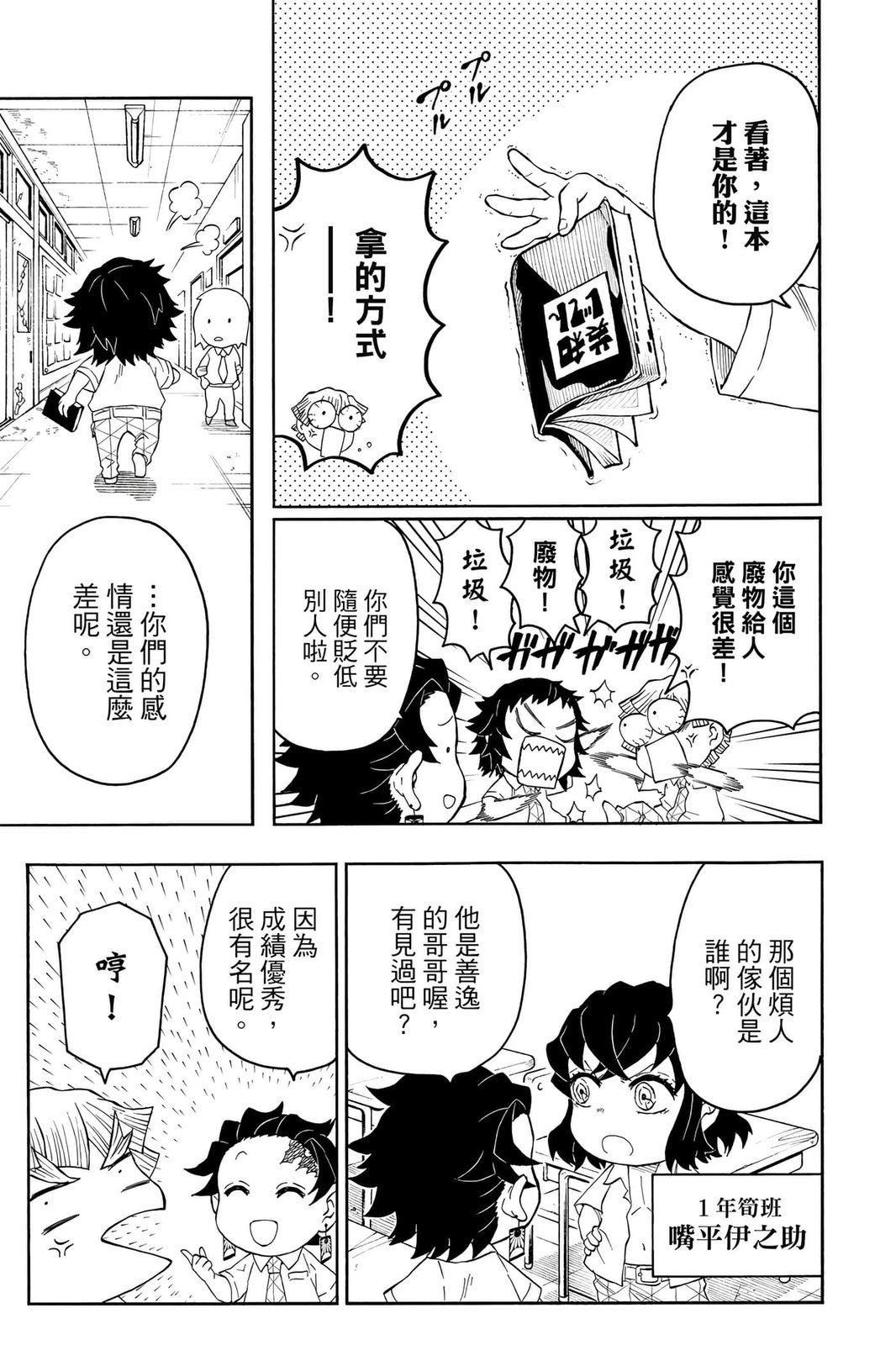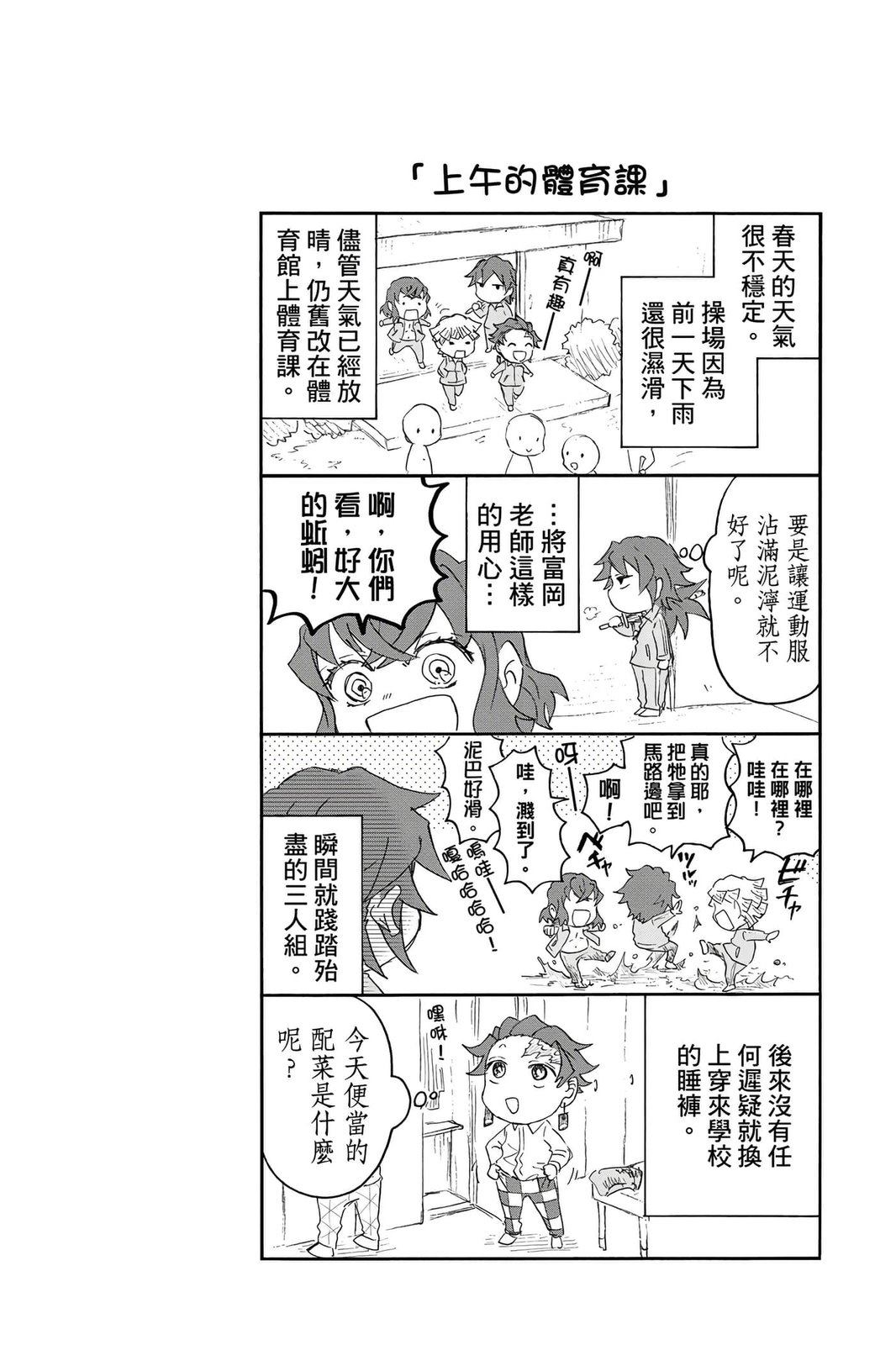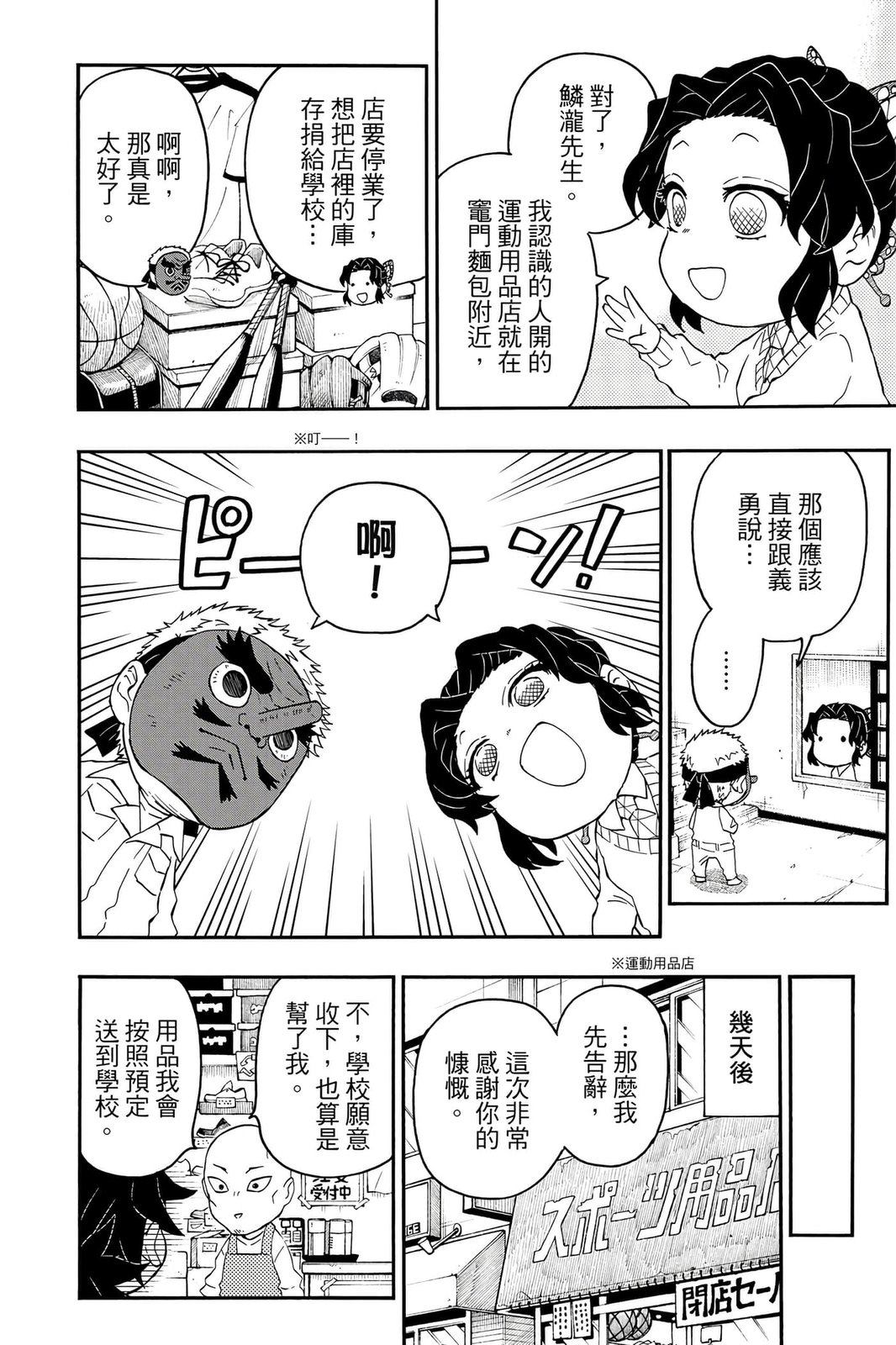 原本只是「鬼灭之刃」单行本里的附录,现在由帆上夏希老师操刀,让原本的角色成了老师跟学生。故事舞台是一所国小国中高中一贯的私立学校?鬼灭学园,一始就是炭治郎跟善逸都迟到,为了顺利进入由体育老师?富冈所看守的校门,惹出许多笑料。