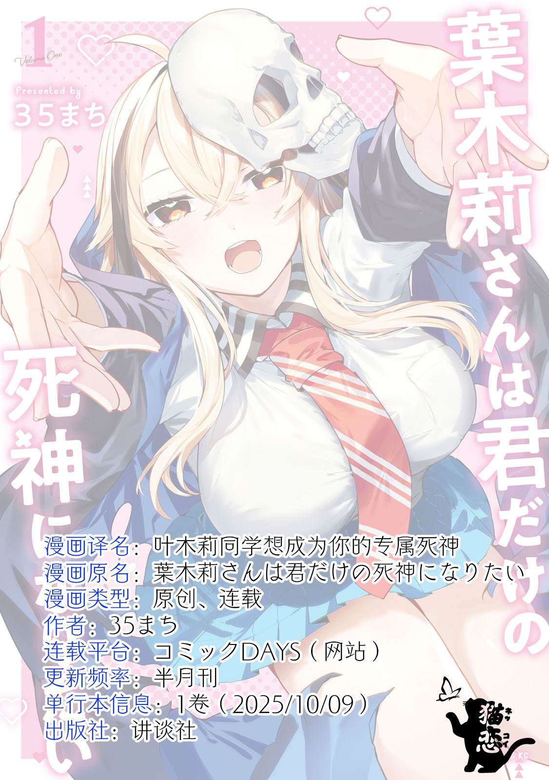 极其普通的高中生二上是个连恋爱都懒得谈、更别说结婚的钢铁直男。某天他推玄关大门,竟撞见头戴骸骨面具、手持巨型镰刀的THE·死神赫然降临!这位死神少女名为叶木莉,宣称从死神界专程前来收割二上的性命——而他的死因竟是人类史上首例“结婚致死“!!面对坚称单身主义的二上,叶木莉竟表示愿意亲自成为他的新娘.[]...!?惊世骇俗的结婚即死恋爱喜剧幕![-折叠]