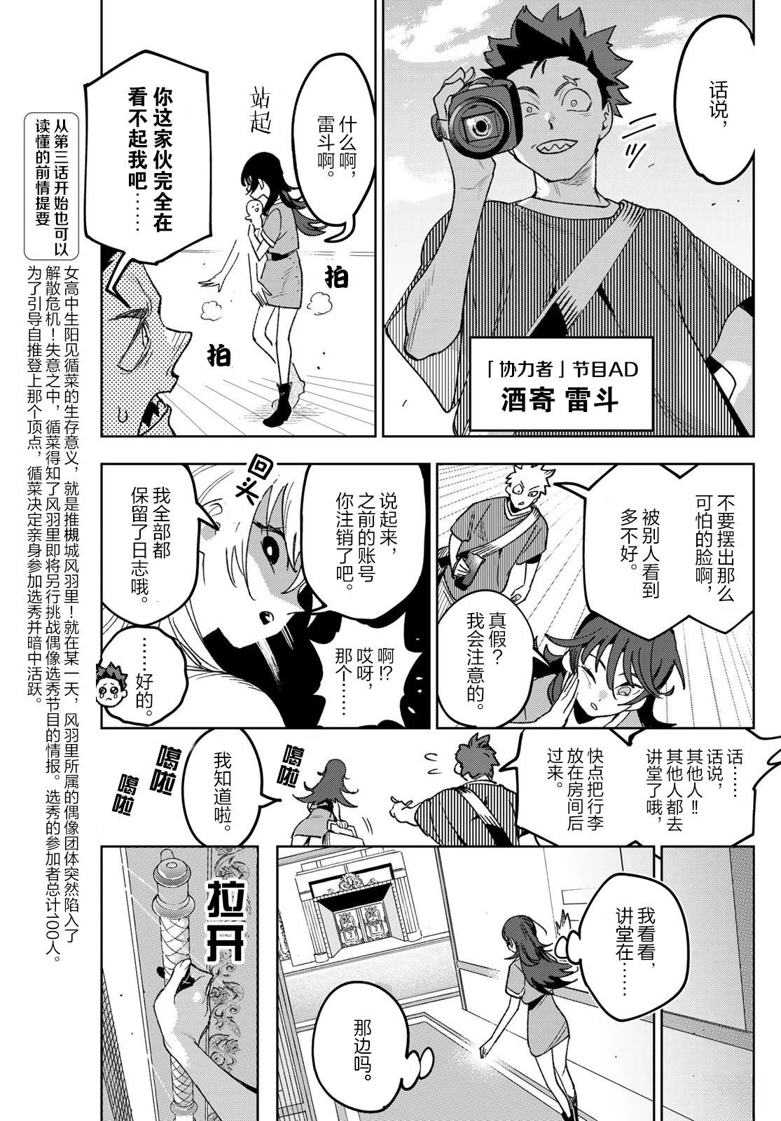 女高中生阳见循菜的人生意义全在于支持偶像槻城风羽里,然而某天风羽里所属的偶像团体突然宣布解散。就在失意之际,循菜得知风羽里将参加一档全新的偶像选秀节目。为了让推的偶像登上巅峰,循菜决定亲自报名参赛,在暗处行动......